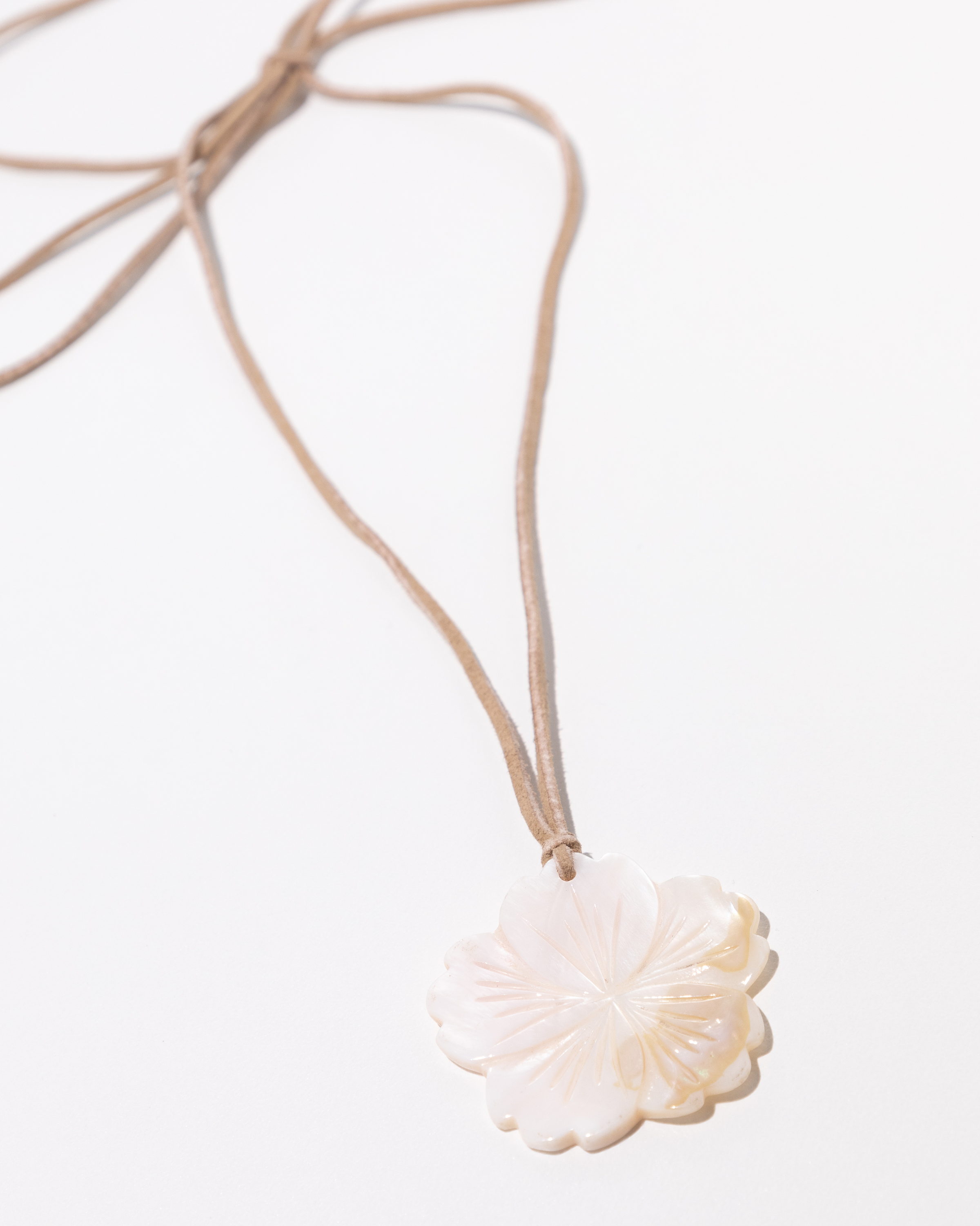 The Shell Flower Pendant Necklace features a delicately carved flower crafted from lustrous shell, offering a subtle natural sheen. Its neutral tones and elegant design create a versatile accessory that pairs effortlessly with any outfit.