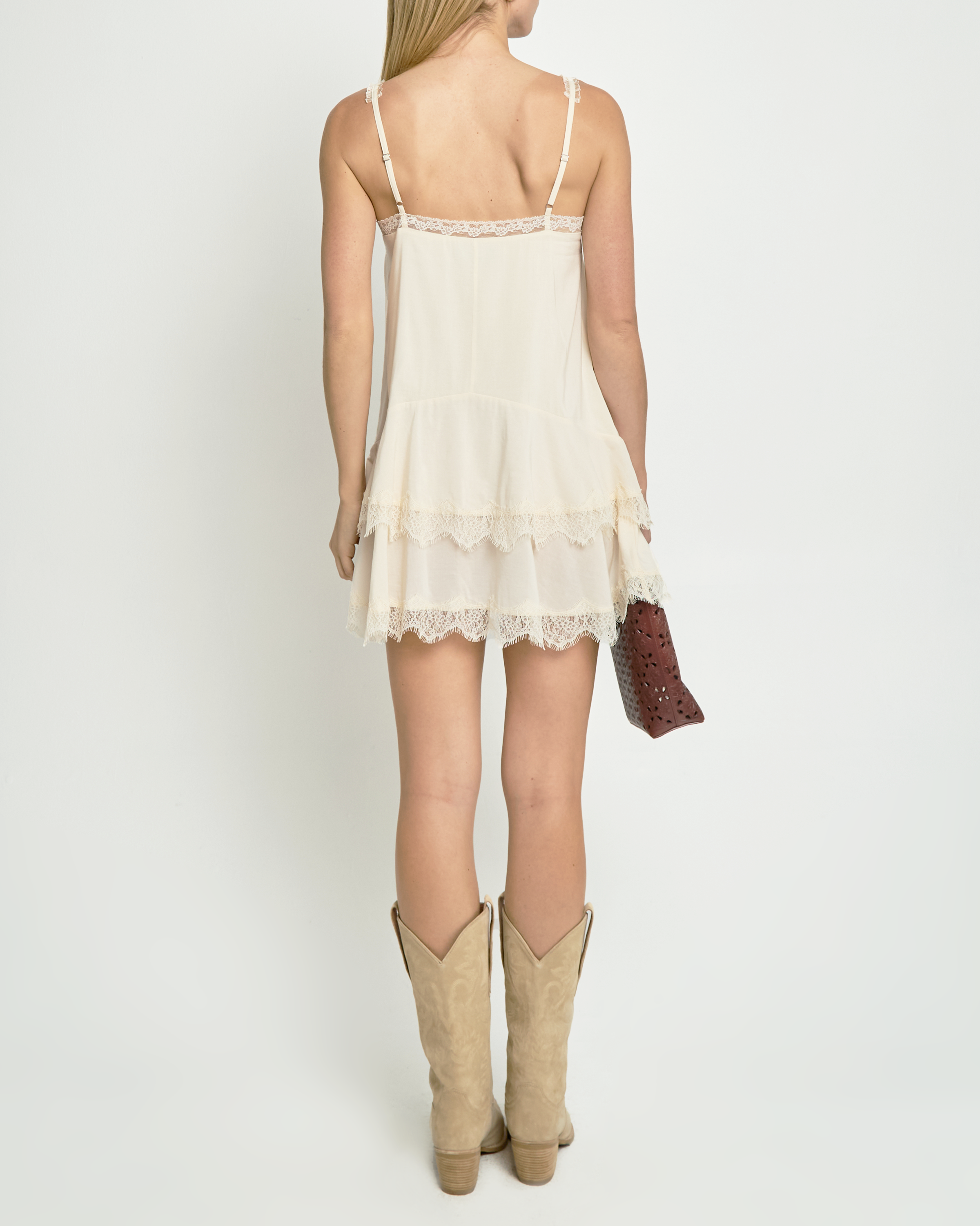 Delicately detailed with lace trim and paneling, this dress features a tiered ruffled skirt for a stunning silhouette. The relaxed fit and lightweight, breezy fabric make it perfect for any occasion.