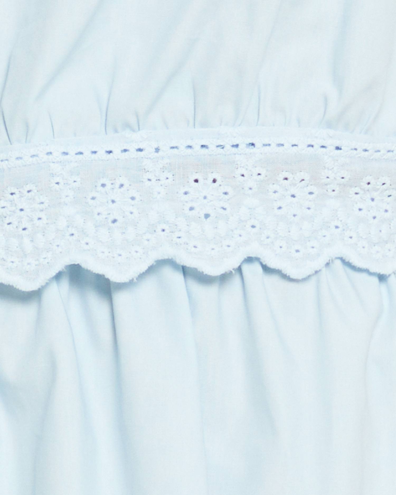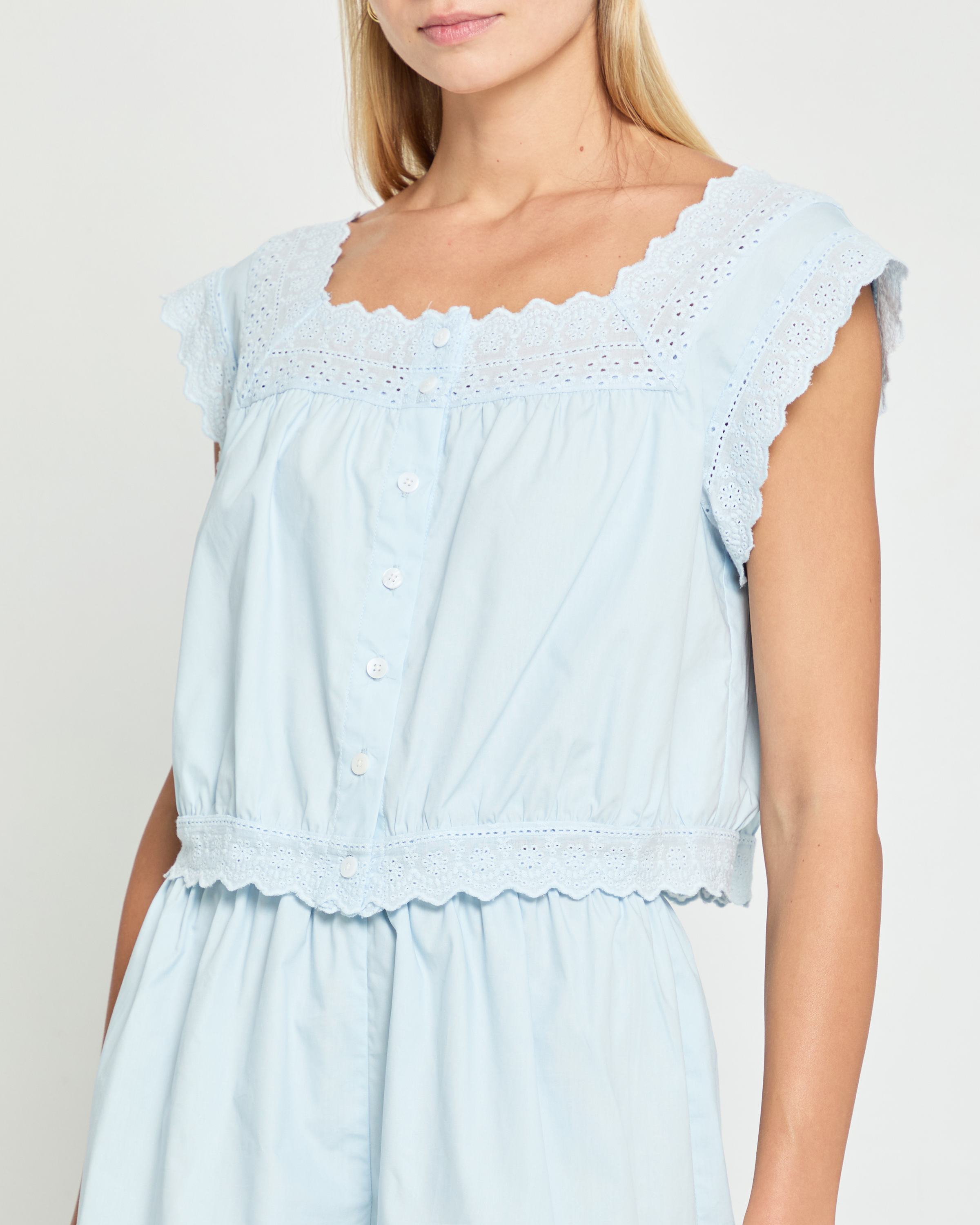 The button-up Bell Top is done with charming cap sleeves and a square neckline for a chic yet effortless feel. The eyelet lace detailing adds a delicate touch, while the cropped and relaxed fit makes it easy to wear. Made of soft and breathable cotton, this top is the perfect addition to your wardrobe.