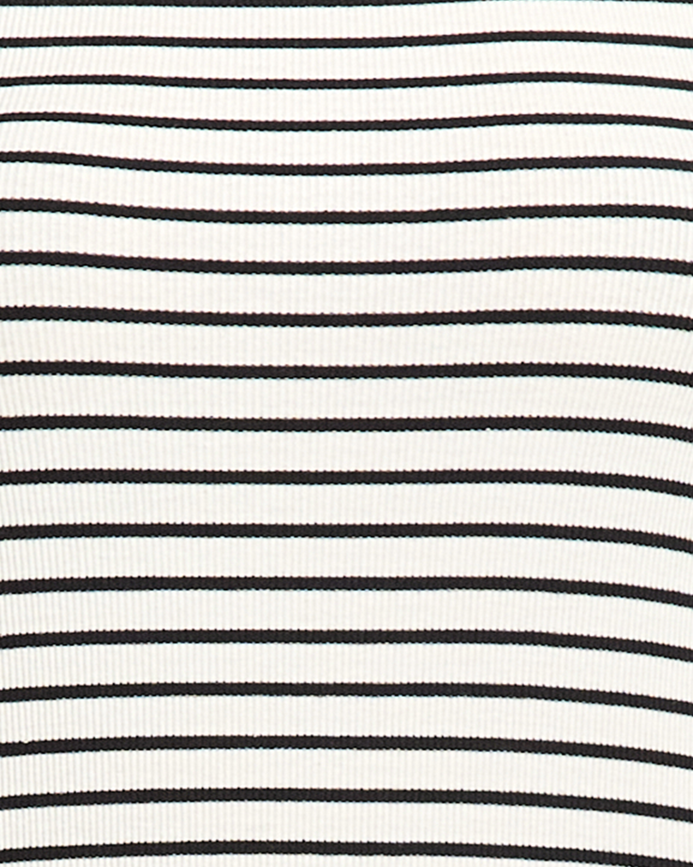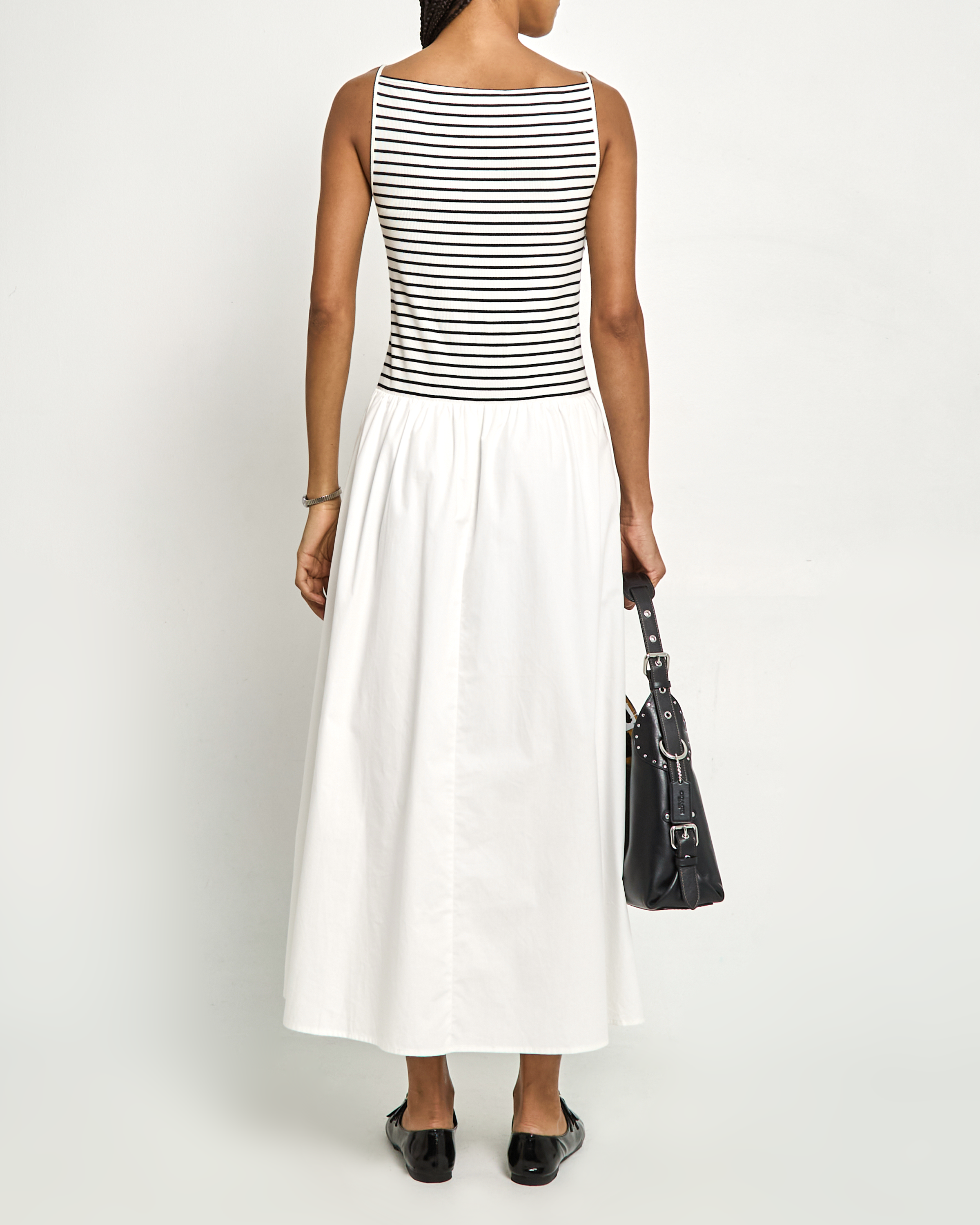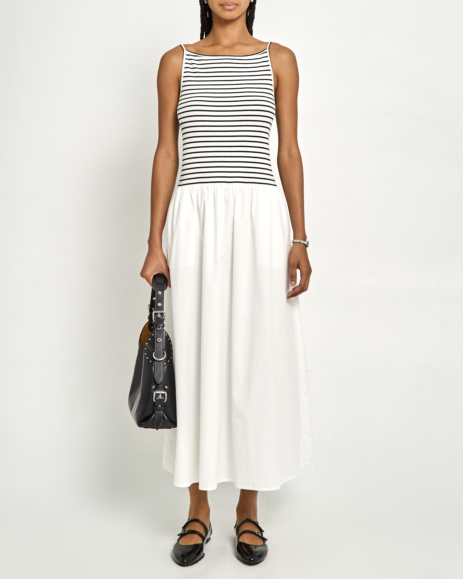 This chic Beryl Dress combines comfort and style with its stretchy stripped knit bodice and crisp white cotton maxi skirt. The high neckline adds a touch of sophistication to the chic silhouette.