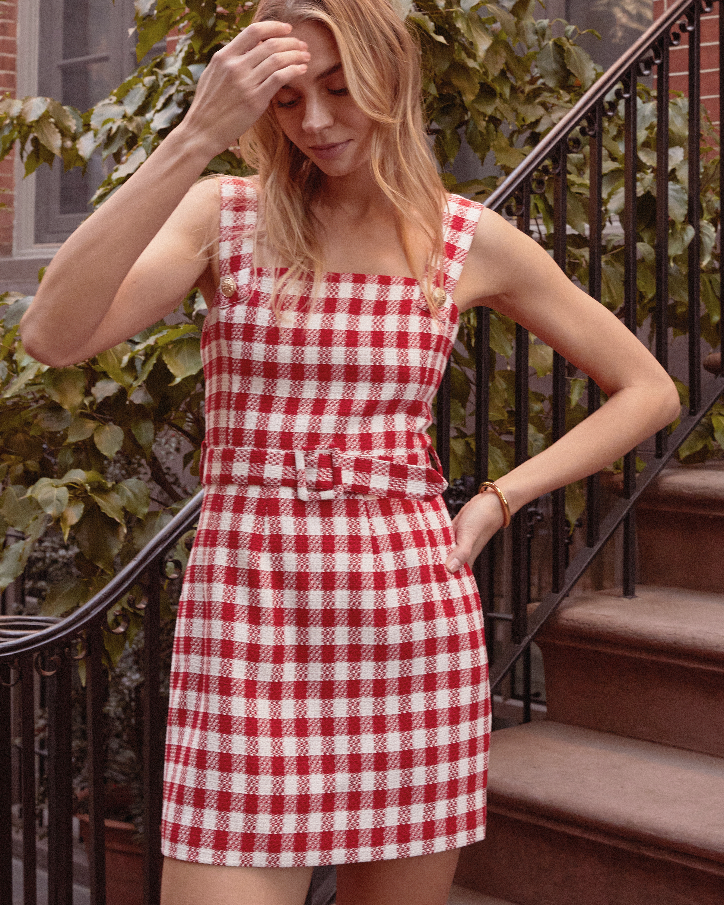 The Blaine Mini Dress is a playful and charming addition to any wardrobe. The fun and vibrant red gingham print will make a statement, while the gold button details add the perfect finishing touch. Complete with a belt for a flattering fit, this mini dress is both stylish and versatile.