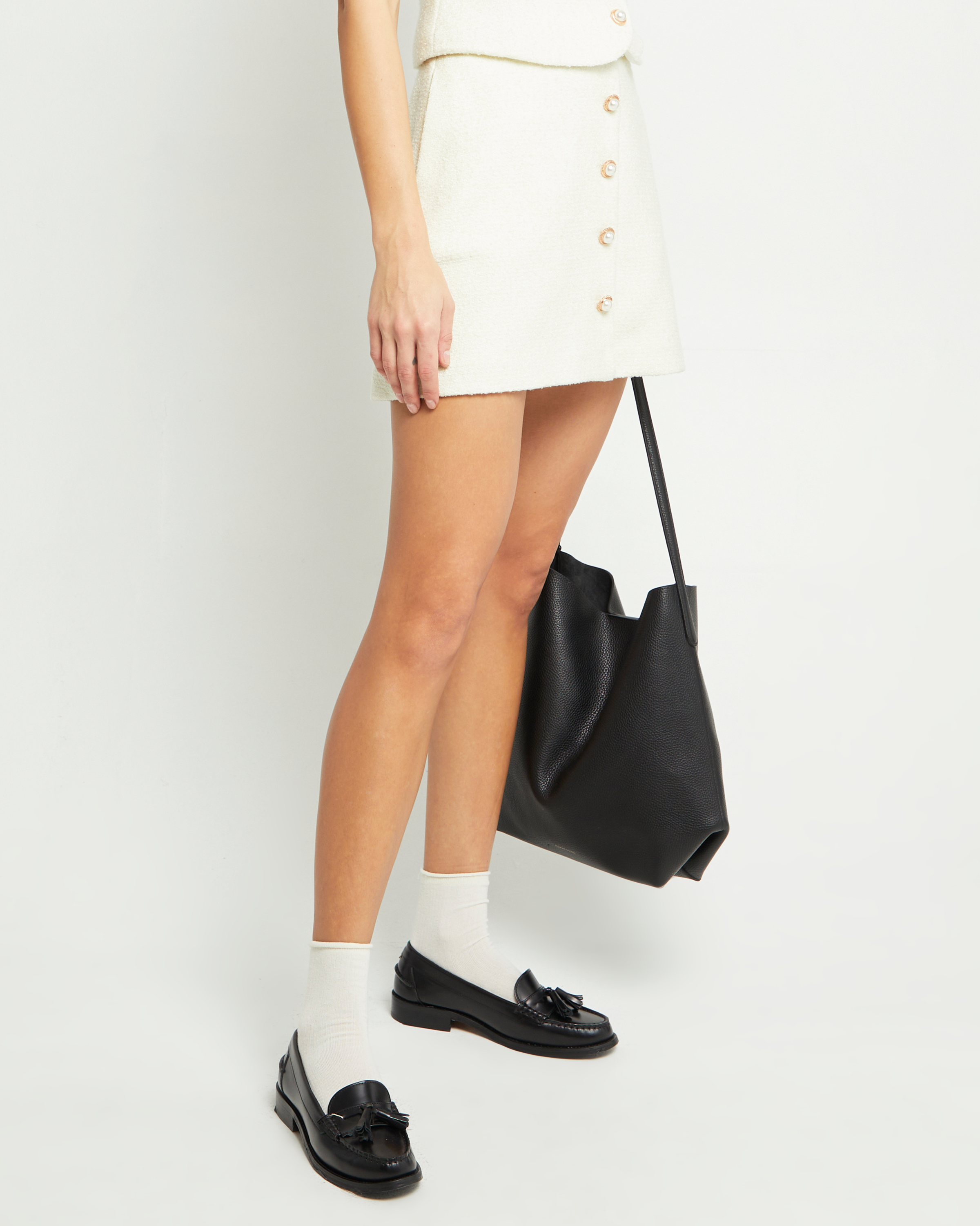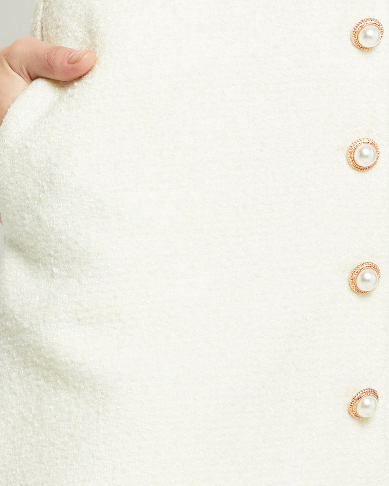 The Christy Skirt offers not only stylish elegance, but also practicality with its functional pockets. Adorned with gold and pearl buttons, this skirt is crafted from a thick cream tweed material, providing a touch of luxury.