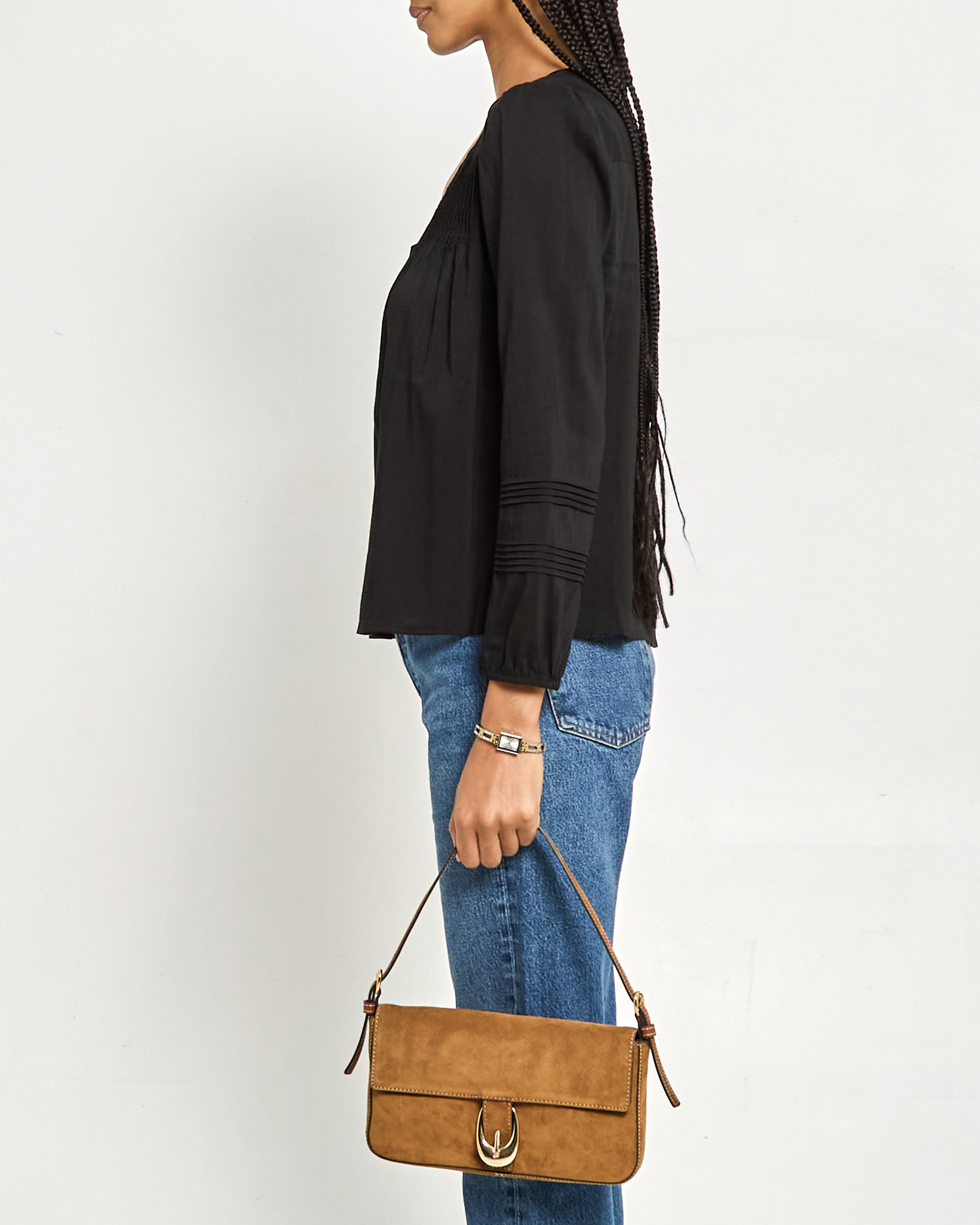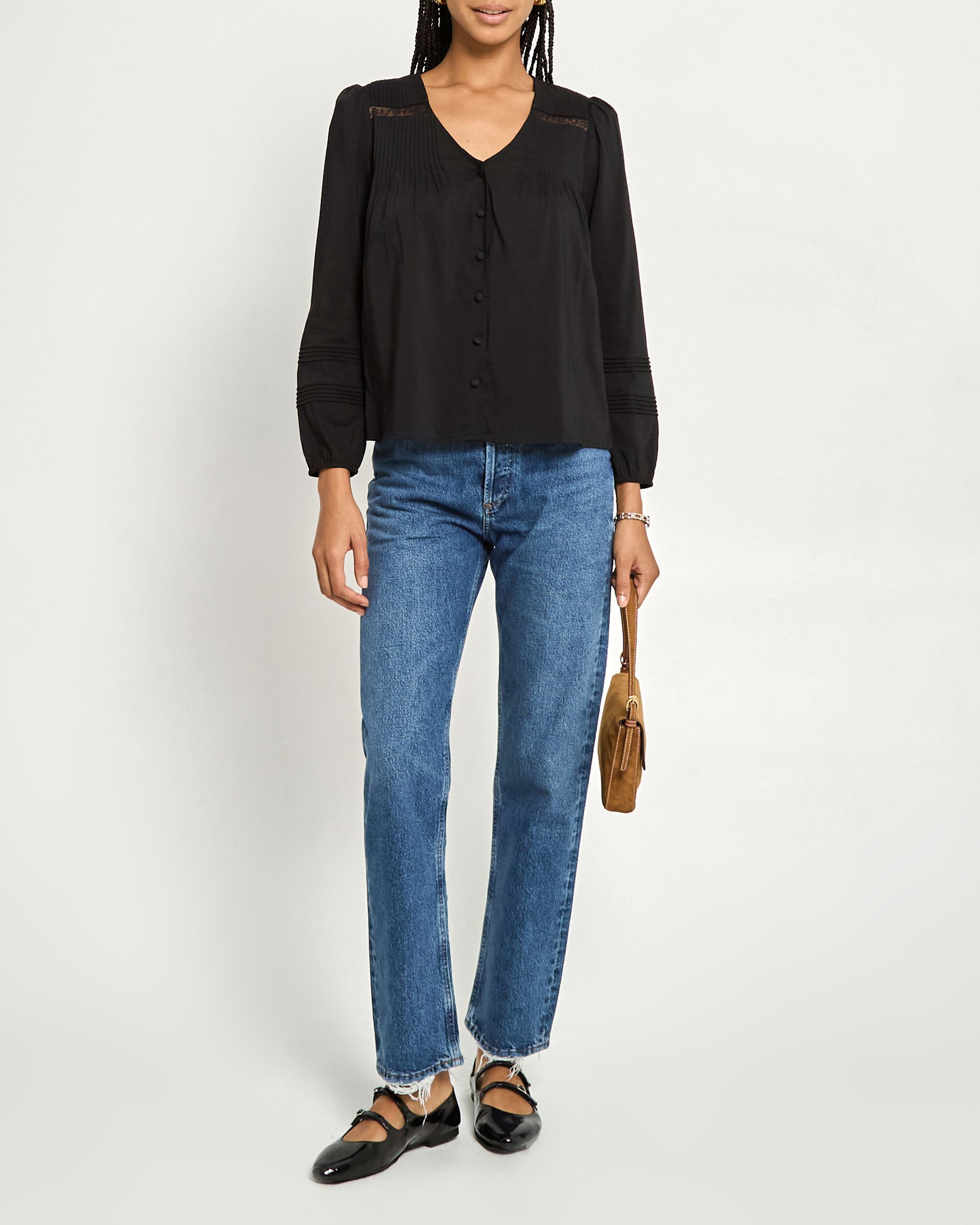 Made from a light and airy material, this easy blouse offers a comfortable and relaxed fit. Delicate pleating details and lace trim add a touch of romance to this versatile piece.
