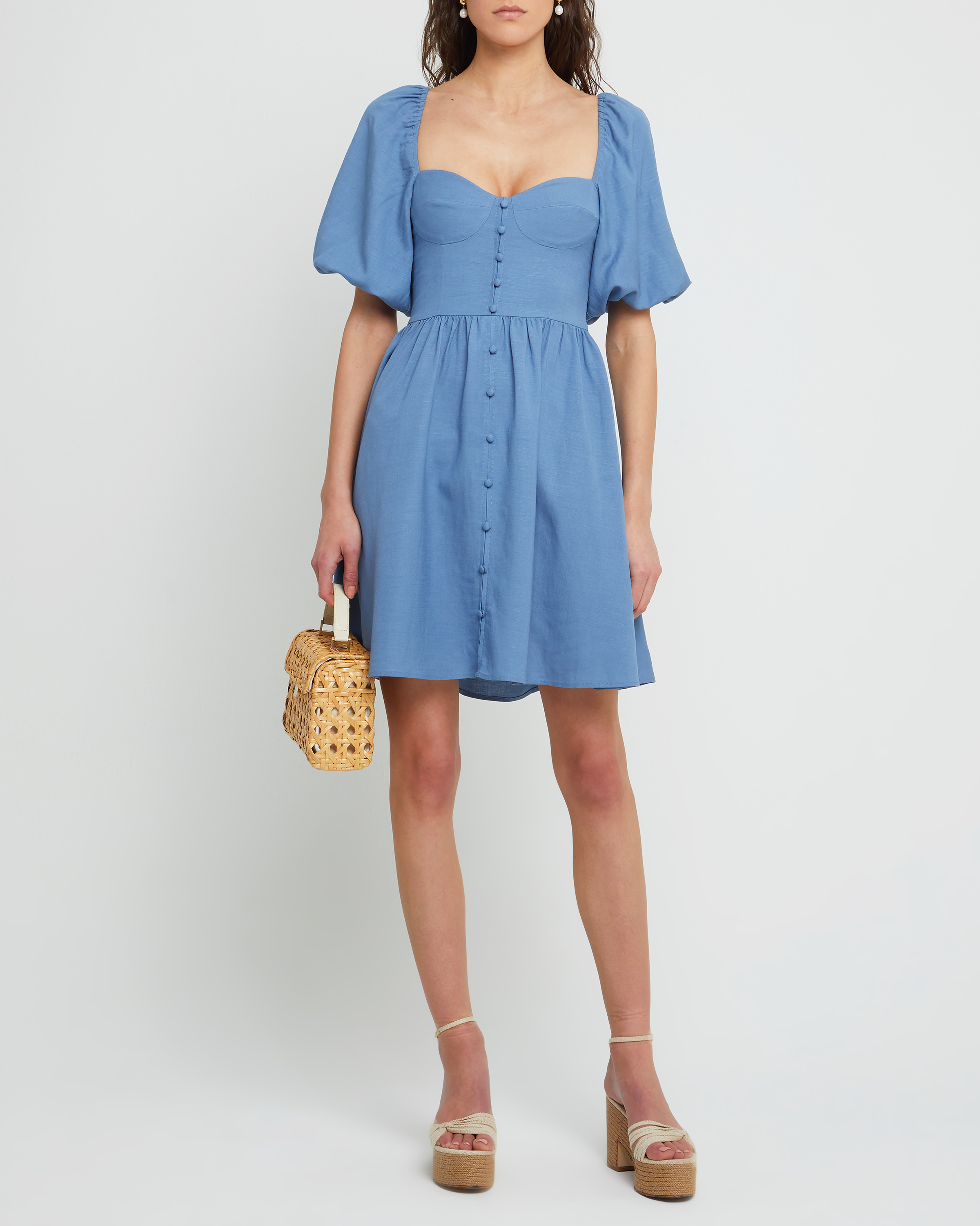 Short and sweet, this mini dress is done with a bustier-style bodice and elbow-length sleeves. Covered buttons up the front add the finishing touch.