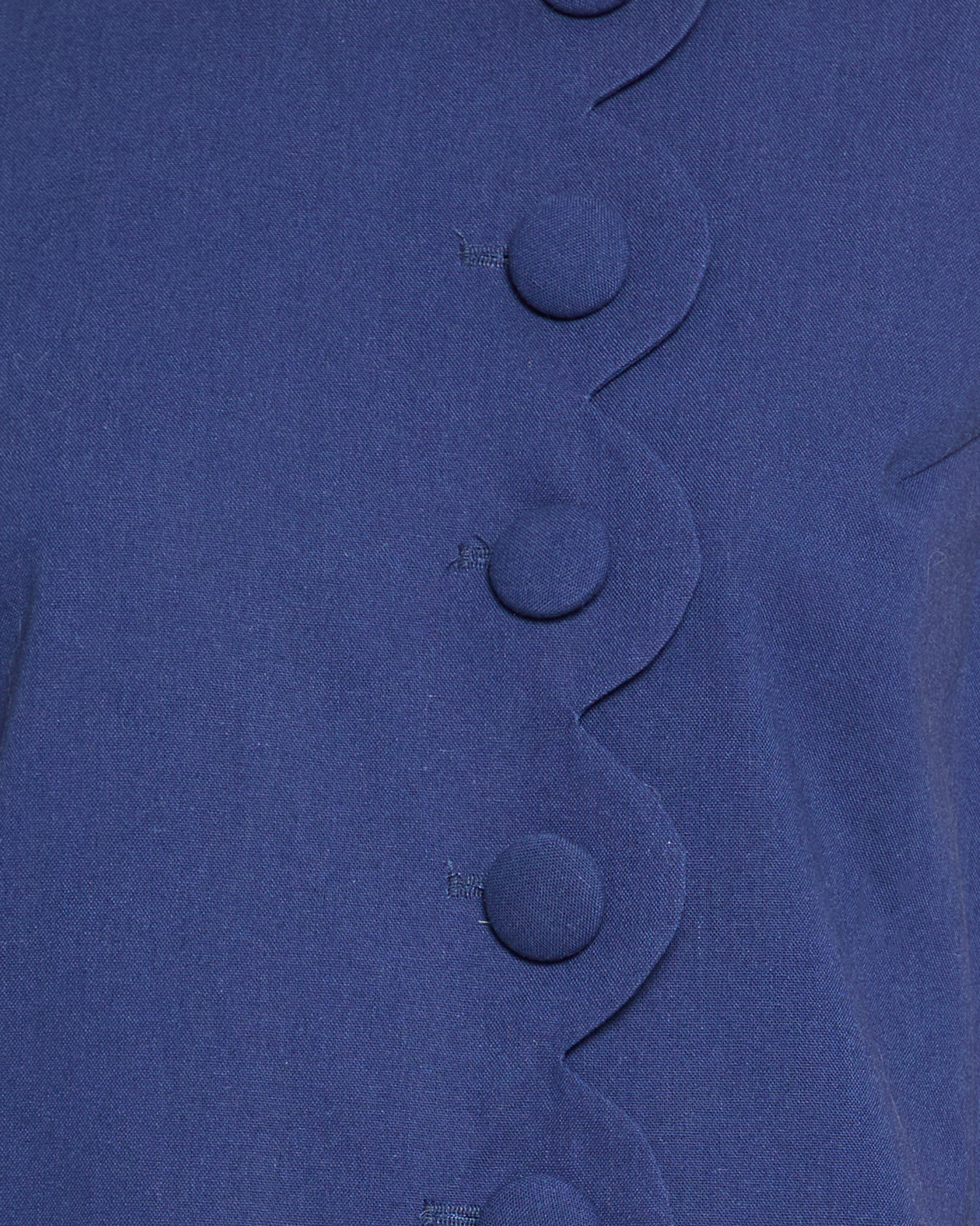 This mod-style mini is done with a gorgeous scalloped detail and oversized, covered button. Finished with functional pockets.