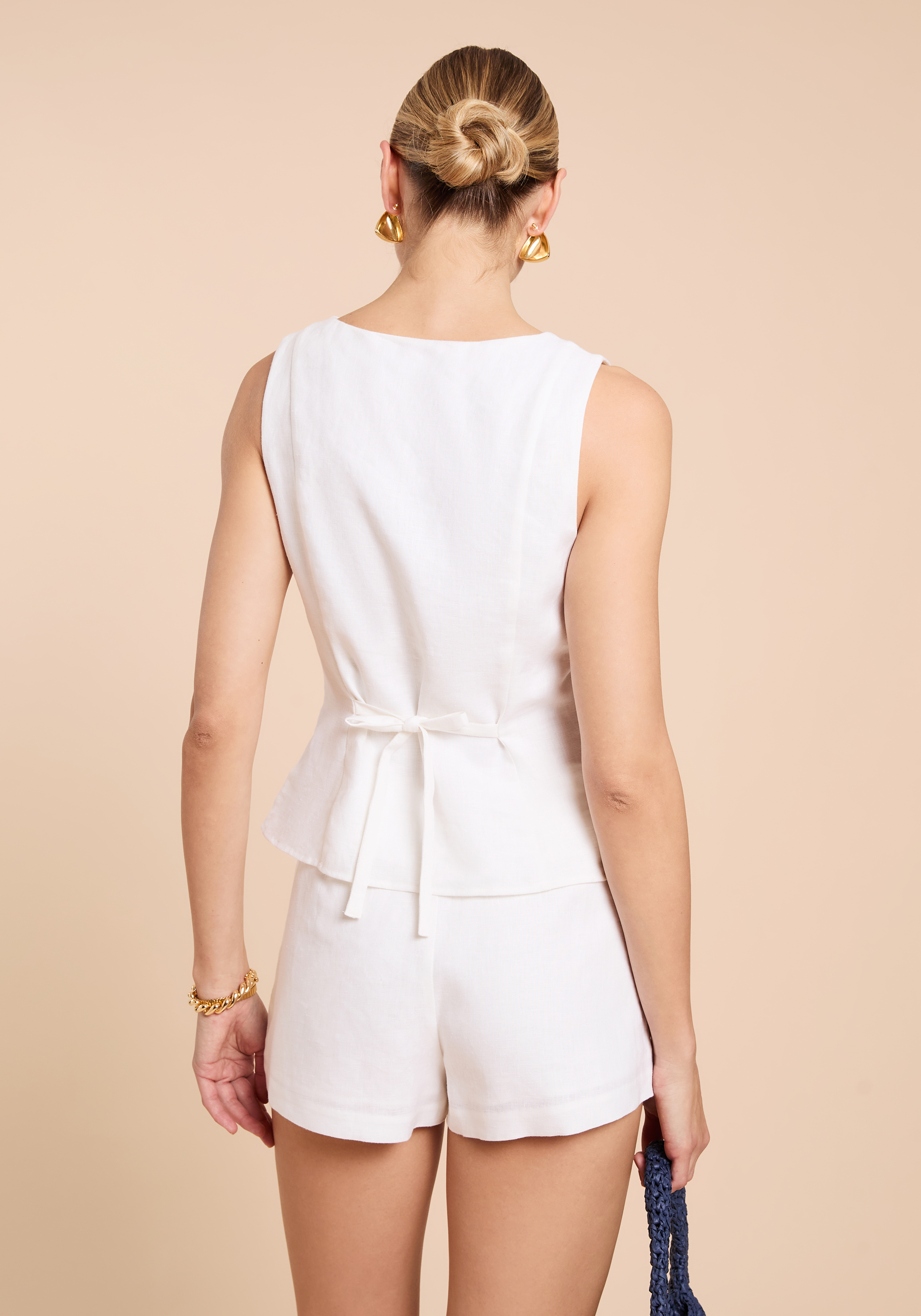 The Kailea Linen Set is a stylish and comfortable choice featuring white shorts paired with a matching top. Its high neckline adds a touch of sophistication, while the adjustable waist ensures a perfect fit. Crafted from breathable linen, this set is both easy to wear and effortlessly chic, making it ideal for warm-weather occasions where you want to look polished yet relaxed.