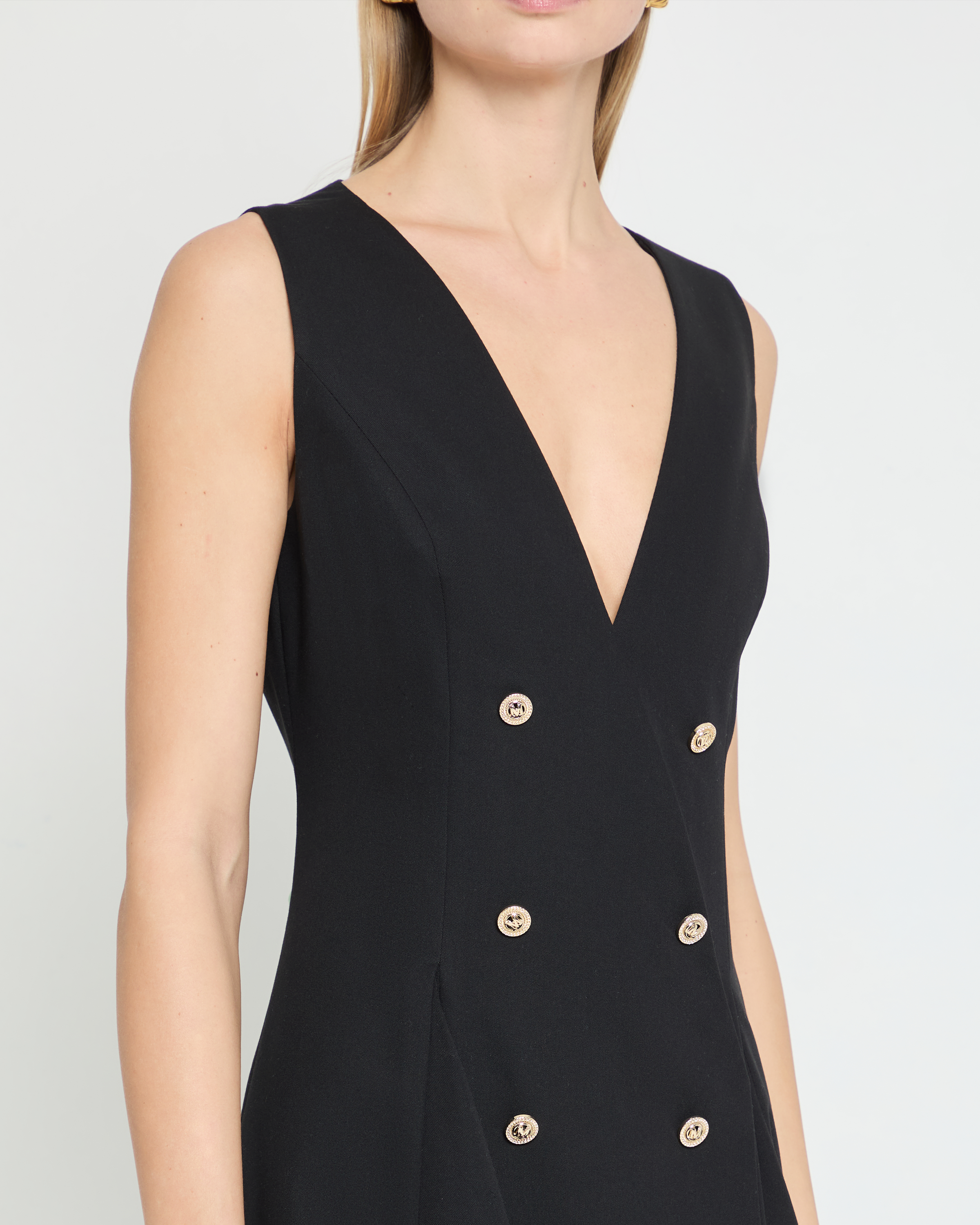 Elevate your style with our Kamryn Dress, a little black shift dress perfect for any occasion. The double breasted gold button details add a touch of sophistication, making it a versatile and elegant piece for your wardrobe.