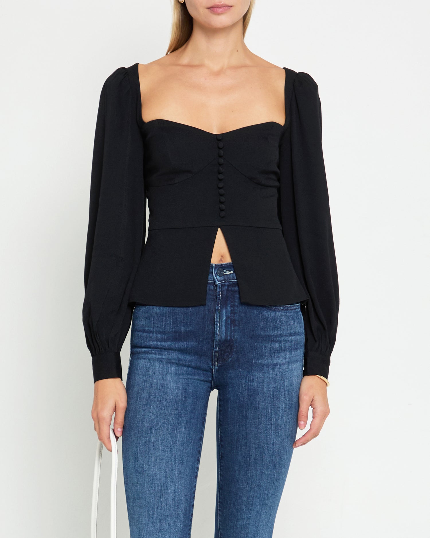 The Kendra Top is an elegant addition to any wardrobe. This black blouse features a flattering peplum design and charming puff sleeves, exuding sophistication and style. With front button details, it's versatile for any occasion. Elevate your look with this must-have piece.
