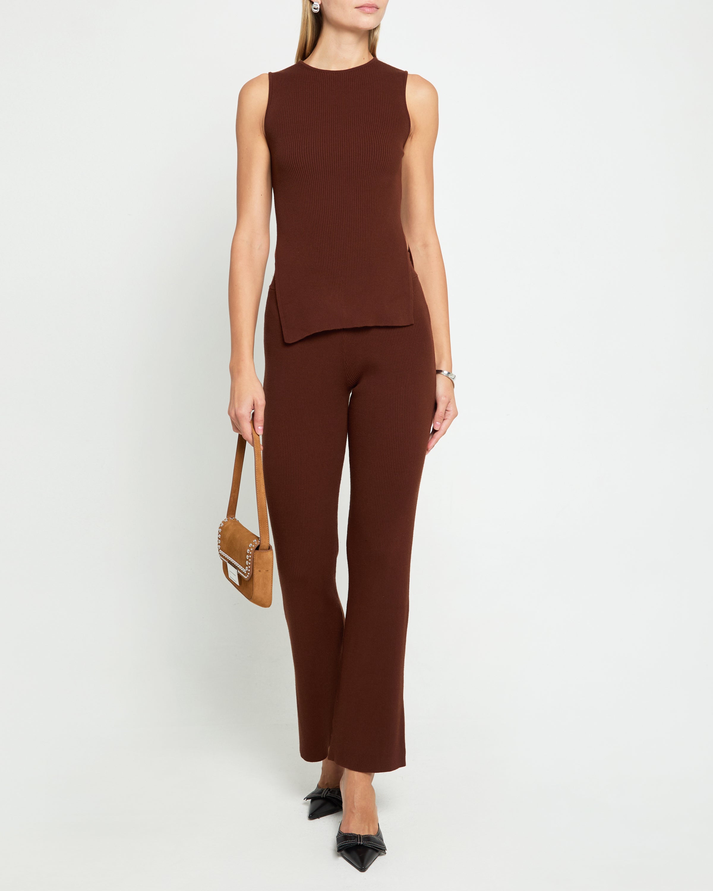 Effortlessly elevate your wardrobe with our Bessette Pant. The ribbed knit fabric provides a soft and stretchy fit, while the high waist and fit and flare design flatter your figure. Done in a rich brown hue, these pants are the definition of easy chic.