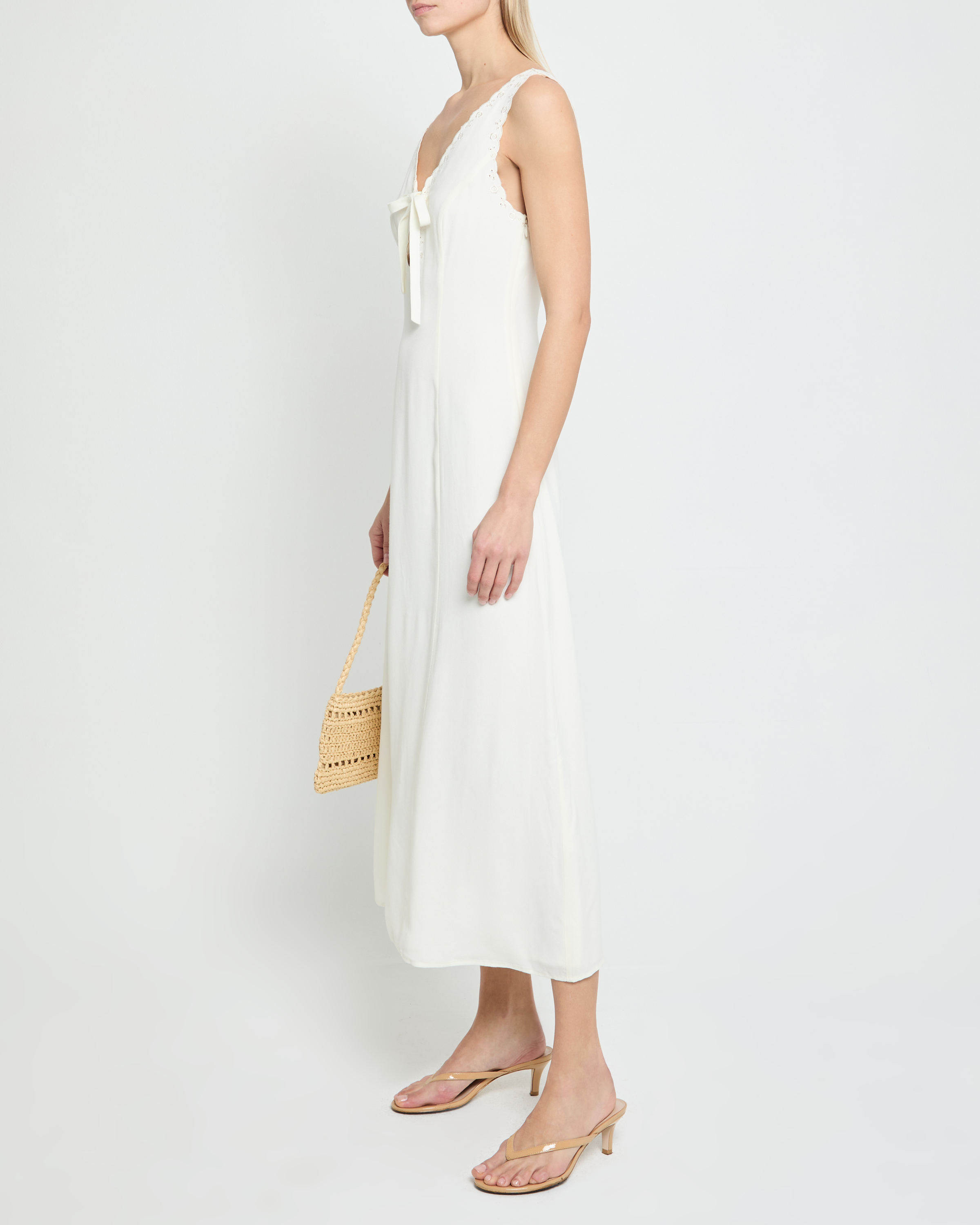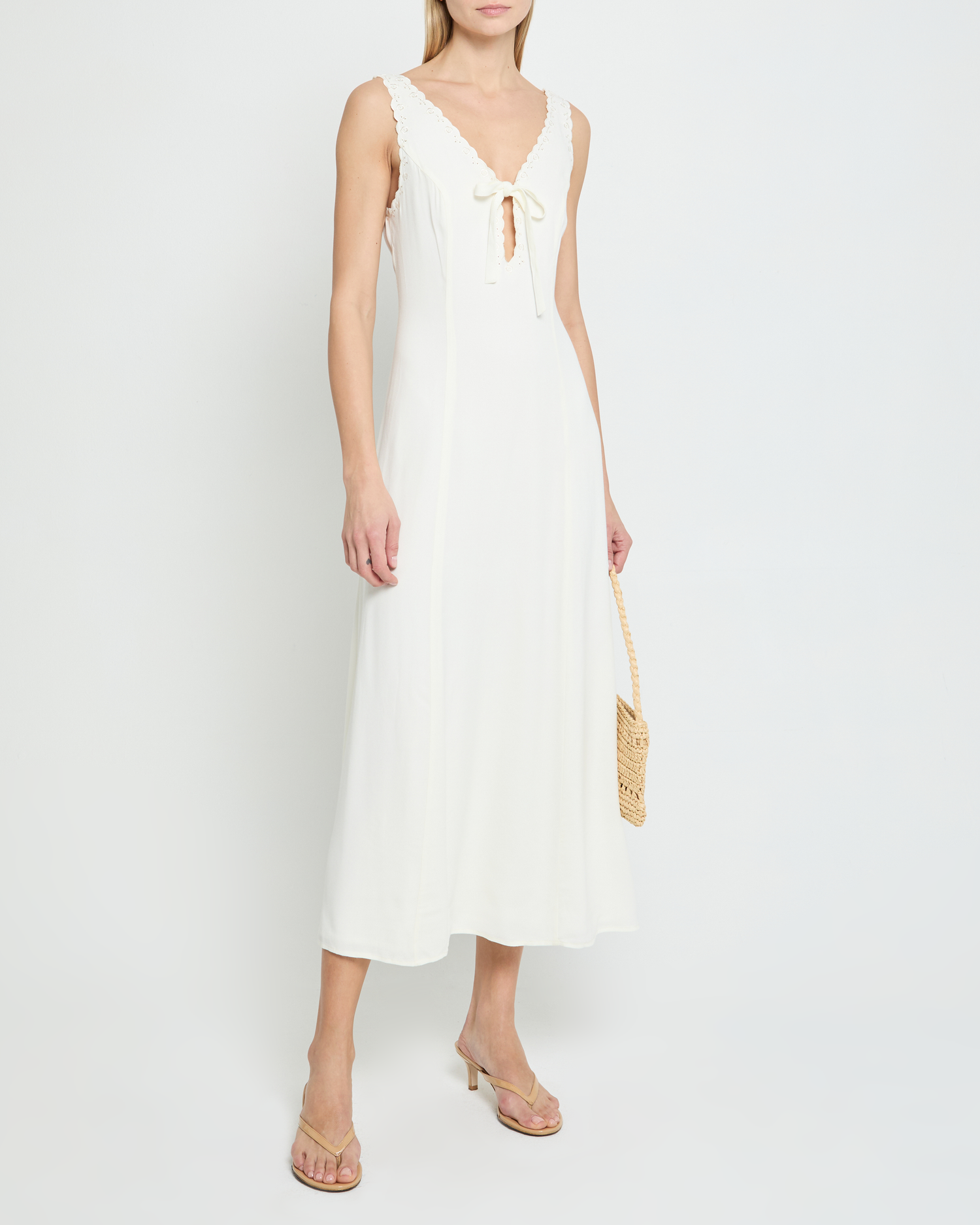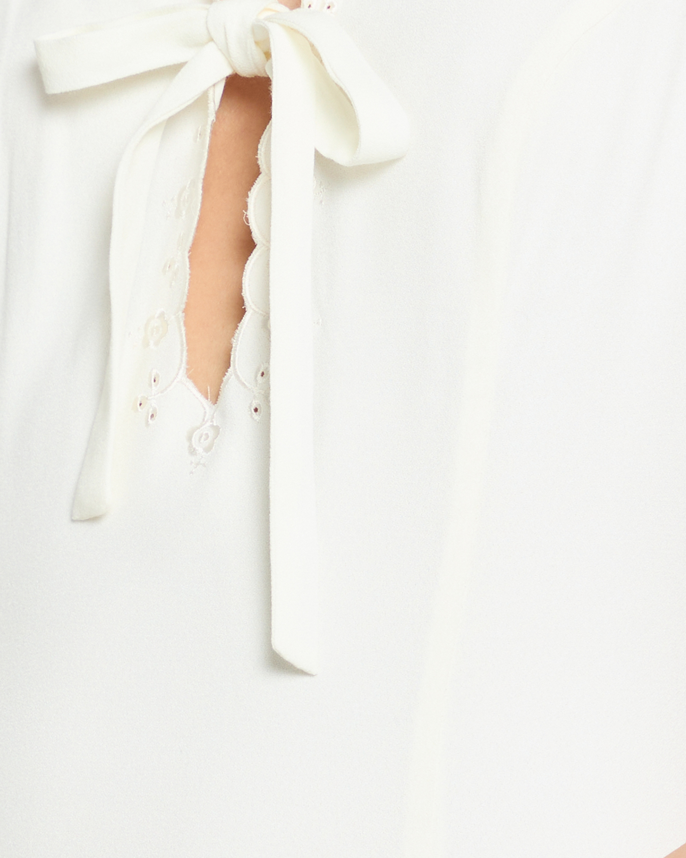 The Louisa Dress is a perfect blend of elegance and comfort. Made with a light crepe material, it features delicate embroidery and a tie detail to create an intricate neckline. The scalloped hem adds an elevated touch to this already beautiful dress.