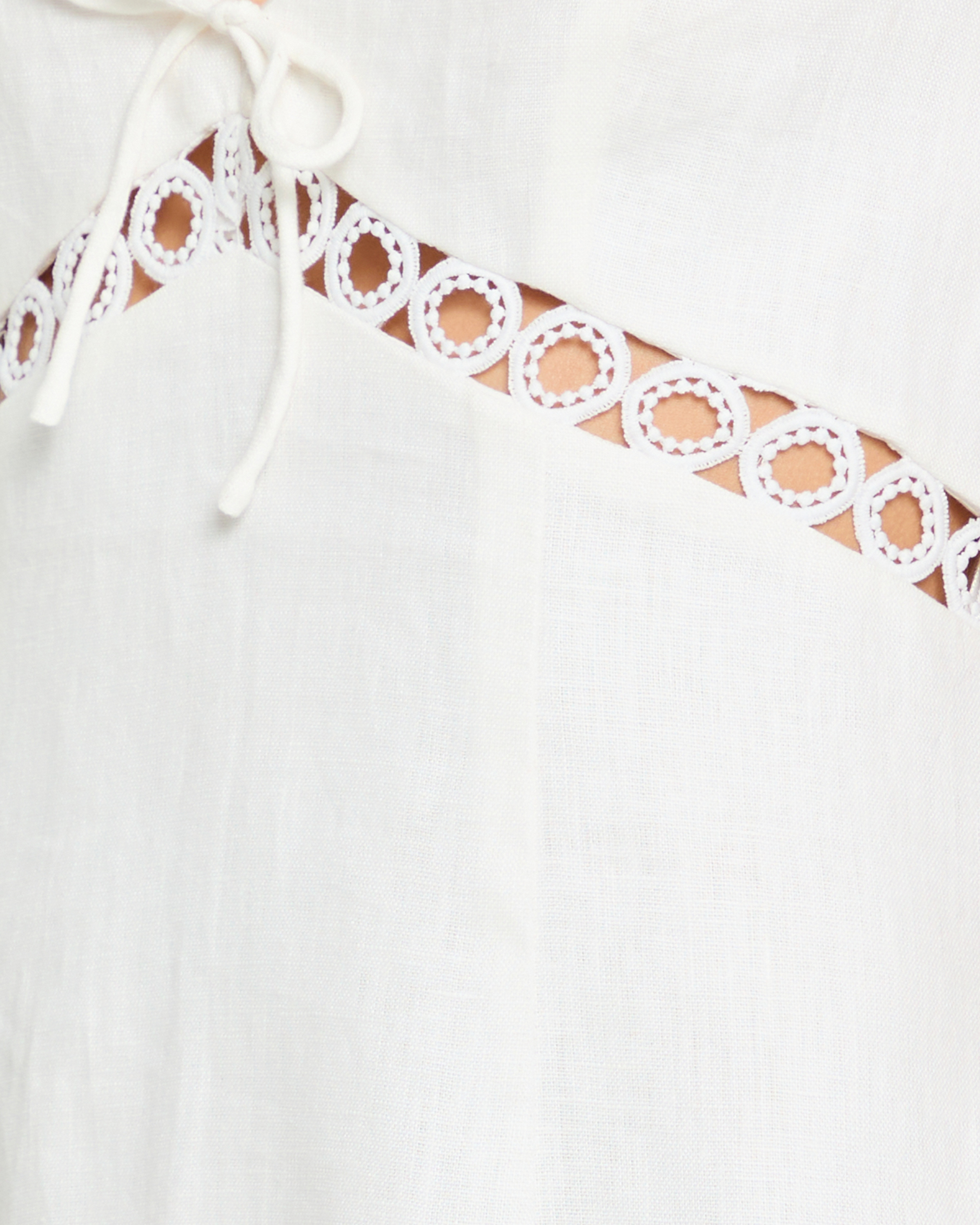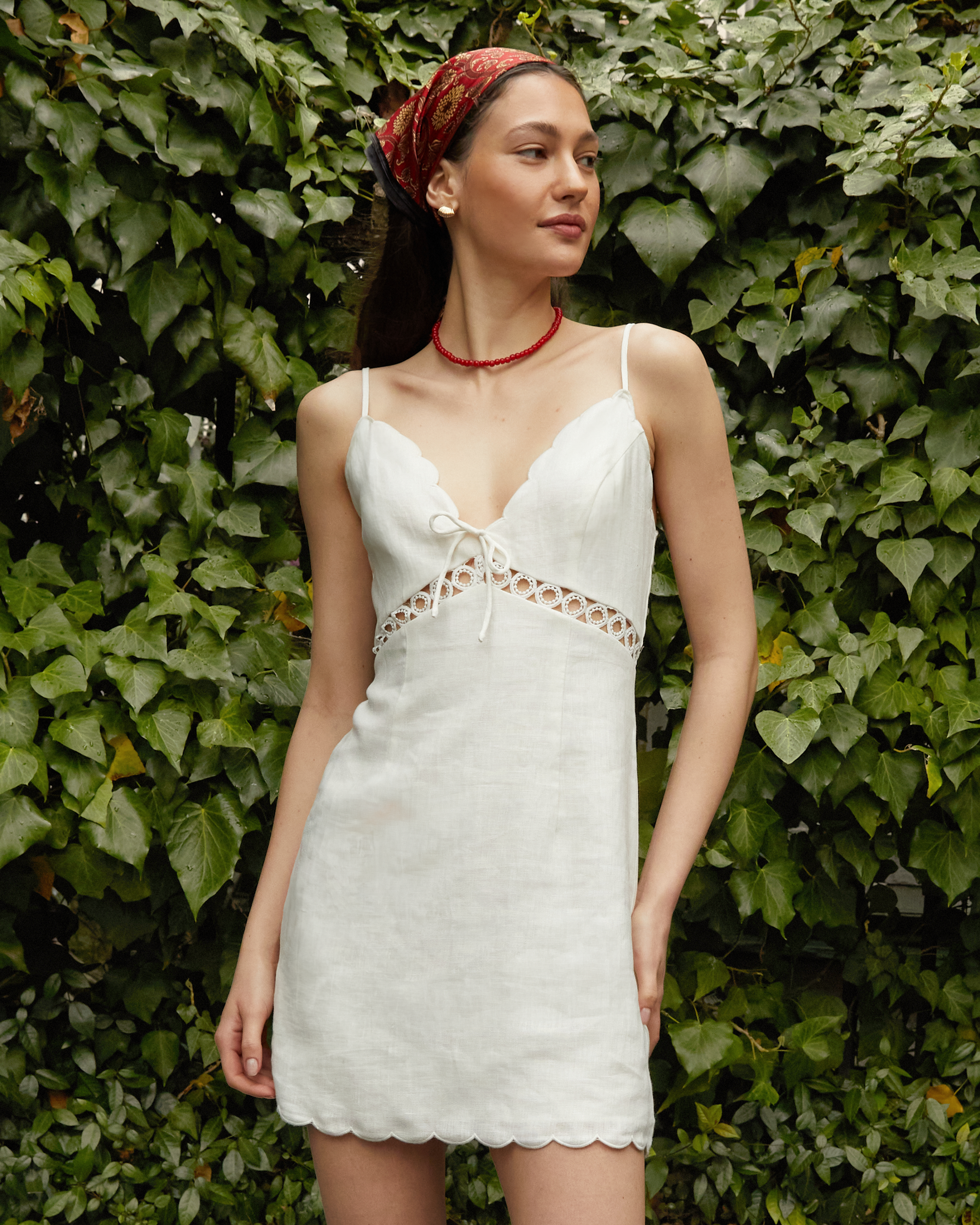 Done with a light linen feel, the Marcie Dress is the ultimate summer staple. Featuring a charming scalloped hem and eyelet lace trim cutout under the bust, this dress is both playful and sophisticated. Complete with a sweet bow detail, it's the perfect little white sundress for any occasion.