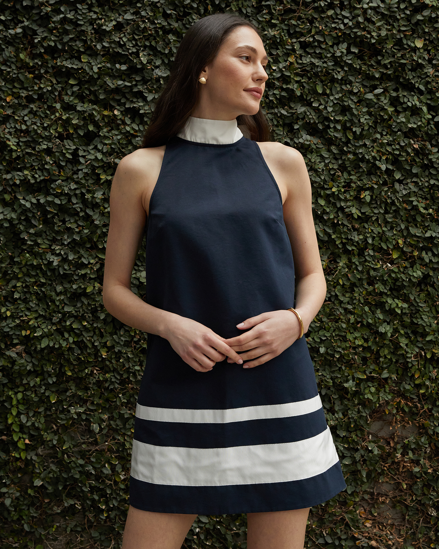 This Raelynn Dress is the perfect combination of preppy and chic, with its navy color and high neckline. Done with an easy, straight fit and mini length for a clean a crisp feel. Elevate your wardrobe with this versatile piece.