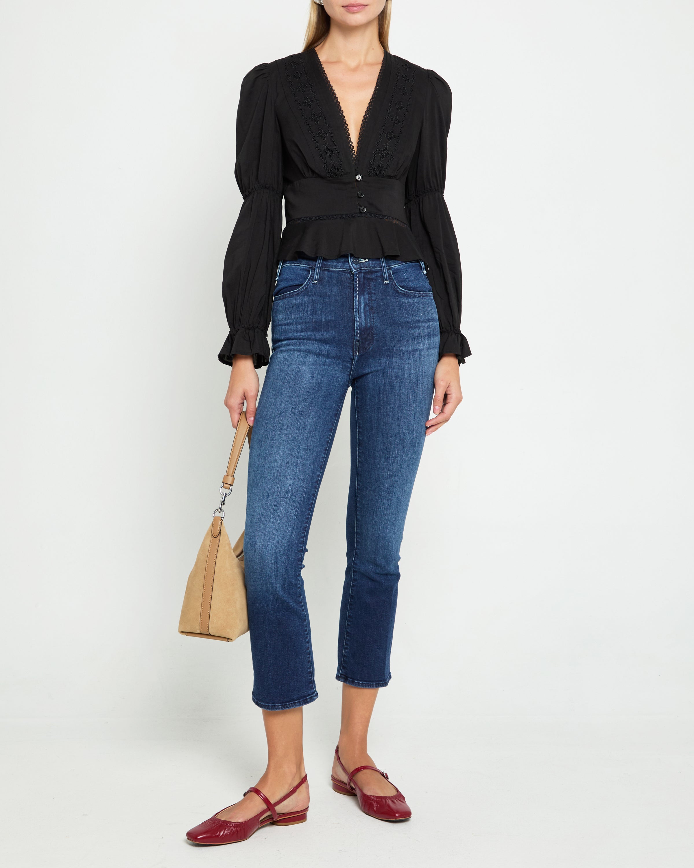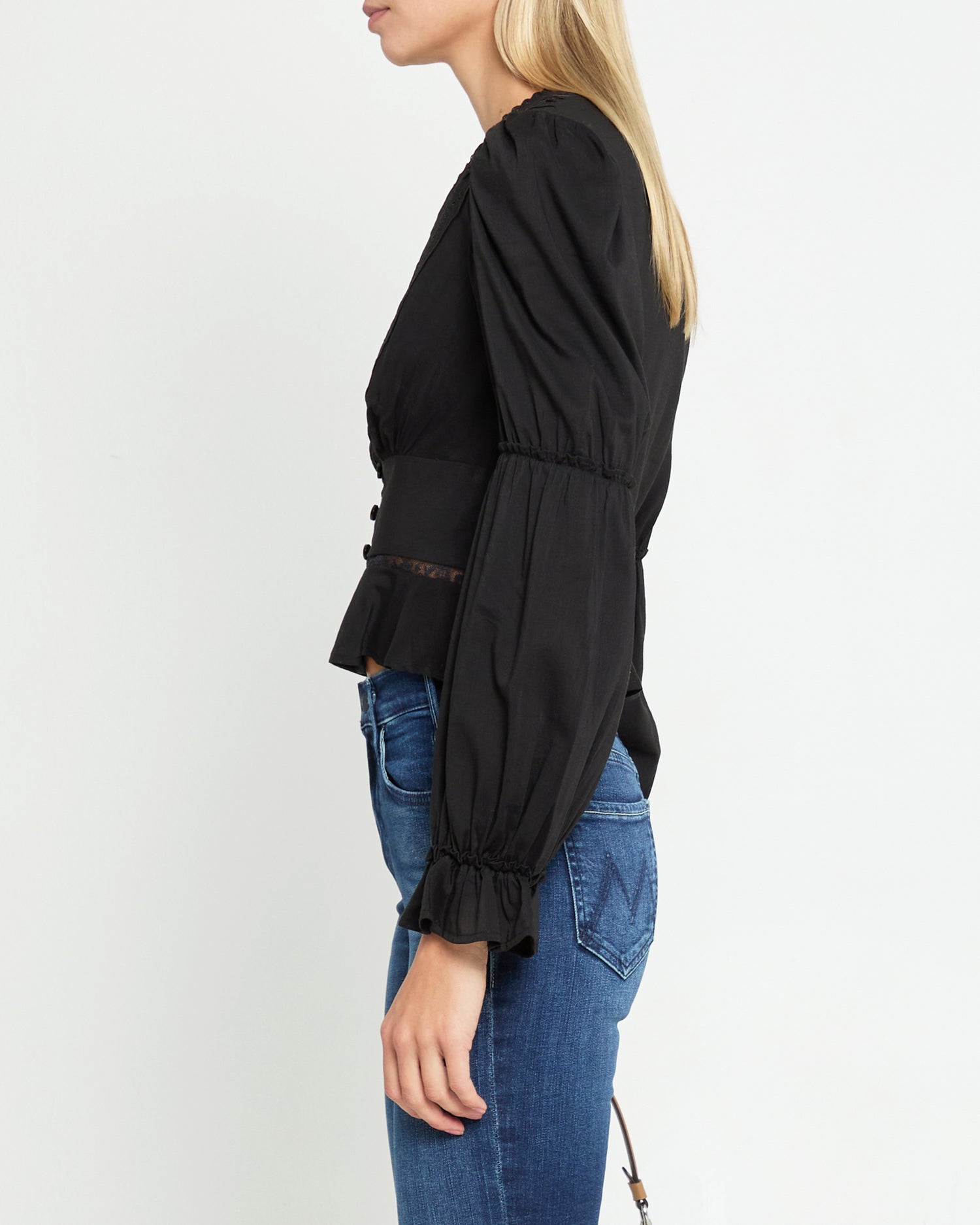 The Tensley Top features front buttons, puff sleeves, and a plunging neckline for a stylish and sophisticated look. Its easy breezy fabric and peplum design provide comfort and a flattering fit, while delicate lace embroidery details add a touch of elegance.