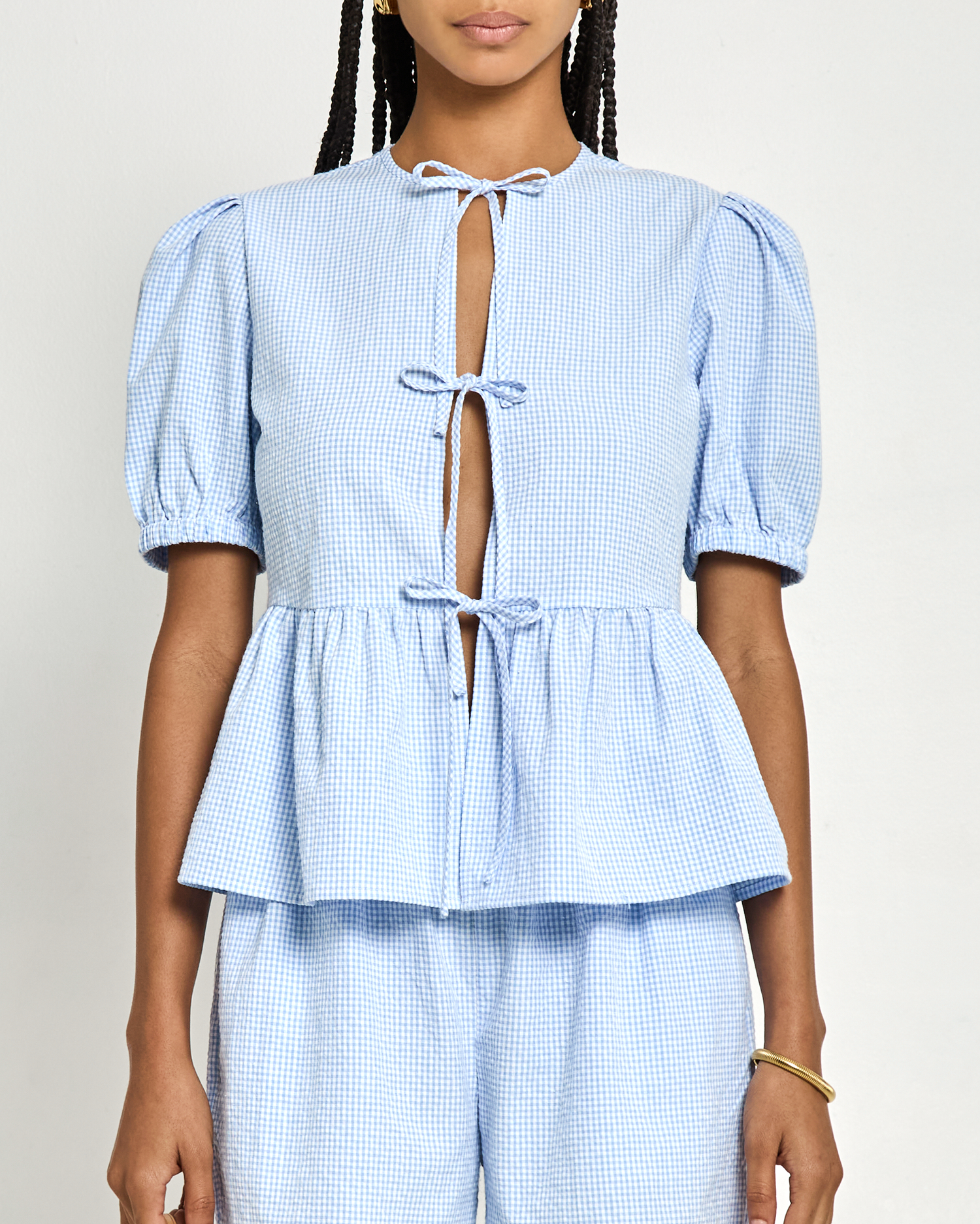 Effortlessly charming, the Una Set features front ties and puff sleeves for a sweet touch. In a light blue gingham pattern, it boasts a relaxed fit and comfortable feel for a perfect blend of style and comfort.