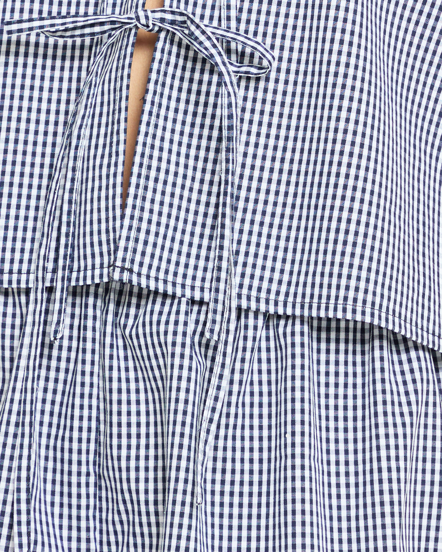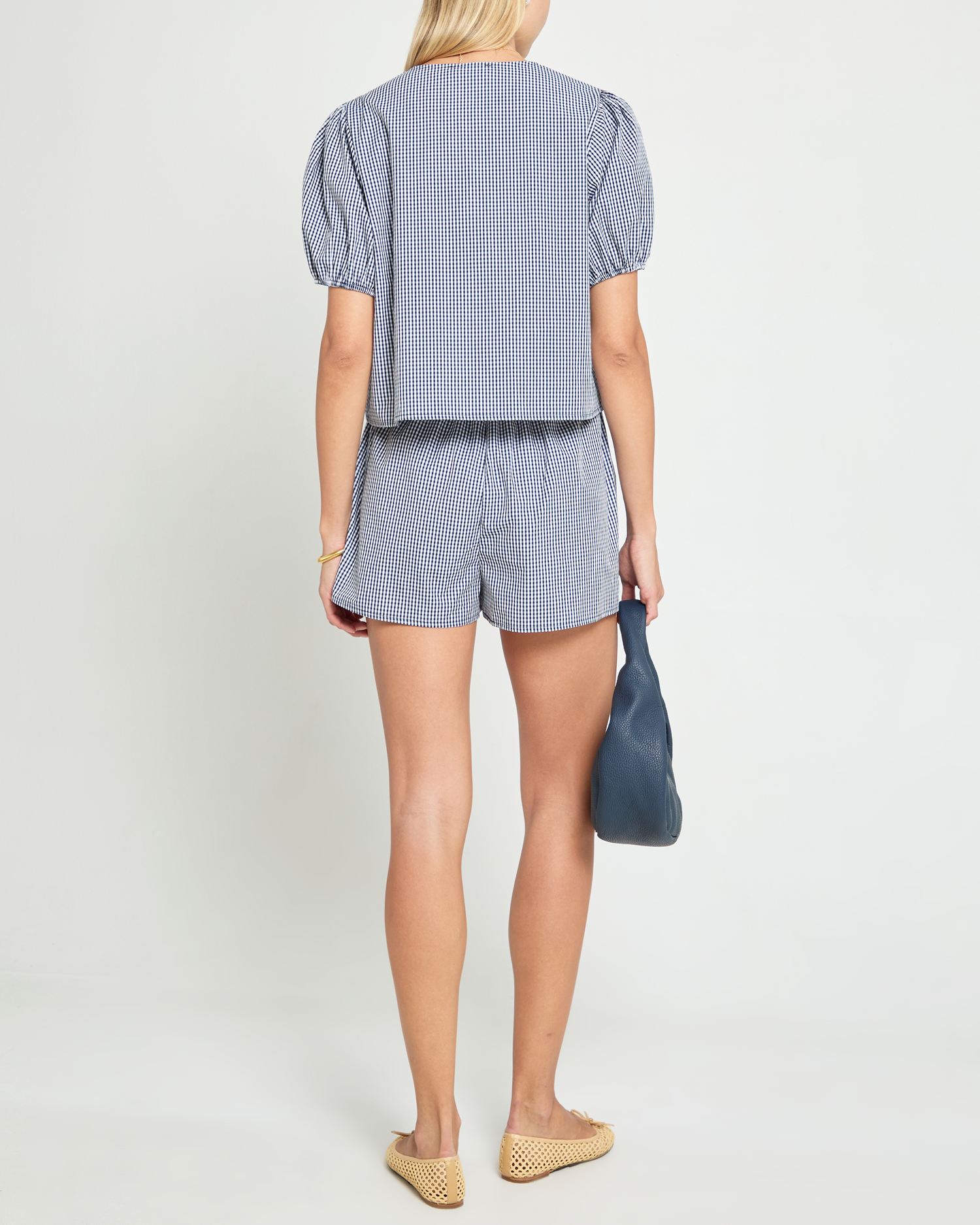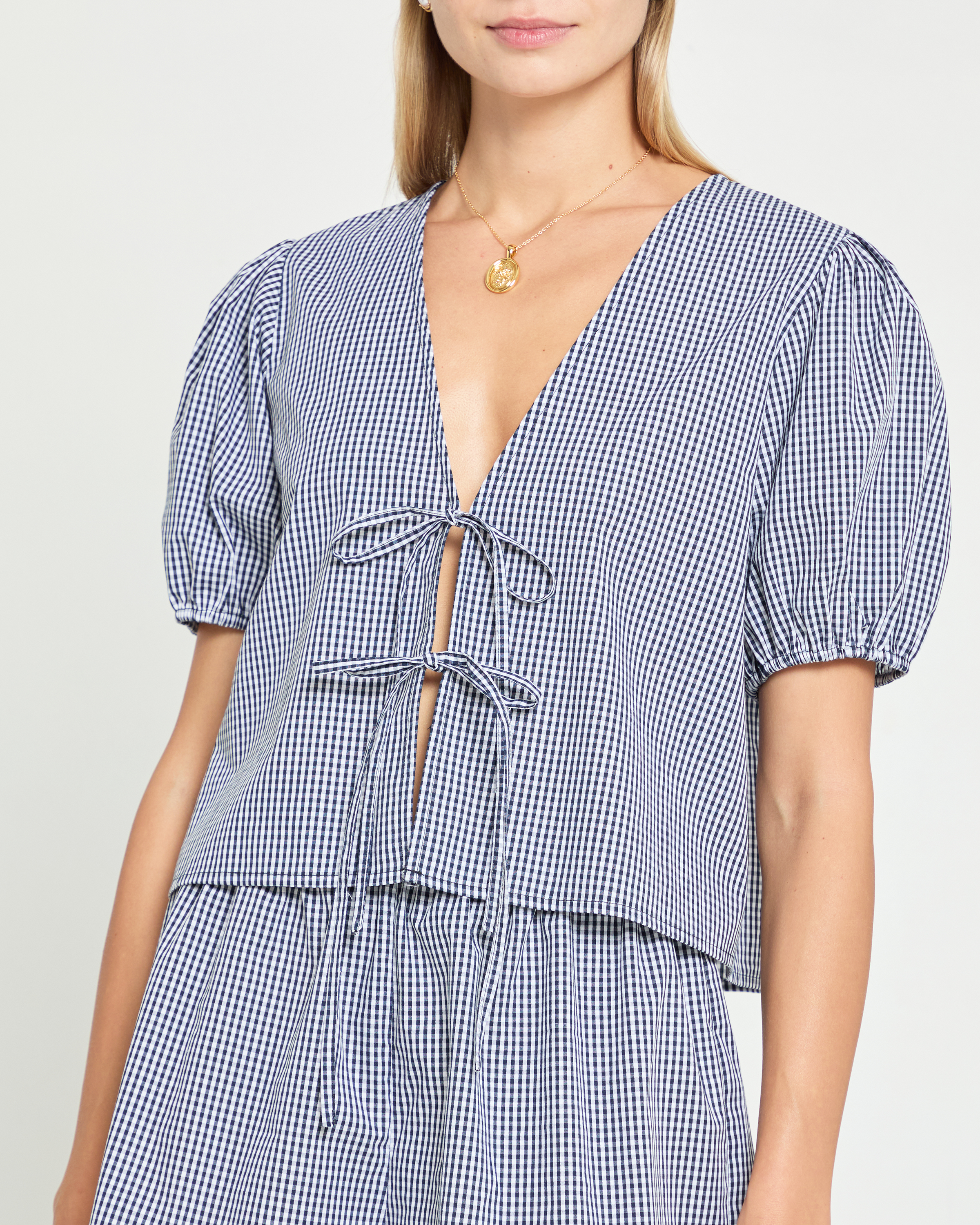 Introducing the Wilder Set, made in 100% cotton classic navy gingham. Done with an elastic waist for comfort and an open top fastened with front ties for a stylish touch. The sweet puff sleeves add a charming detail to this light and effortless design. Perfect for casual outings and sunny days.