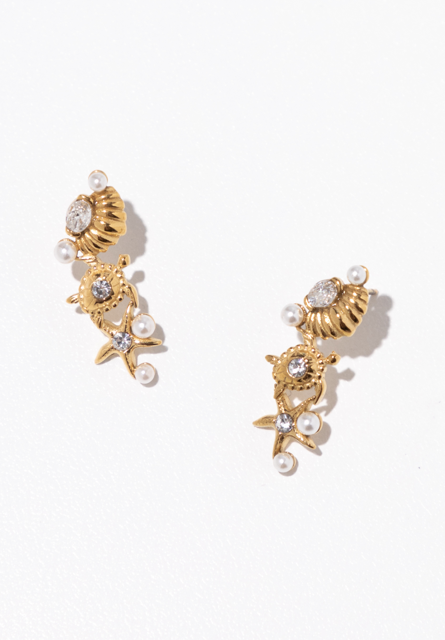 These Seaside Pearl Earrings artfully combine sweet shell, turtle, and starfish, each delicately dotted with crystals and pearls. Their coastal-inspired charm and expert craftsmanship make them a sophisticated accessory that brings a touch of the ocean’s elegance to any outfit.