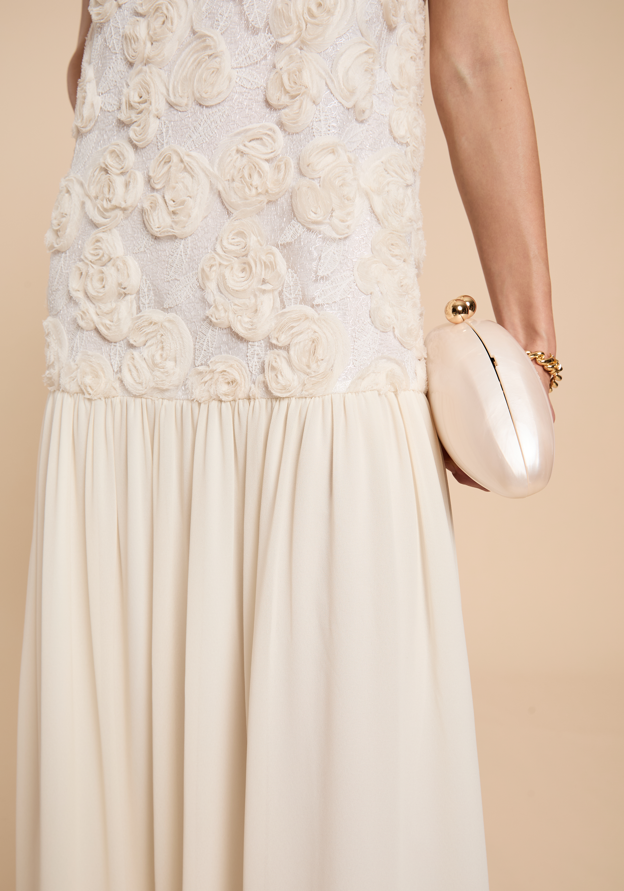 The Ondine Dress features a gorgeous textured rosette fabric that adds dimension and charm. Its relaxed bodice and drop waist create a flattering silhouette, while the floaty chiffon skirt offers graceful movement. This dress combines simplicity with elegance, making it a refined choice for both casual and special occasions.