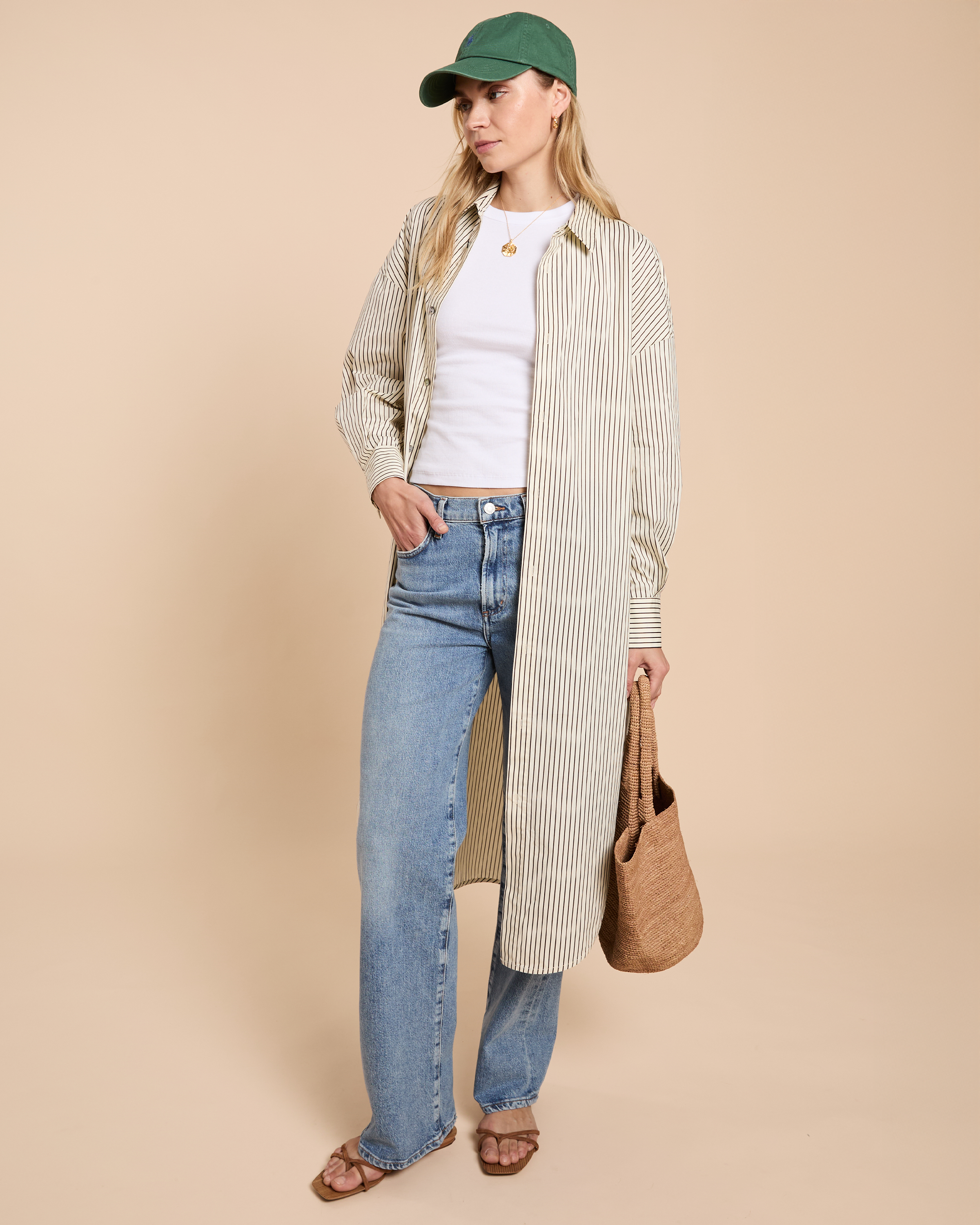 The Ash Shirt Dress features a luxurious rich brown striped fabric complemented by elegant mother of pearl buttons. Its long length offers versatile styling options—wear it over pants for a polished look, layer it over a swimsuit for effortless beach chic, or wear it alone as an easy piece.
