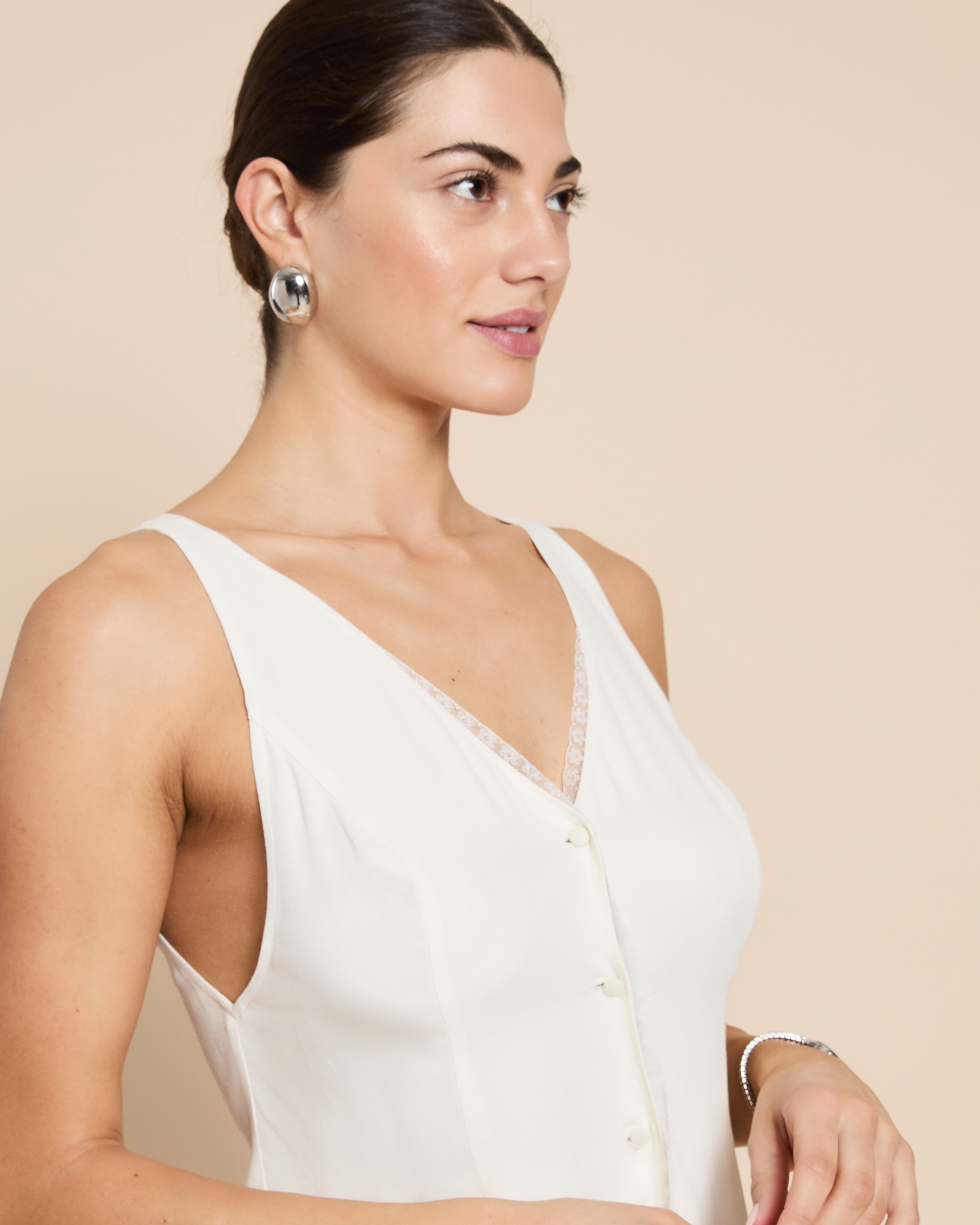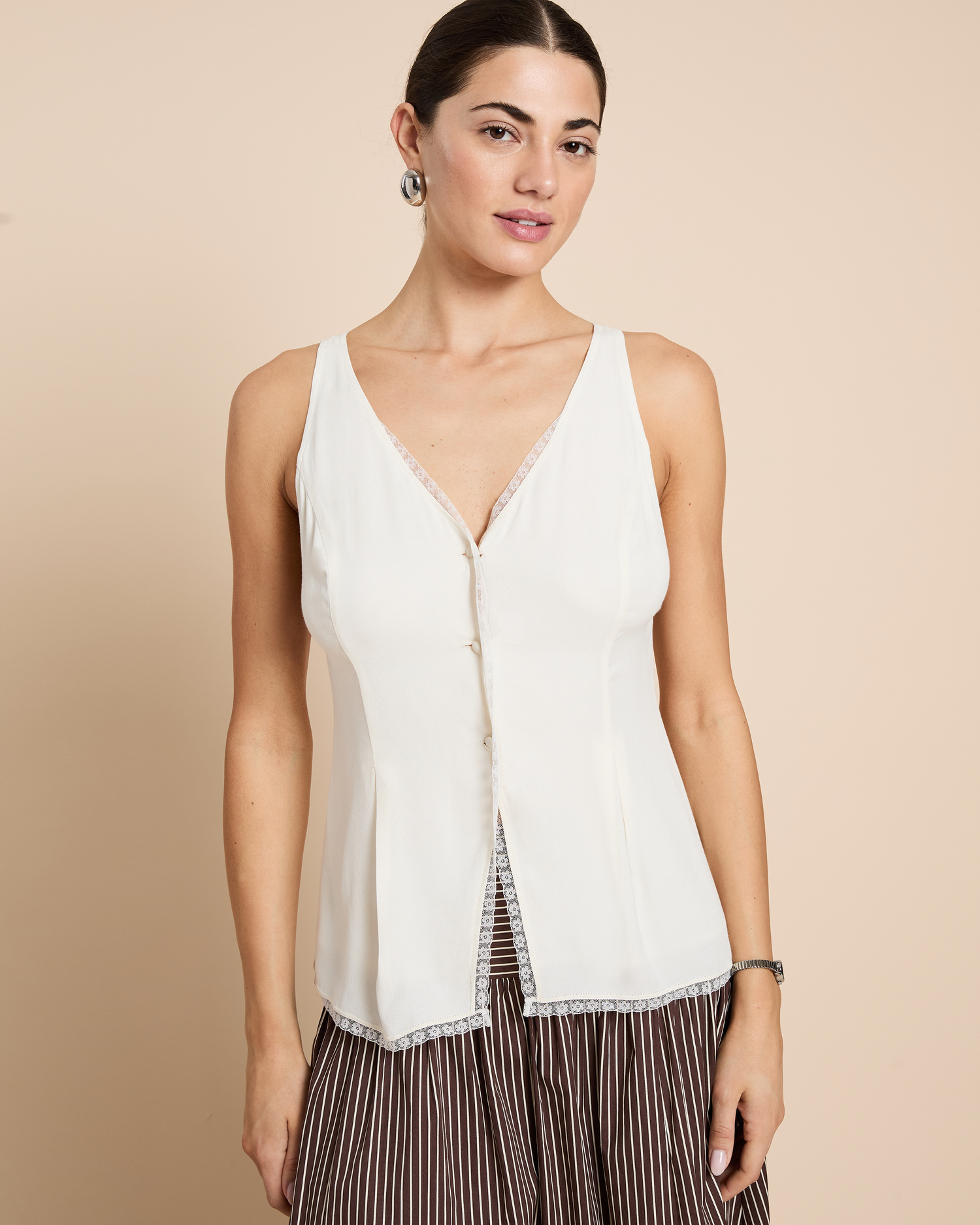 The Bellina Top is expertly crafted with light crepe material and delicate lace trim, providing a comfortable and stylish addition to any wardrobe. While the button up design and adjustable fit offer versatility.