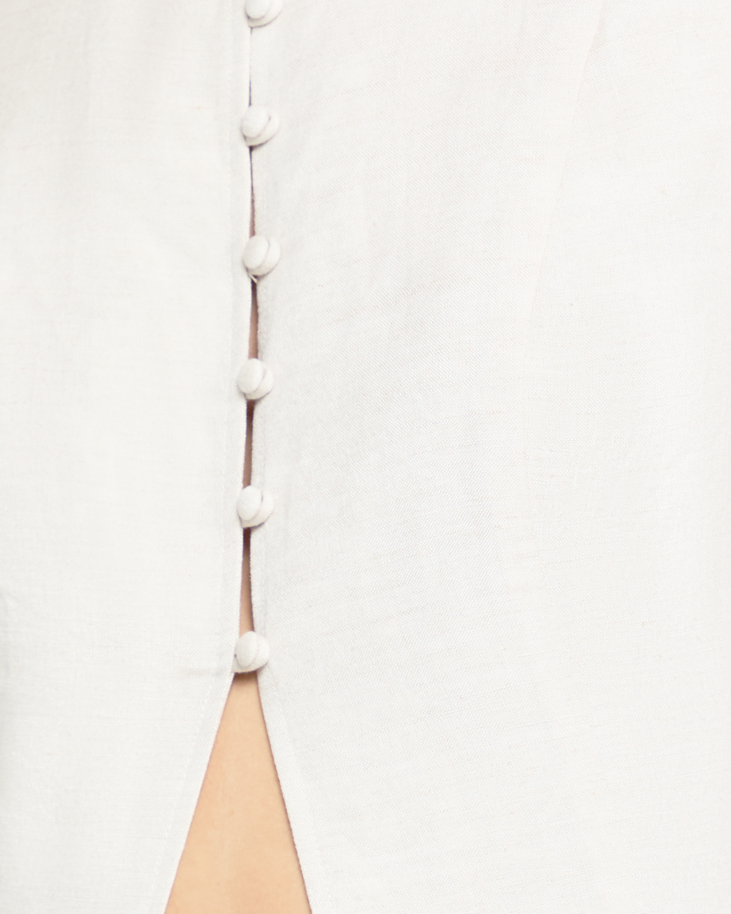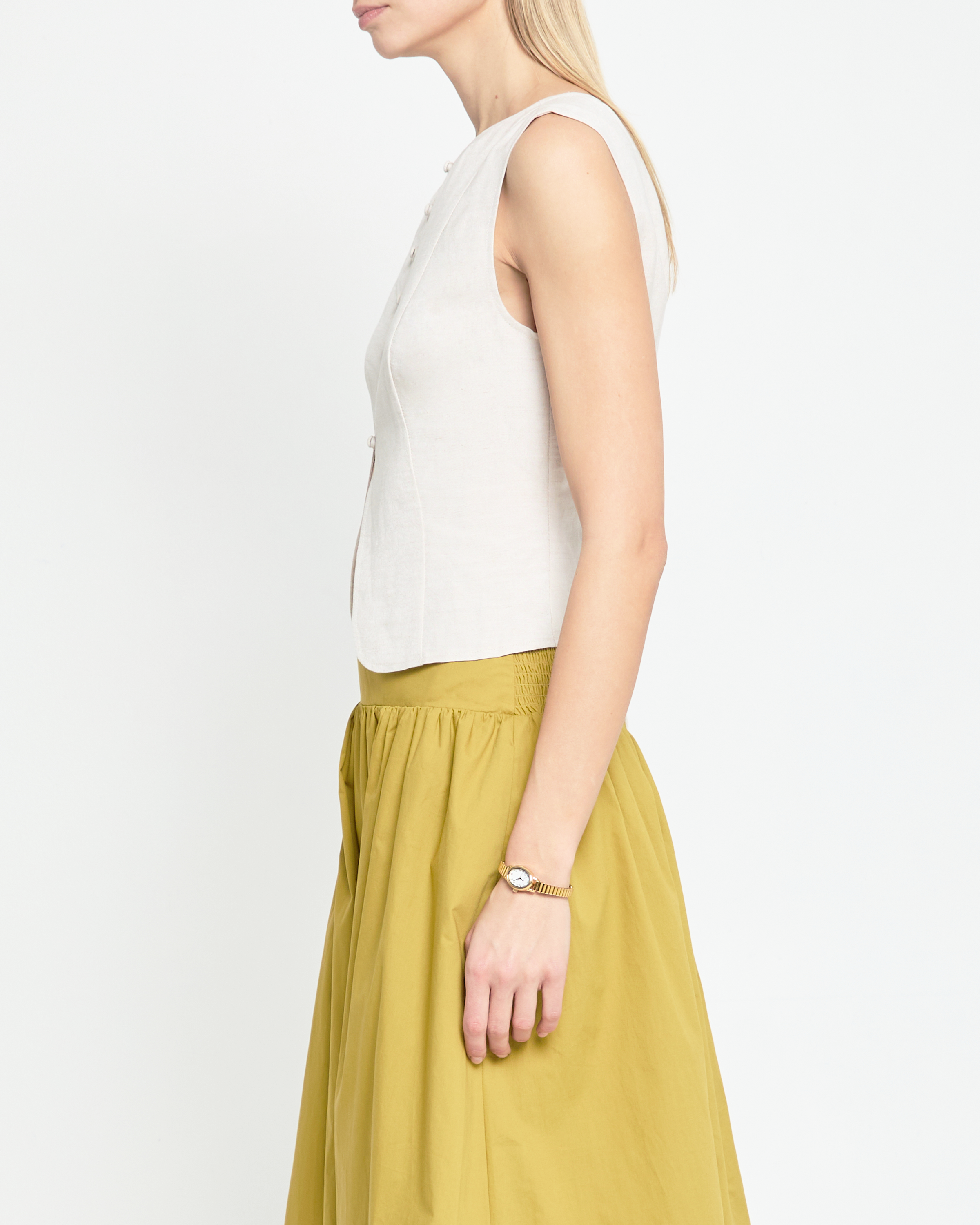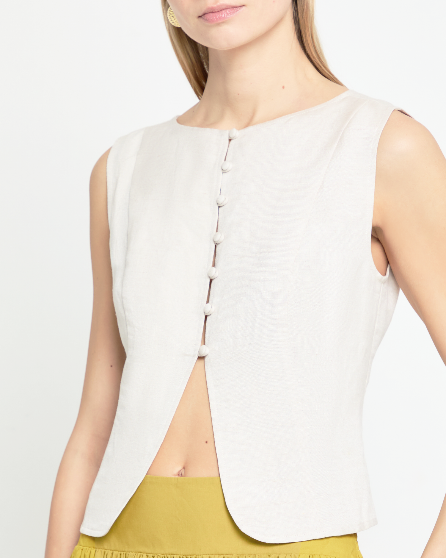 The Kenny Top features delicate covered buttons and an adjustable tie for a flattering fit. With a high neckline and easy neutral hue, this top is super versatile.