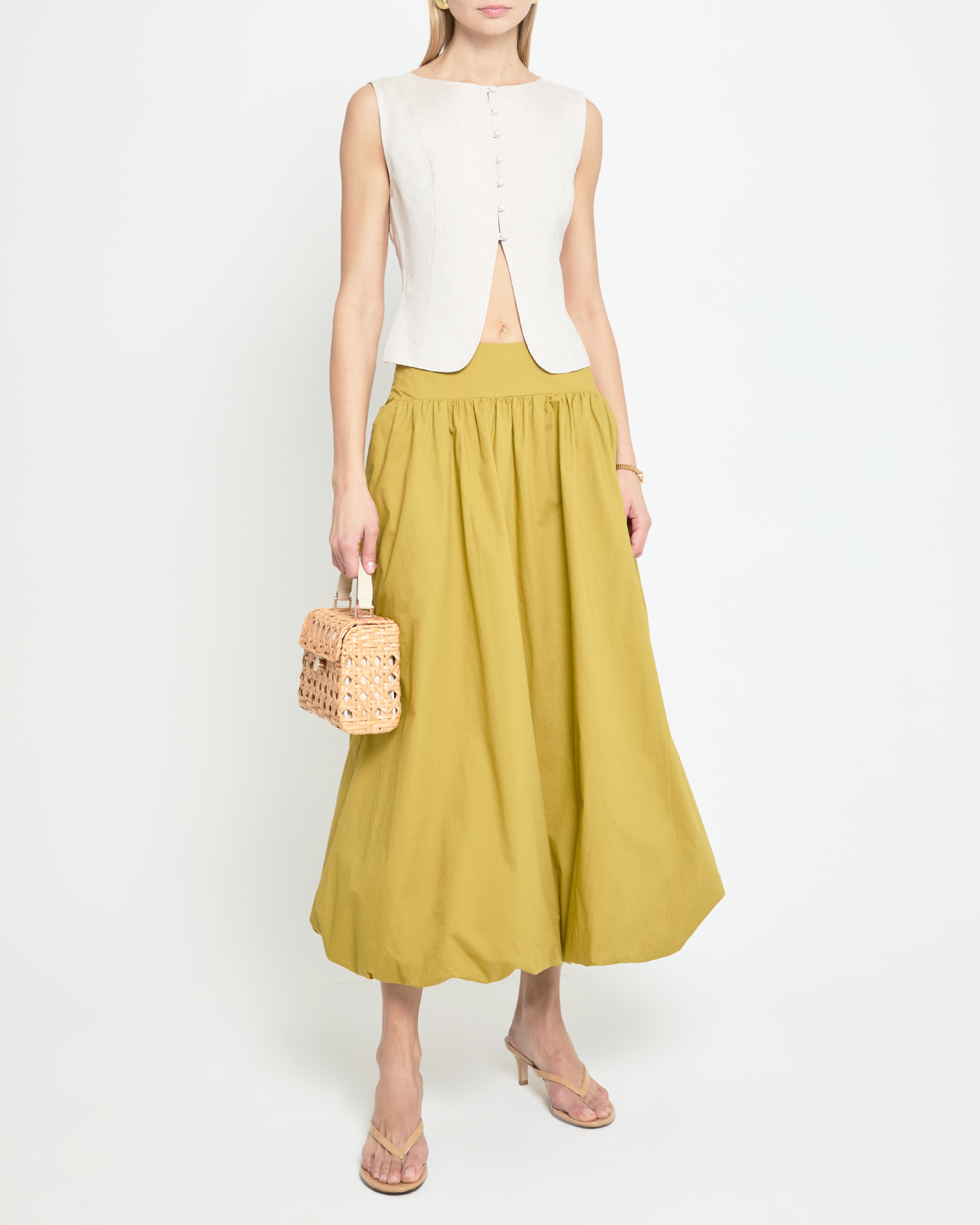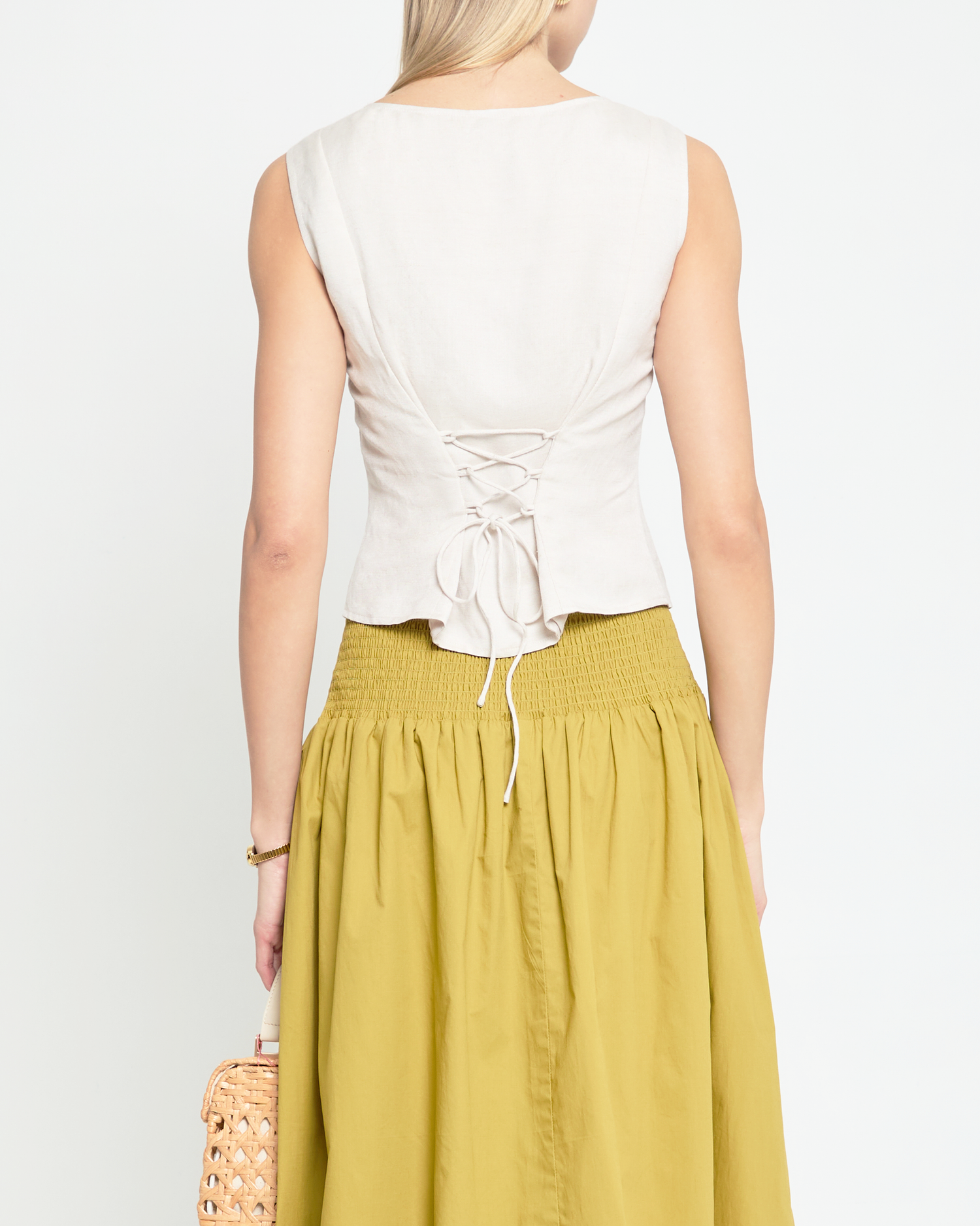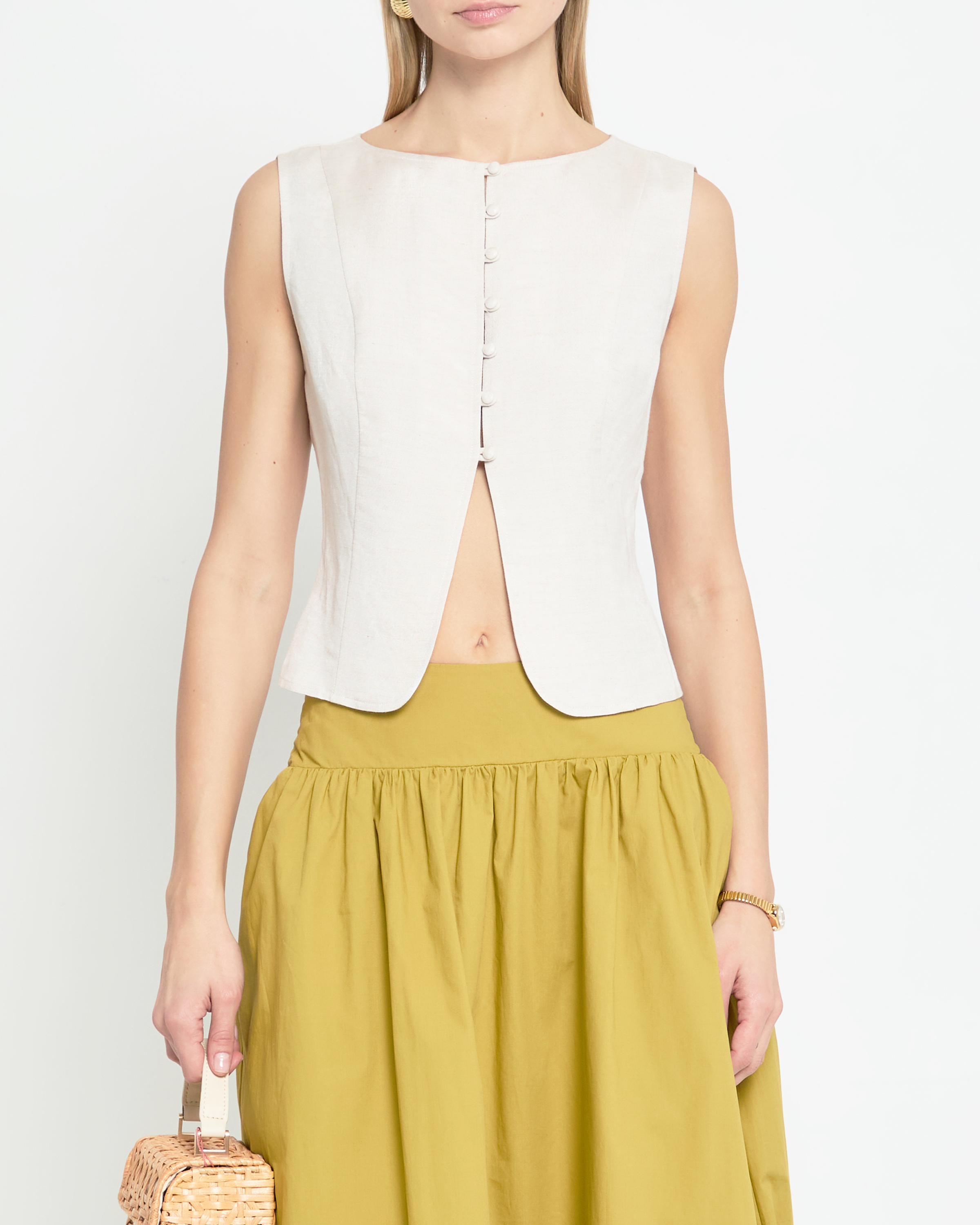 The Kenny Top features delicate covered buttons and an adjustable tie for a flattering fit. With a high neckline and easy neutral hue, this top is super versatile.
