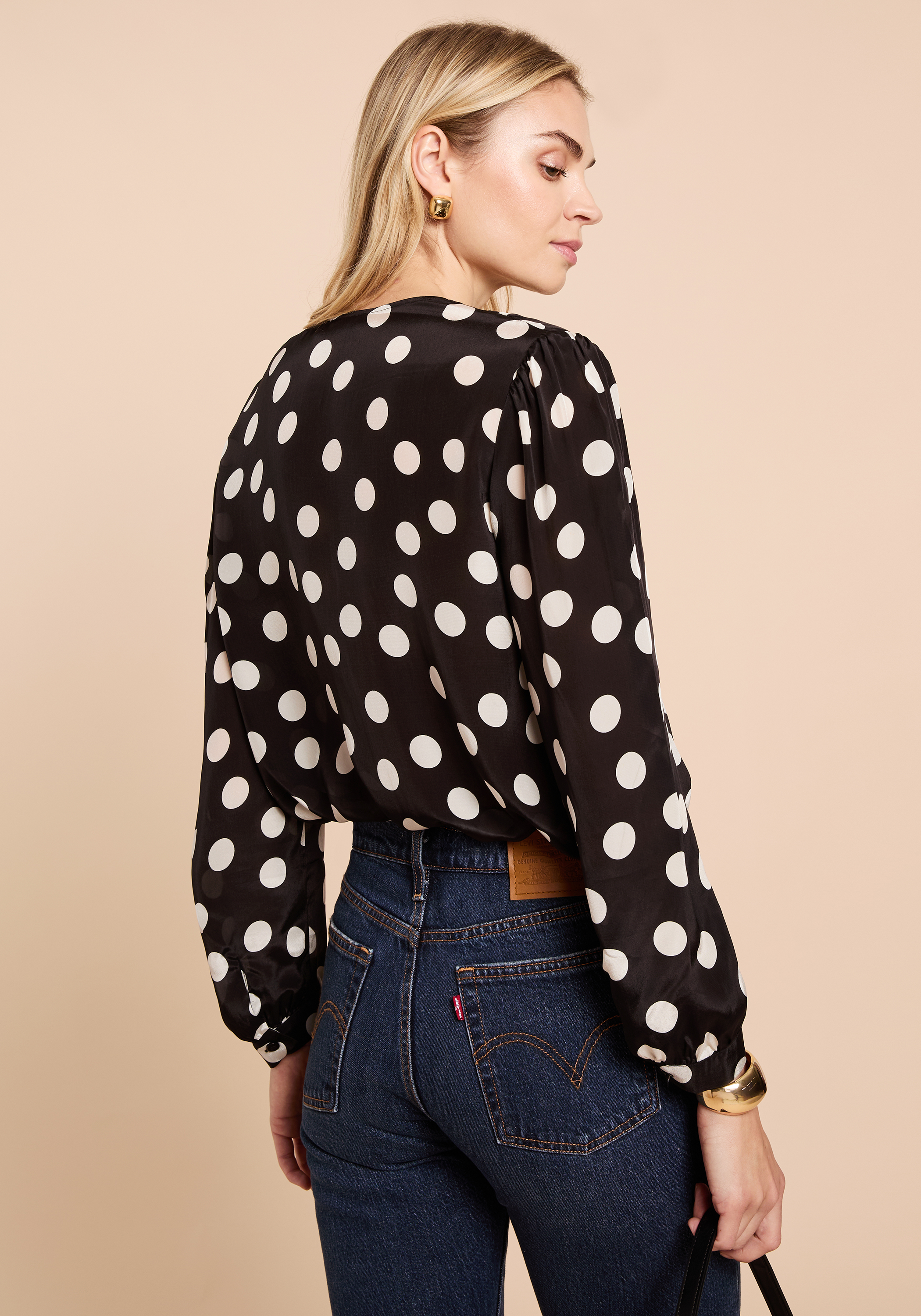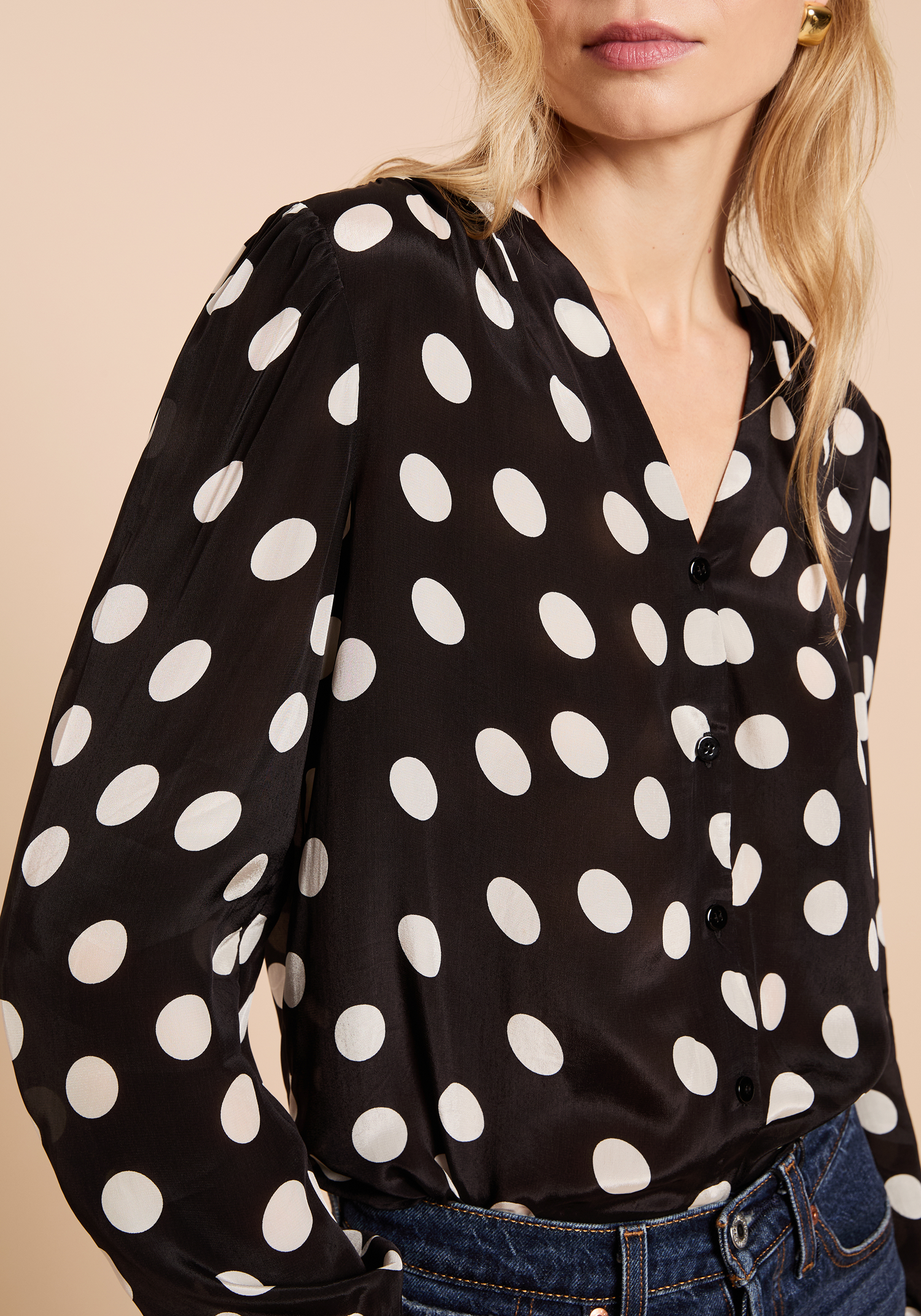 The Mima Top features a button-up design crafted from a light, silky fabric adorned with a classic polka-dot pattern. Its breathable material ensures comfort throughout the day, while the tailored fit offers a polished, put-together look suitable for both professional and casual settings.
