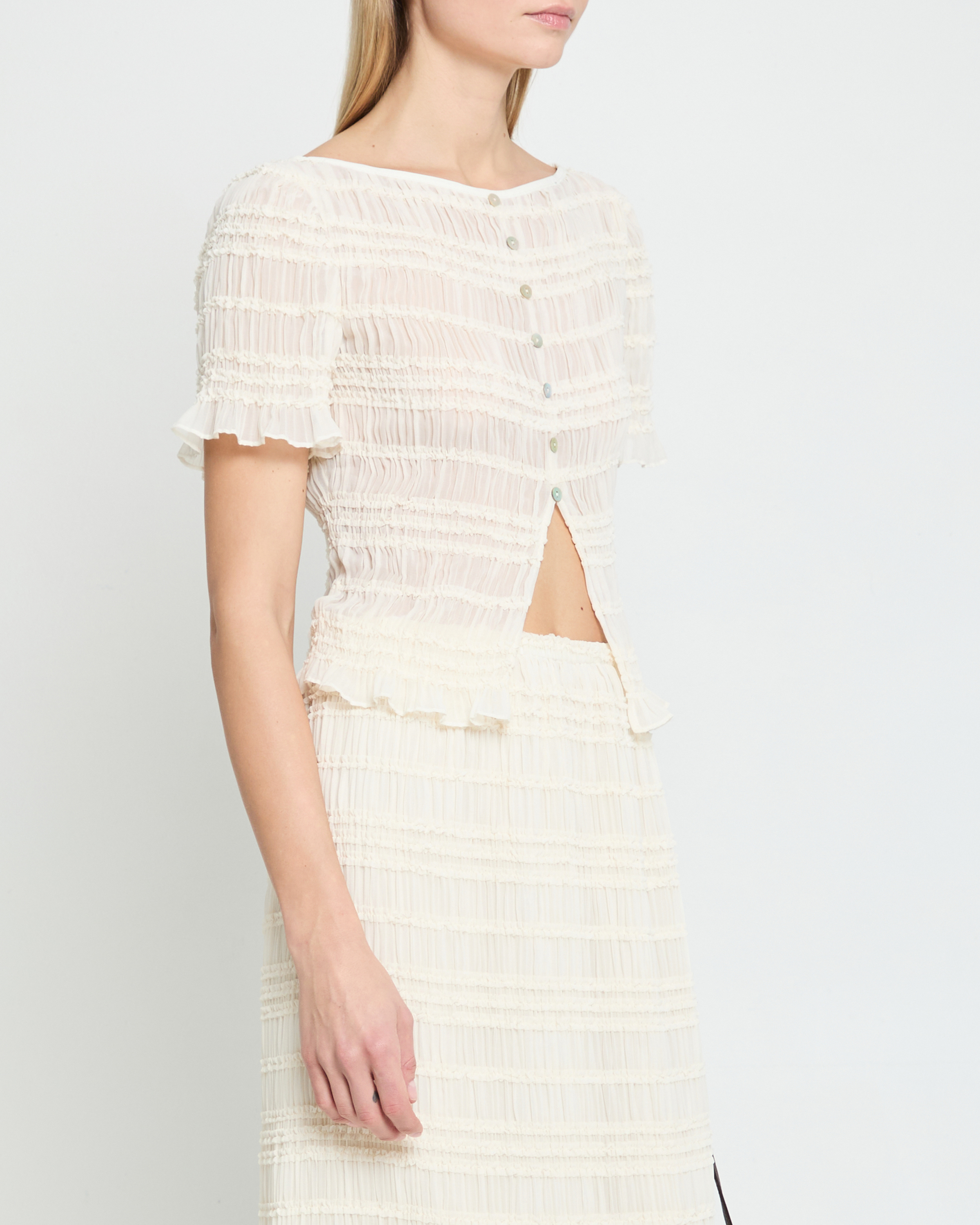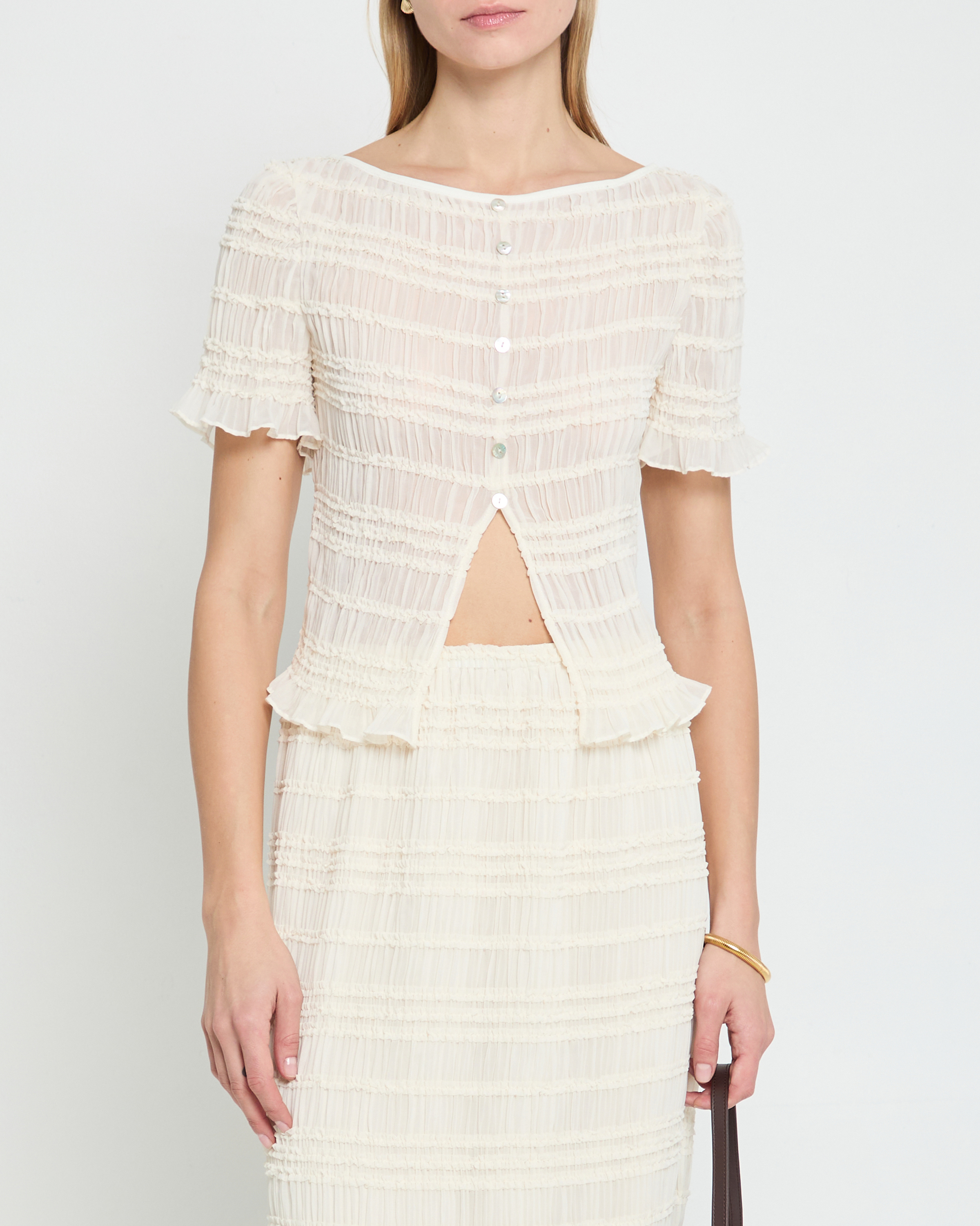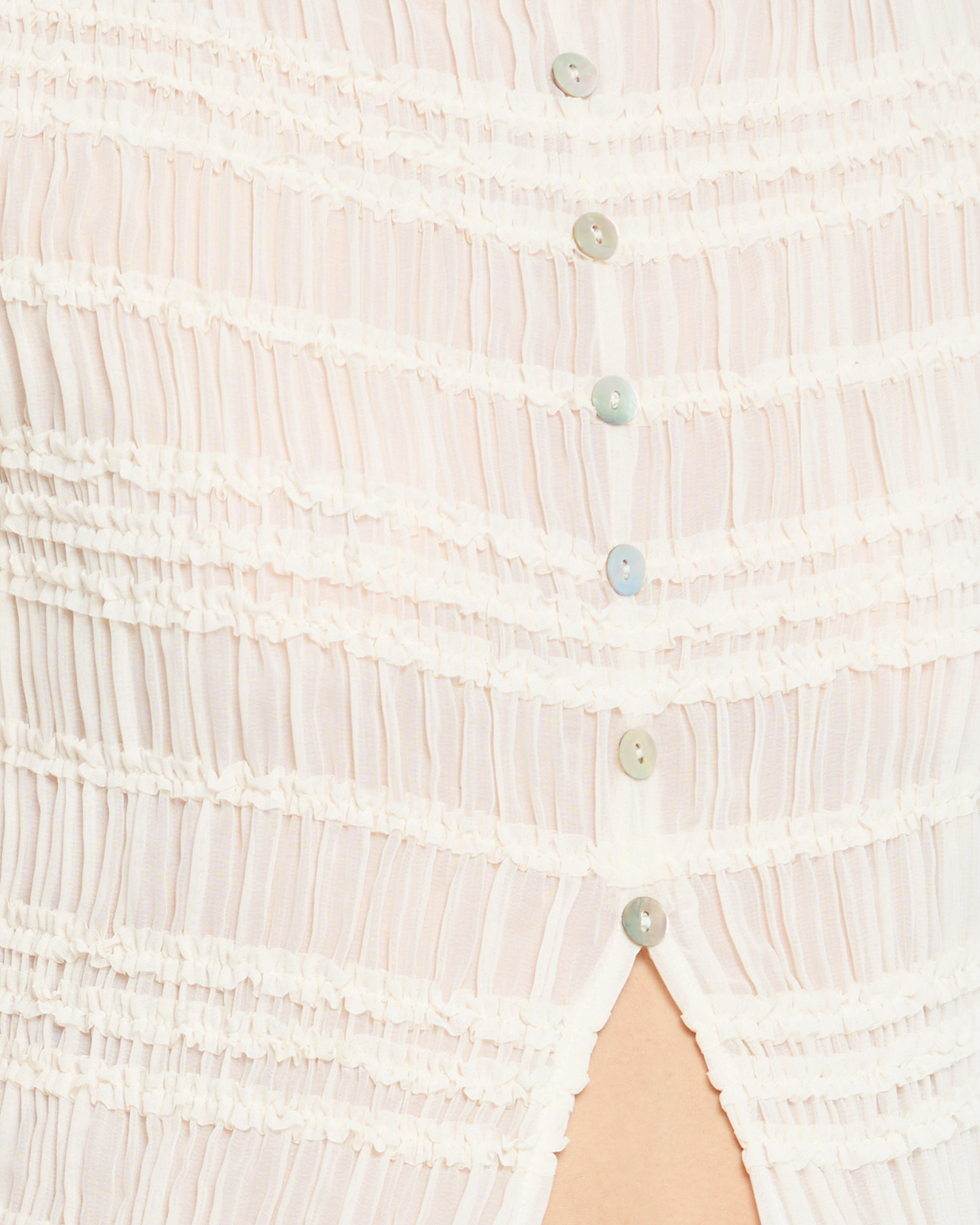 The Nyssa Top is expertly crafted with a light and airy cream material and charming smocking details. Delicate mother of pearl buttons add a touch of elegance to this romantic blouse.