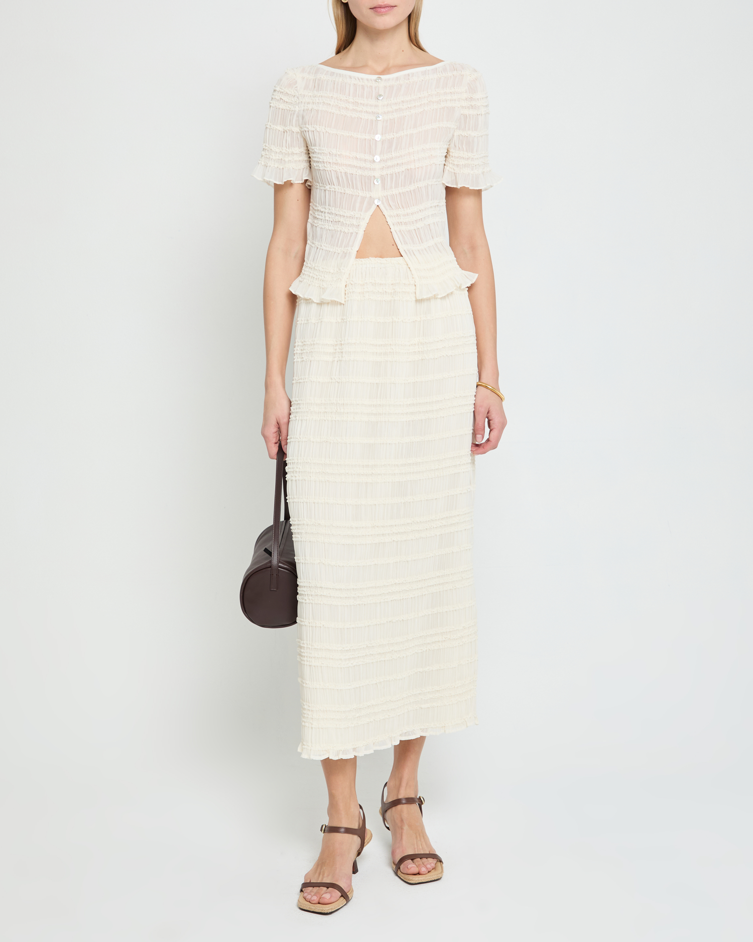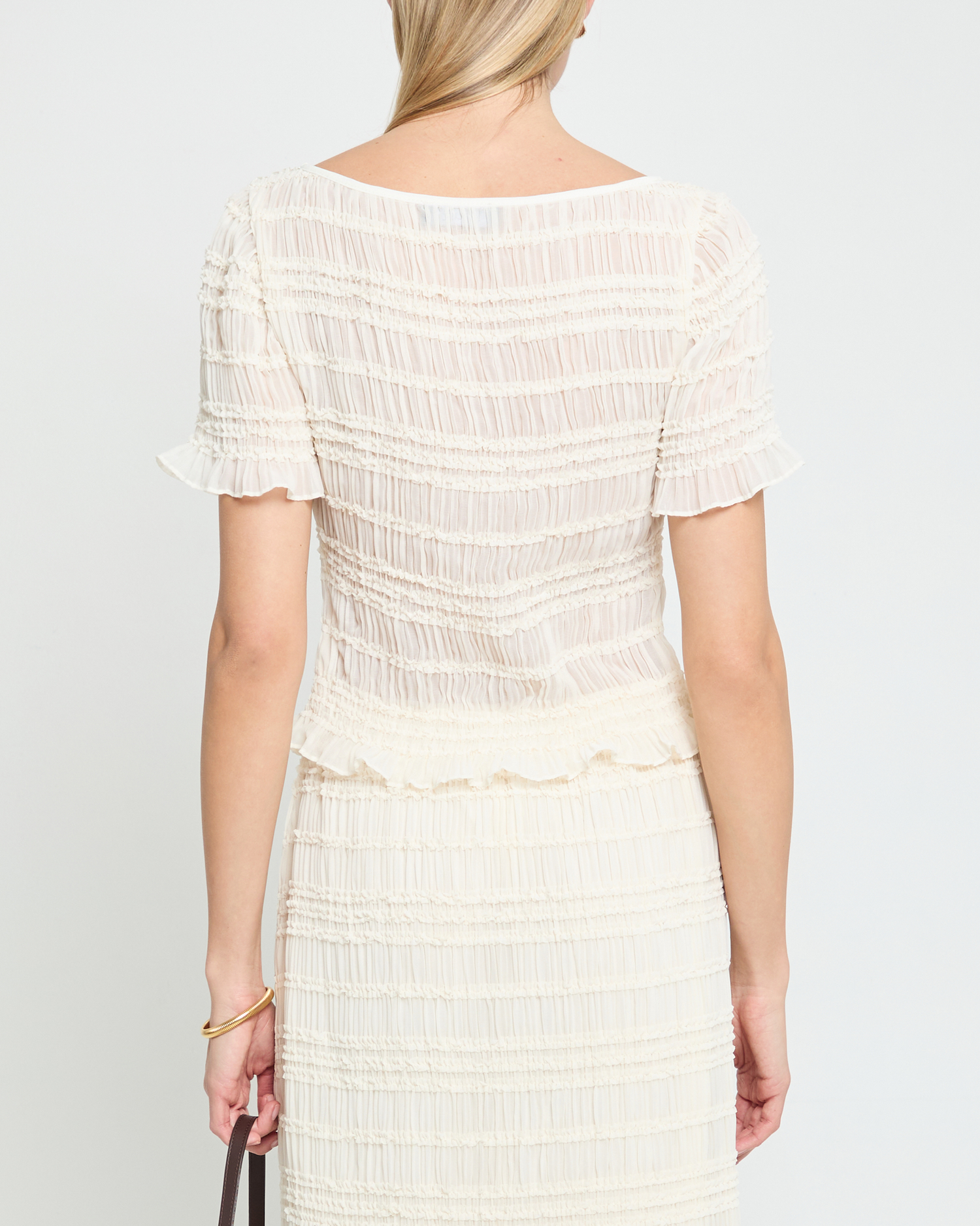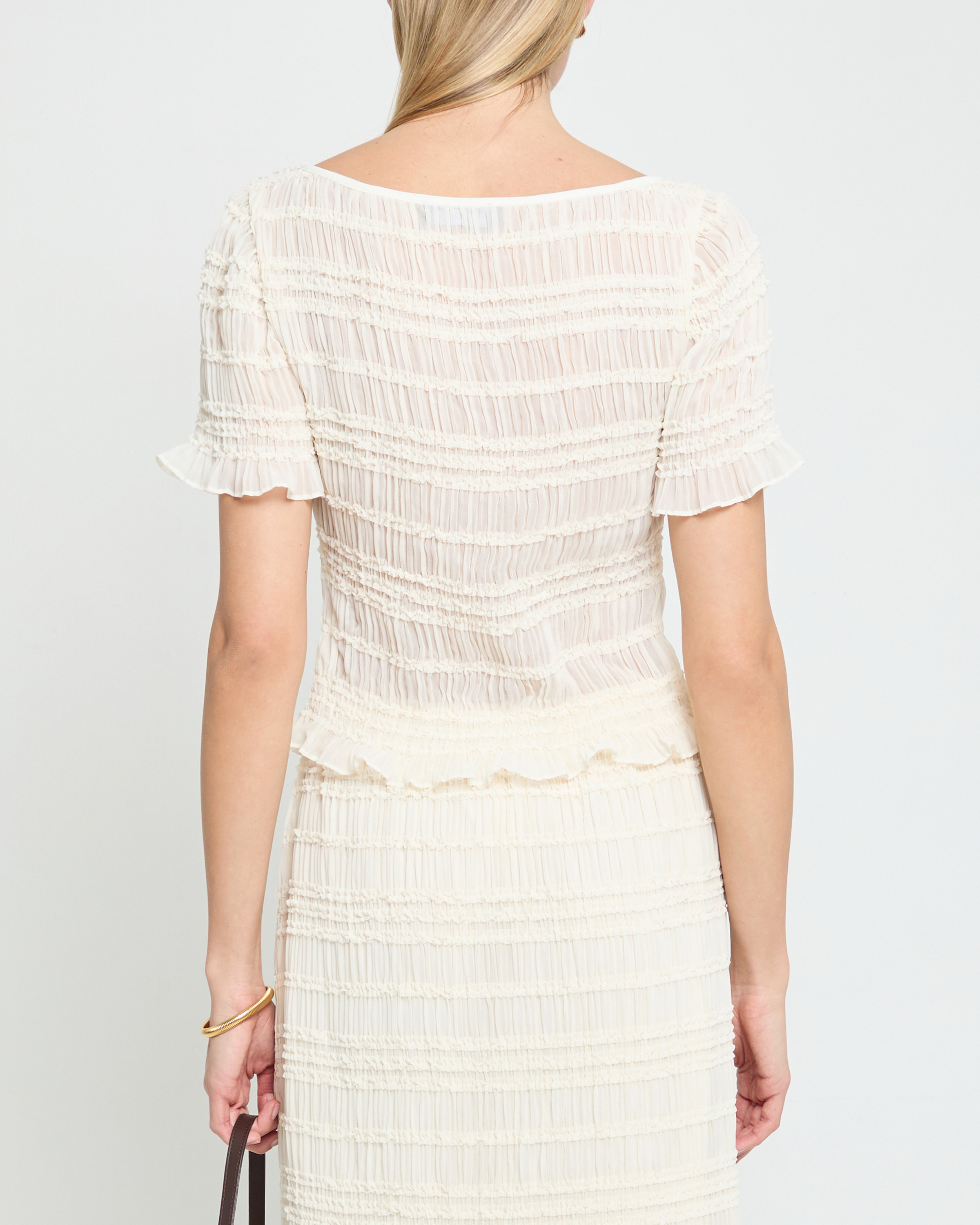 The Nyssa Top is expertly crafted with a light and airy cream material and charming smocking details. Delicate mother of pearl buttons add a touch of elegance to this romantic blouse.