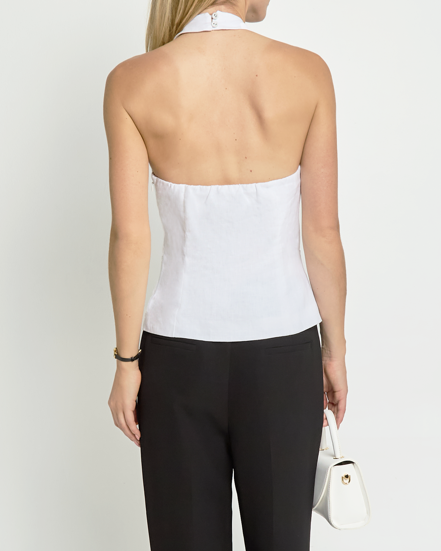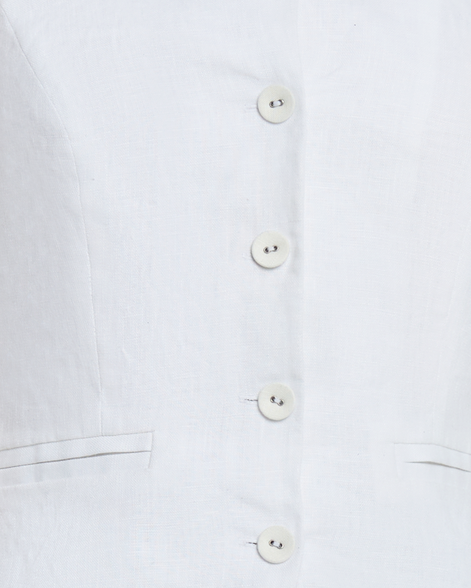 Upgrade your vest game with the Yvonne Linen Top. Its unique criss-cross design and open back silhouette set it apart from the rest. Enjoy the fresh linen feel and eye-catching matching buttons and pocket details. Elevate your style with this cool and versatile top.