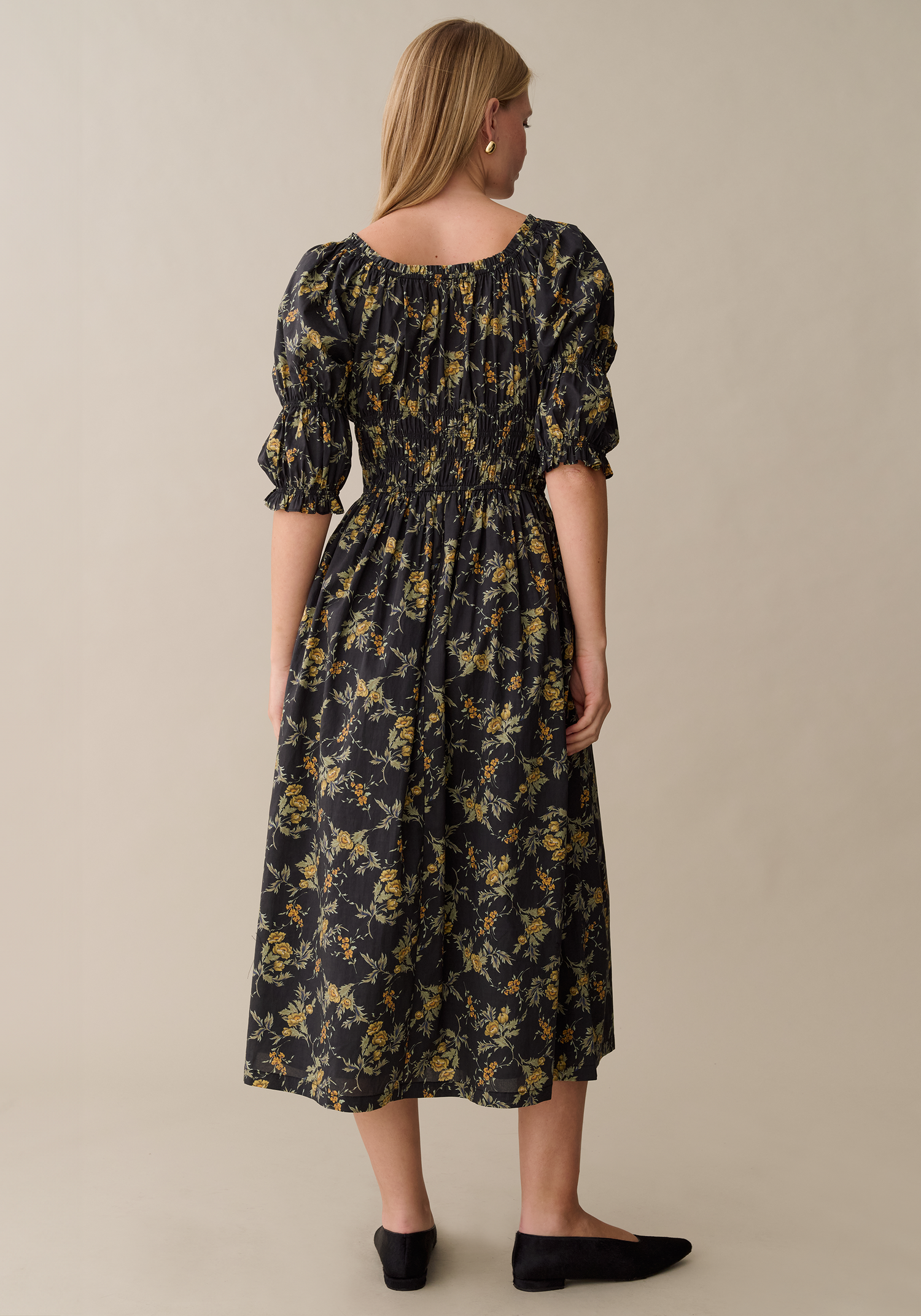 The Marguerite Cotton Dress features a flattering square neckline paired with elegant puff sleeves, creating a timeless silhouette. Its ruched bodice enhances the fit, while a charming tie detail adds a delicate touch.
