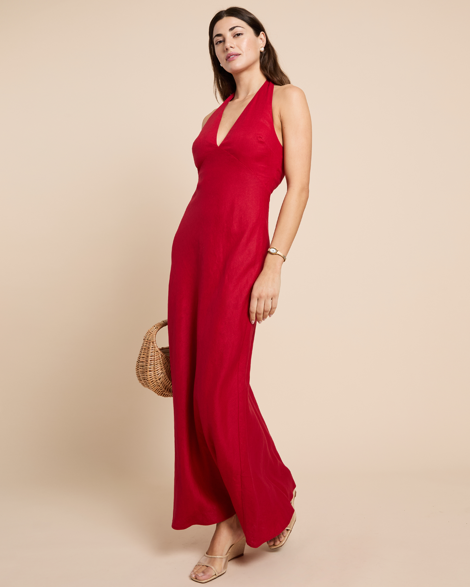The Ashlyn Linen Dress exudes simplicity and timelessness with its easy silhouette and halter neckline. The open back and delicate covered button details add a touch of elegance. Crafted from high-quality linen, this dress is both comfortable and stylish.