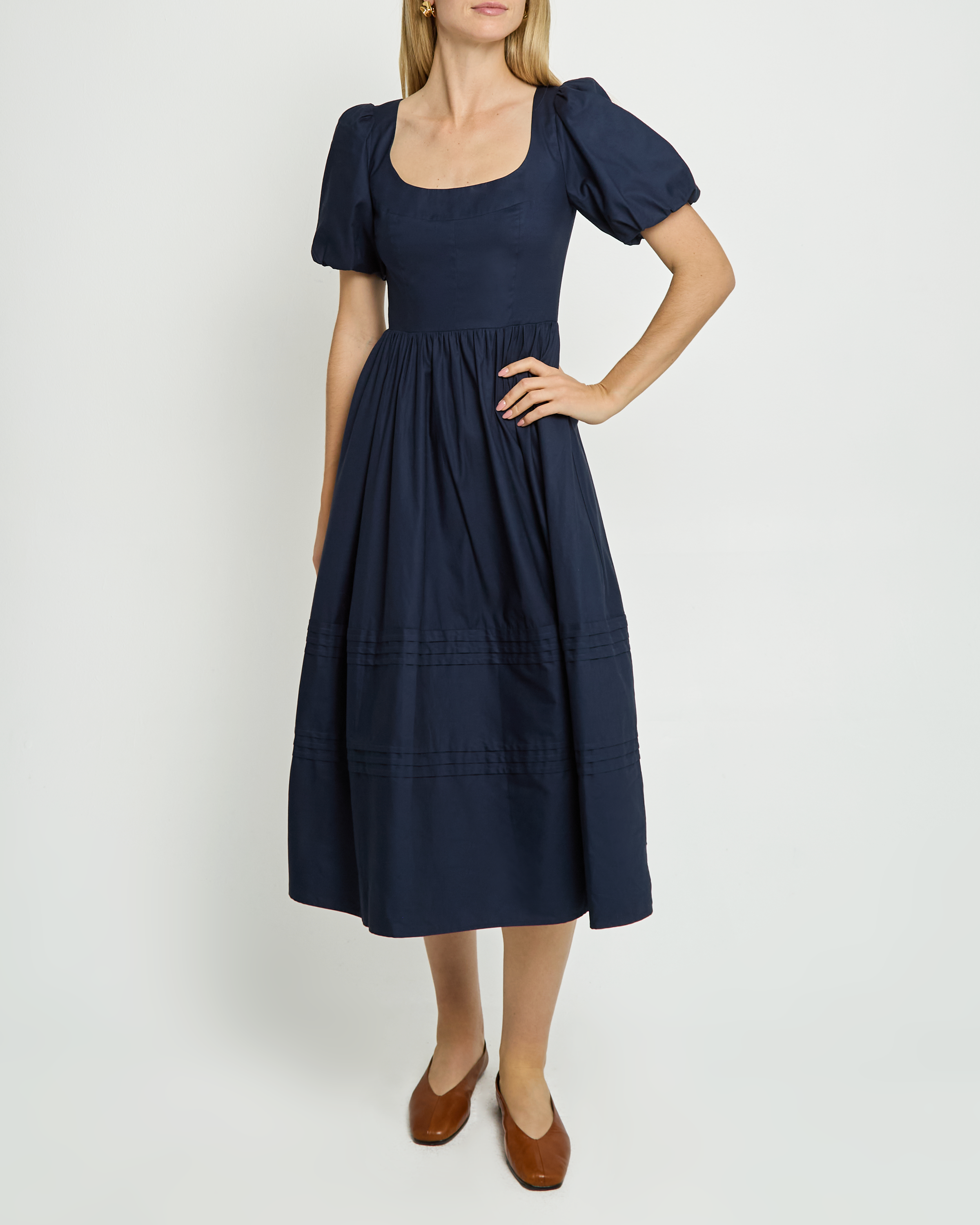 Expertly designed, the Aurelie Cotton Dress boasts a flattering scoop neck and fitted waist. The gorgeous pleated details on the skirt add a touch of classic romance to this versatile dress. Perfect for any occasion, this dress is sure to make a statement.