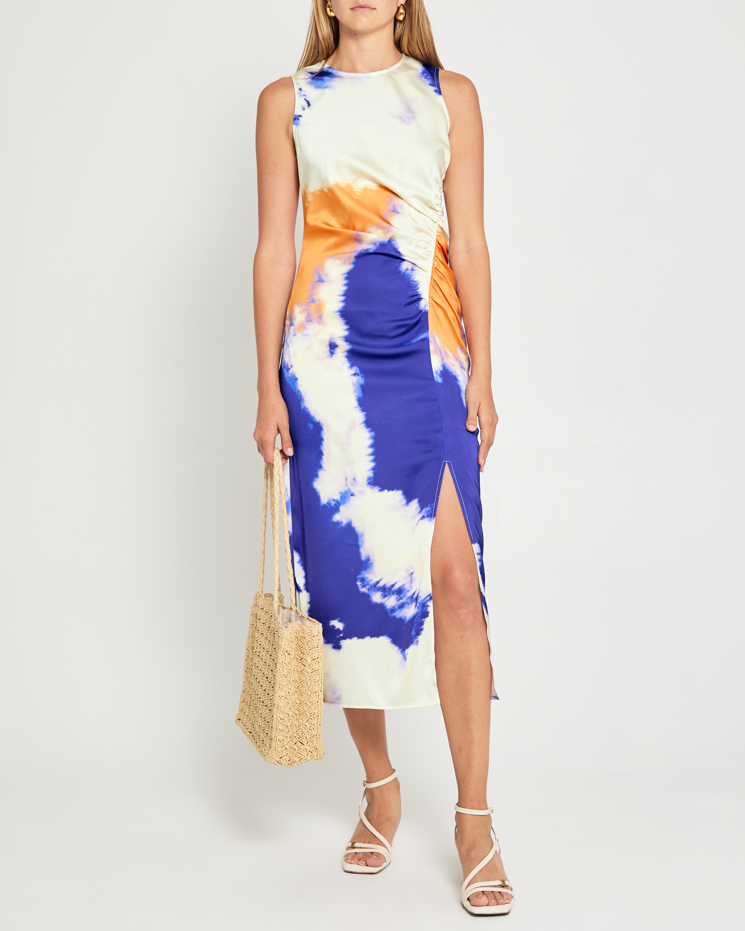 The Waverly Dress boasts a high neckline and flattering front ruching, creating a sleek and sophisticated silhouette. Its silky material is both luxurious and comfortable. With a fun and colorful print and a side slit, this dress is perfect for any occasion.