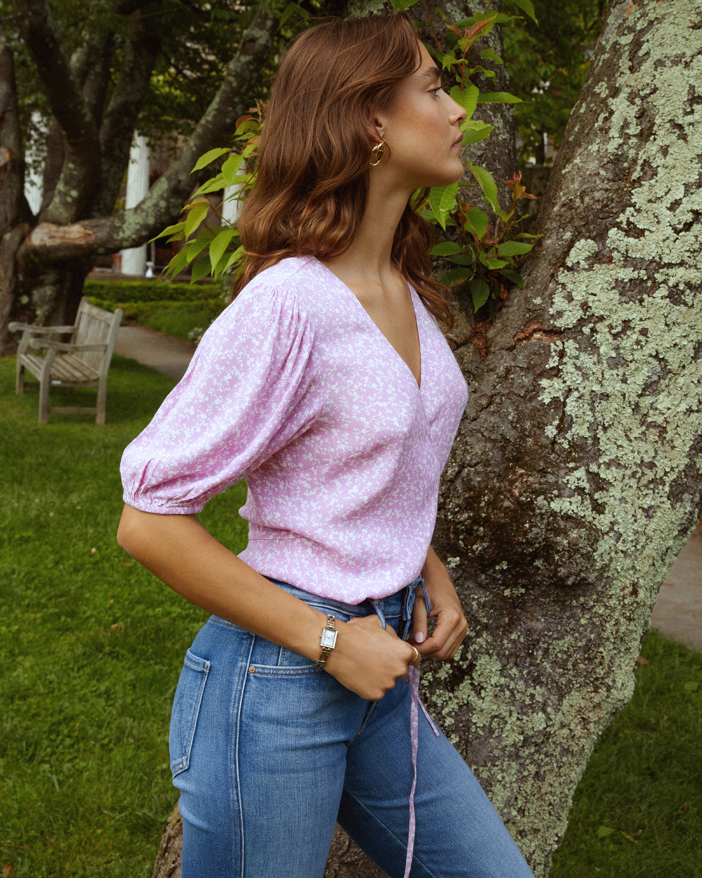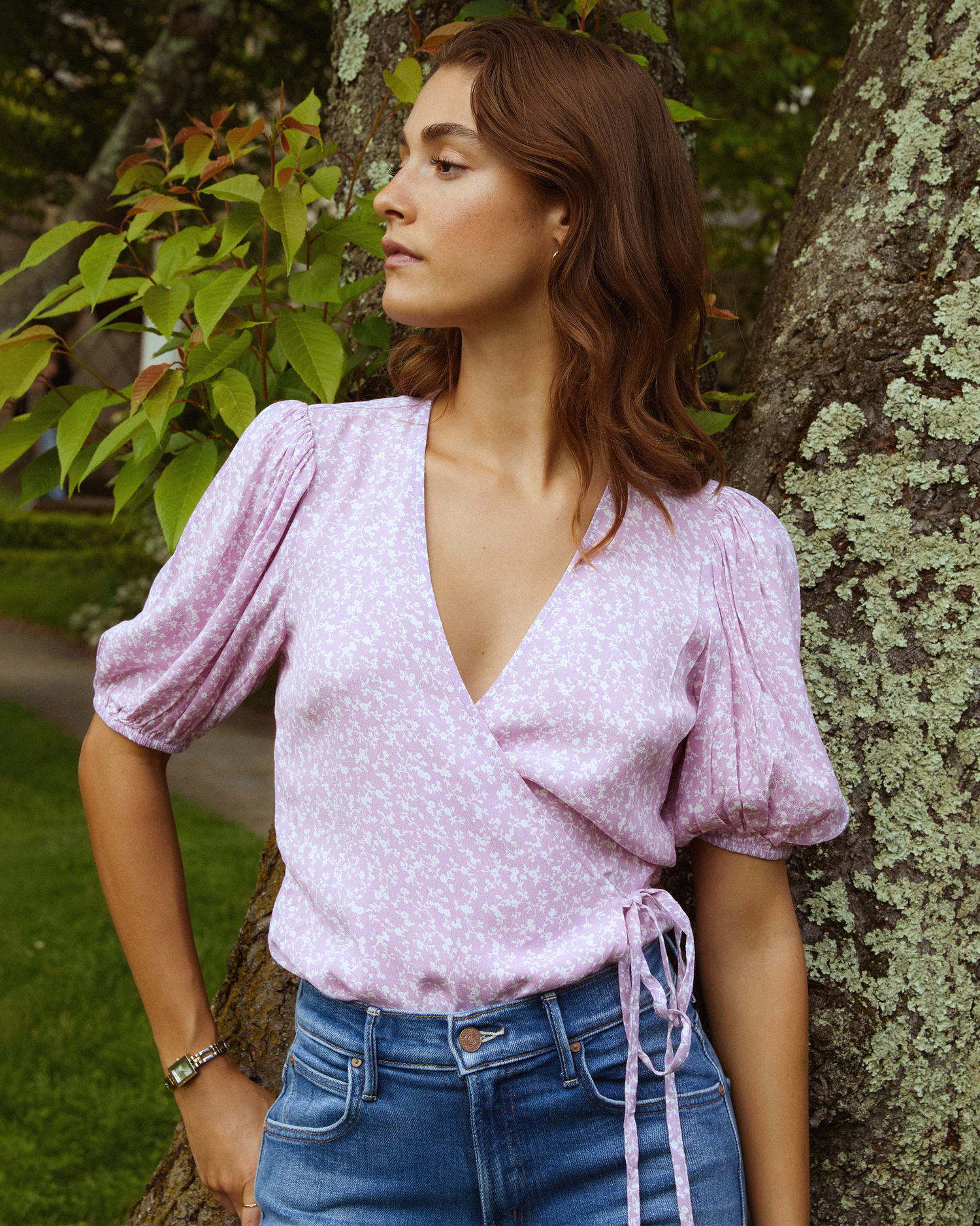 The Akari Top boasts delicate puff sleeves and a flattering V-neckline. Its wrap style and waist tie offer an adjustable fit for all body types. Finished in a sweet lavender print, this top is perfect for adding a touch of charm to any outfit.
