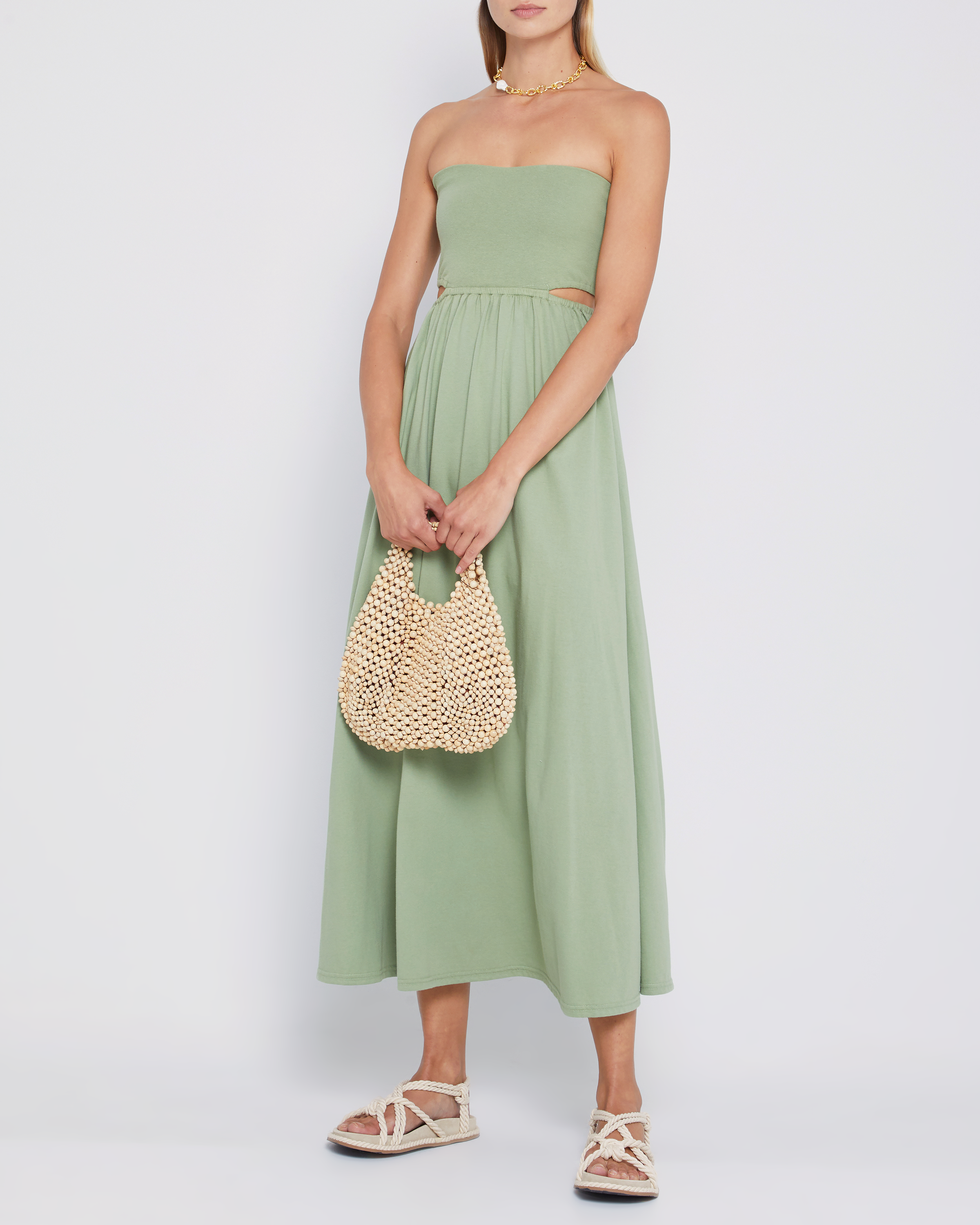 This effortless dress is done in fresh cotton with an easy smocked bodice. Elevate with cute, cut out details and a long, breezy skirt.