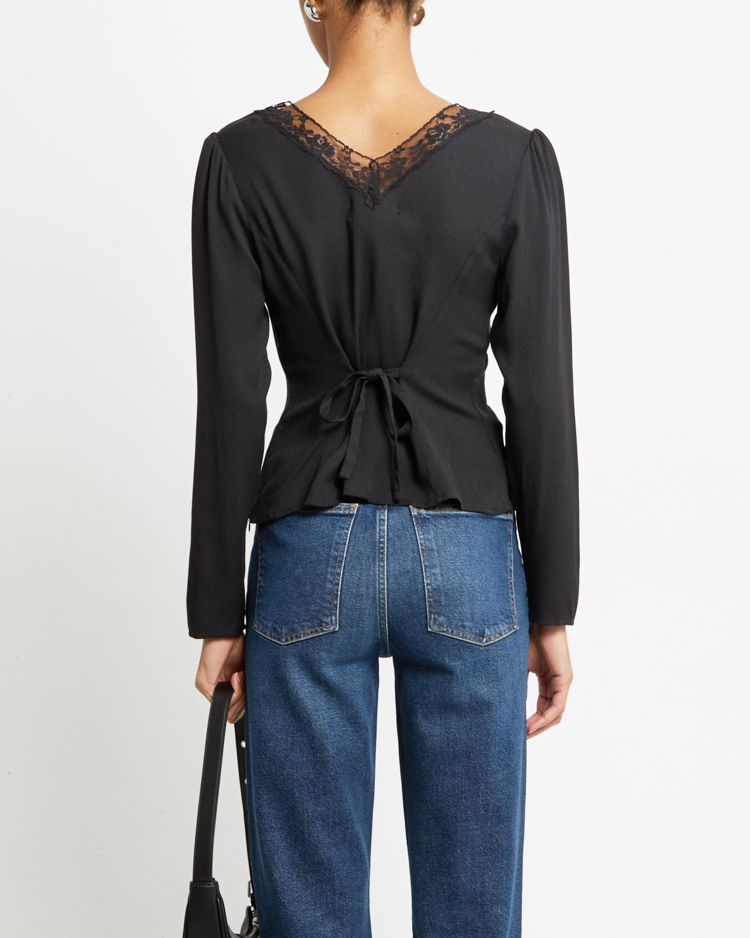 Add a touch of charm to your wardrobe with our Ambrosia Top. Featuring delicate lace trim and a button-up design, this long sleeve top is both versatile and charming. The back tie detail allows for an adjustable fit, making it a perfect addition to any outfit.