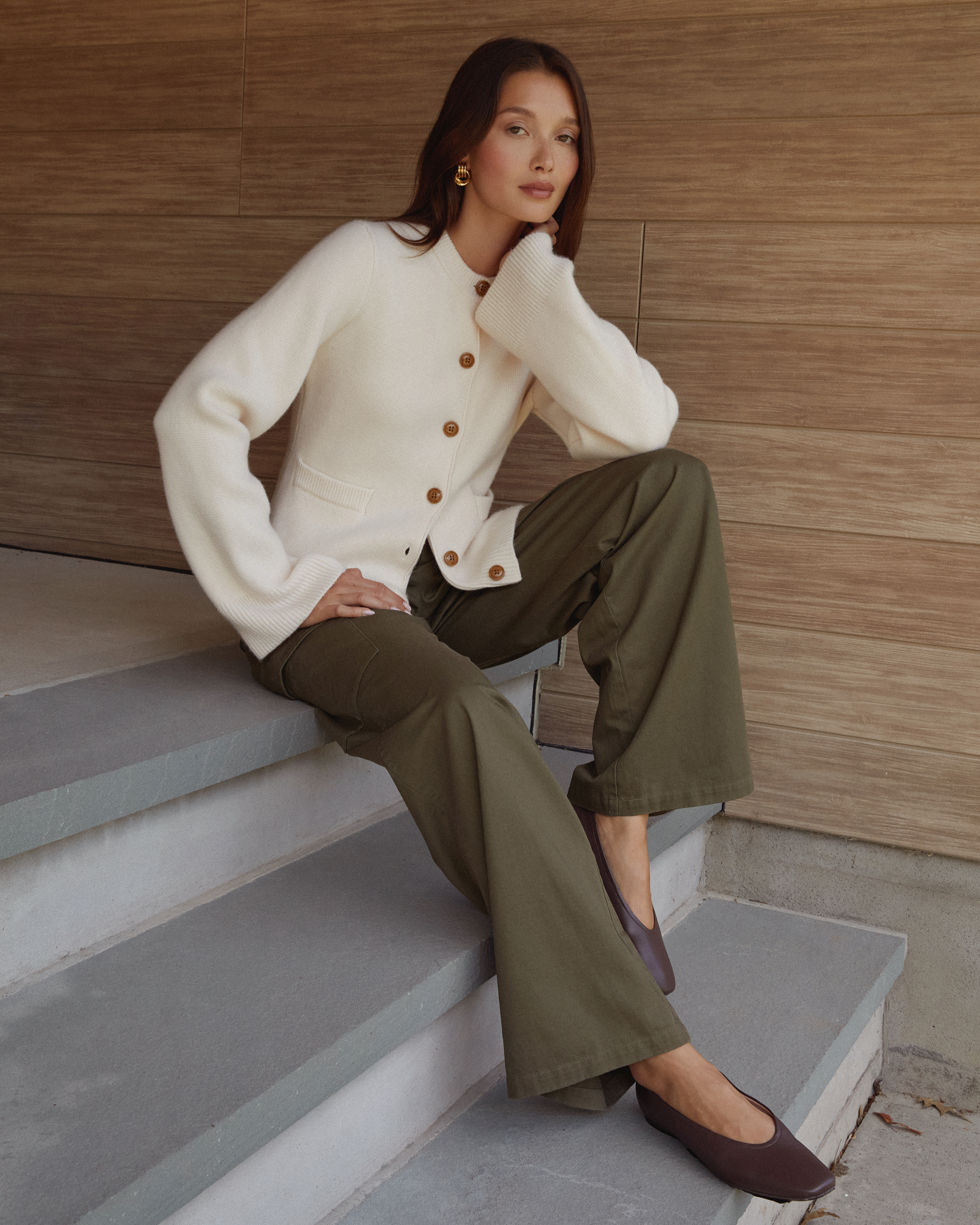 The Averie Cardigan boasts wooden buttons and a wool cashmere blend for a luxurious feel. Its super soft material combined with long bell sleeves and a flattering silhouette make it a must-have for both comfort and style. Upgrade your wardrobe with this elegant piece.