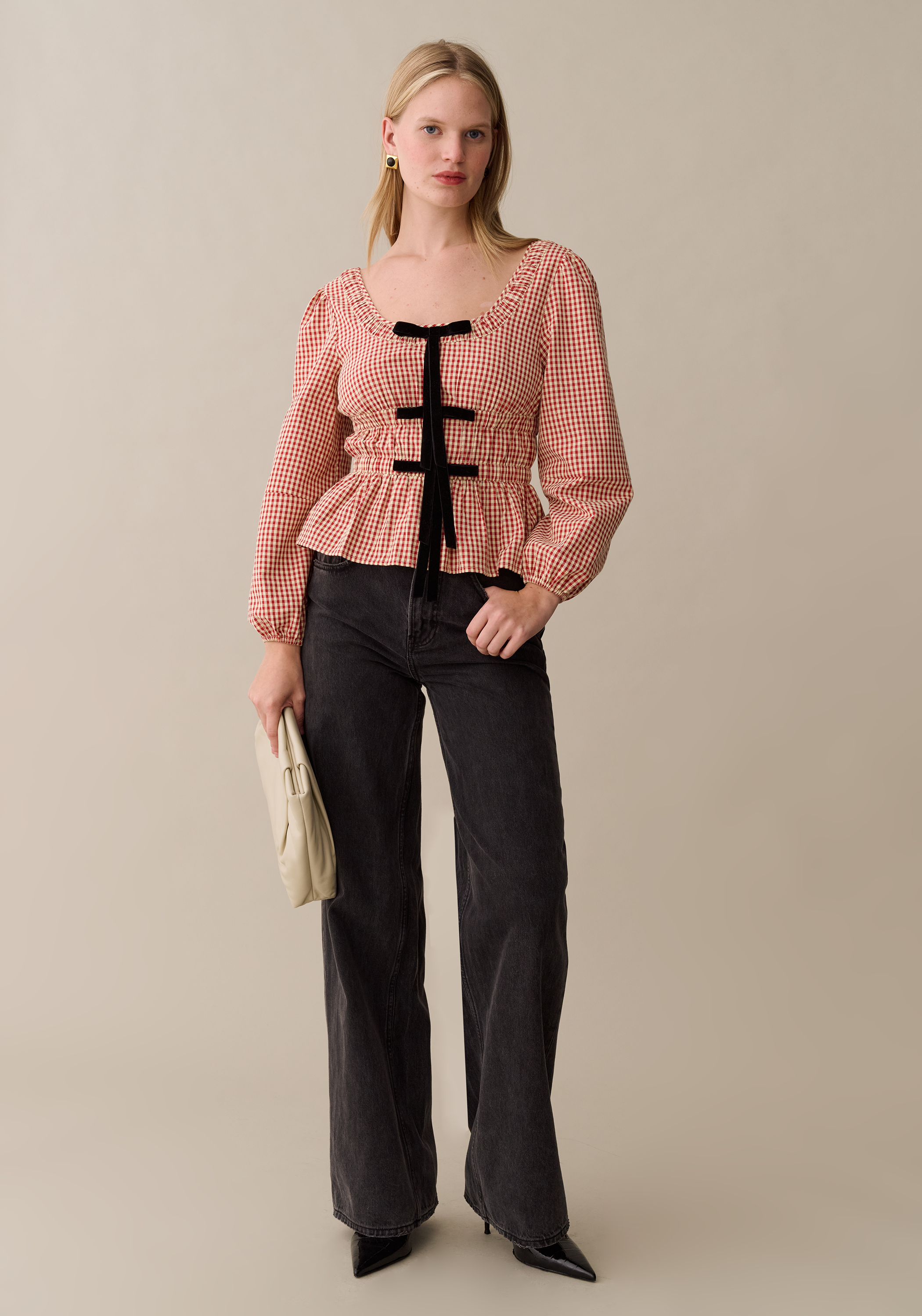 This gingham blouse is finished with velvet bow accents that add a sweet, vintage-inspired touch. A softly cinched waist and peplum hem create a flattering silhouette, while puff sleeves offer a bit of volume and romance. Playful yet polished, it’s an easy standout for everyday dressing.