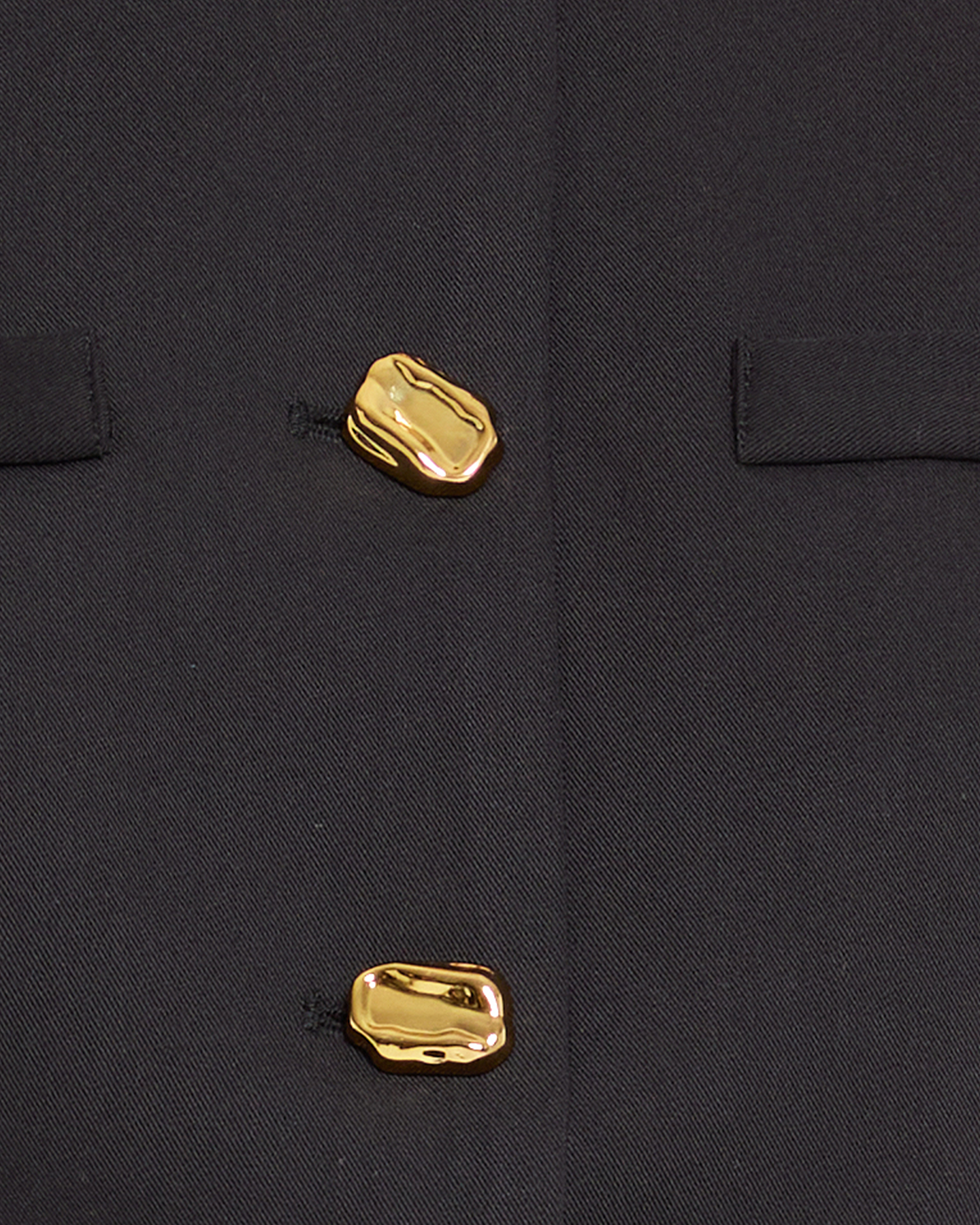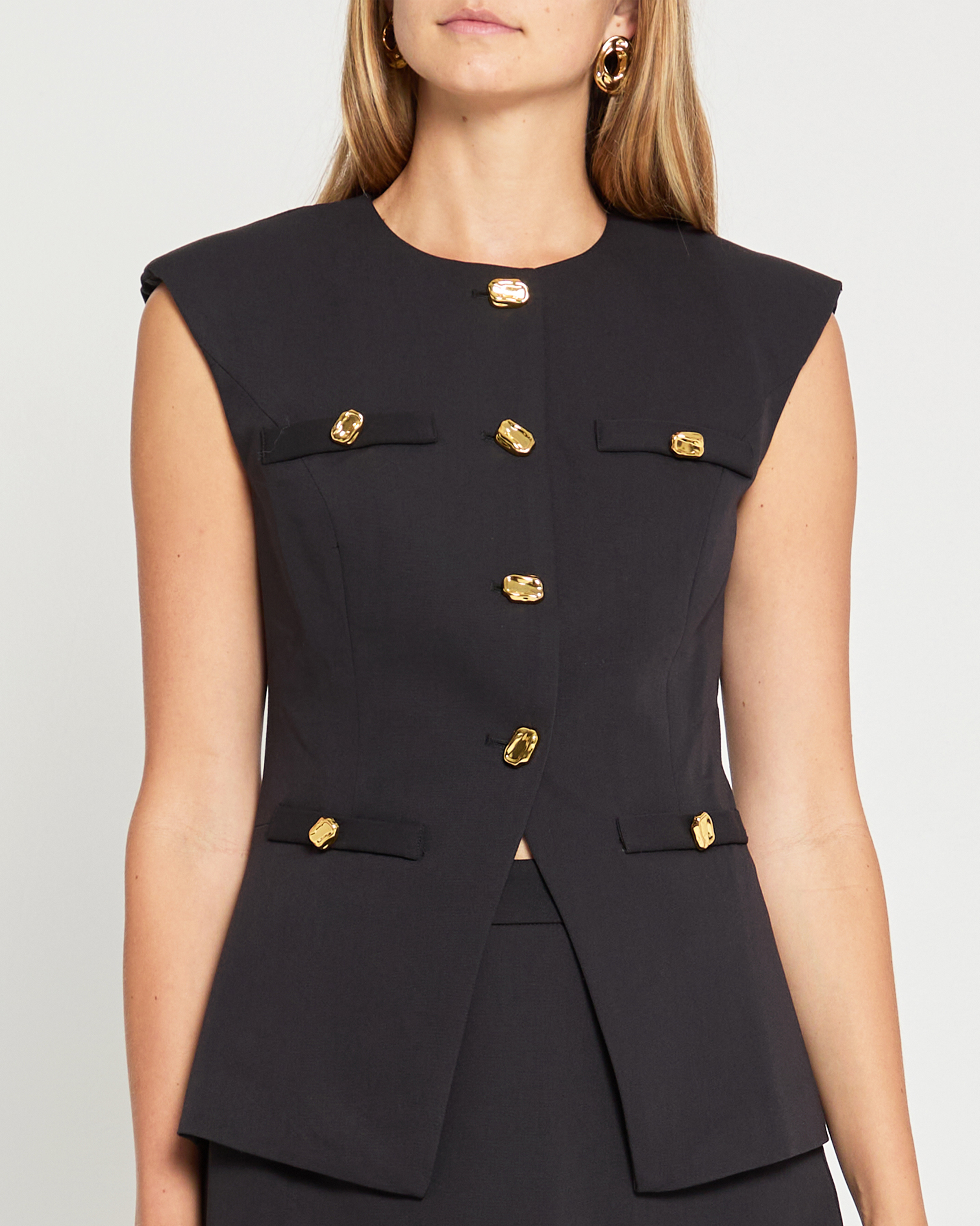 Introducing the Claudia Set Top - a chic and structured vest with sculptural gold buttons and a classic button up front. This cool top is perfect for any occasion, giving you a super sophisticated, put-together look.