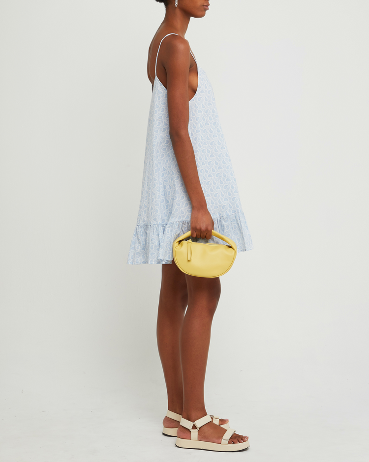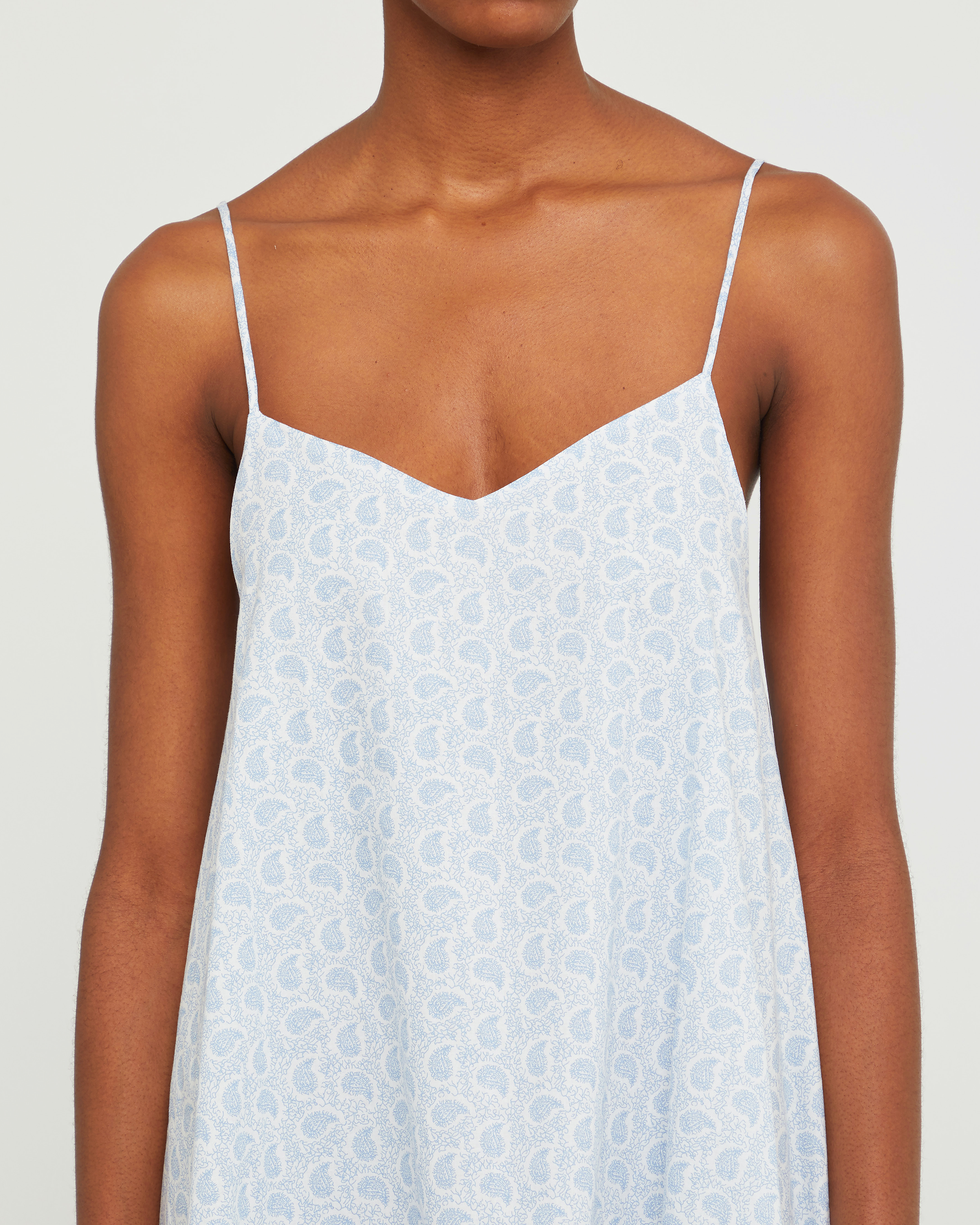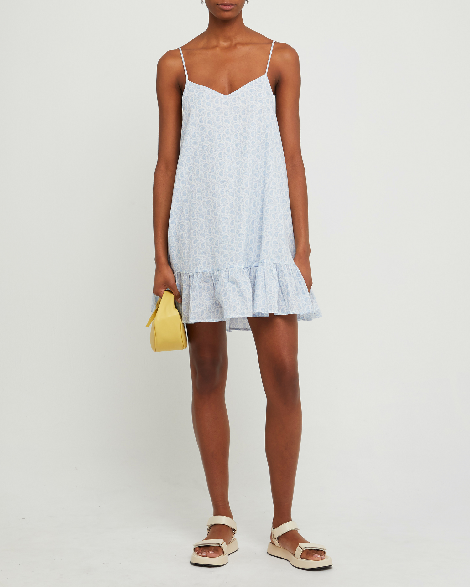 A cute slip dress that features spaghetti straps, v-neckline, and a hemline with ruching.