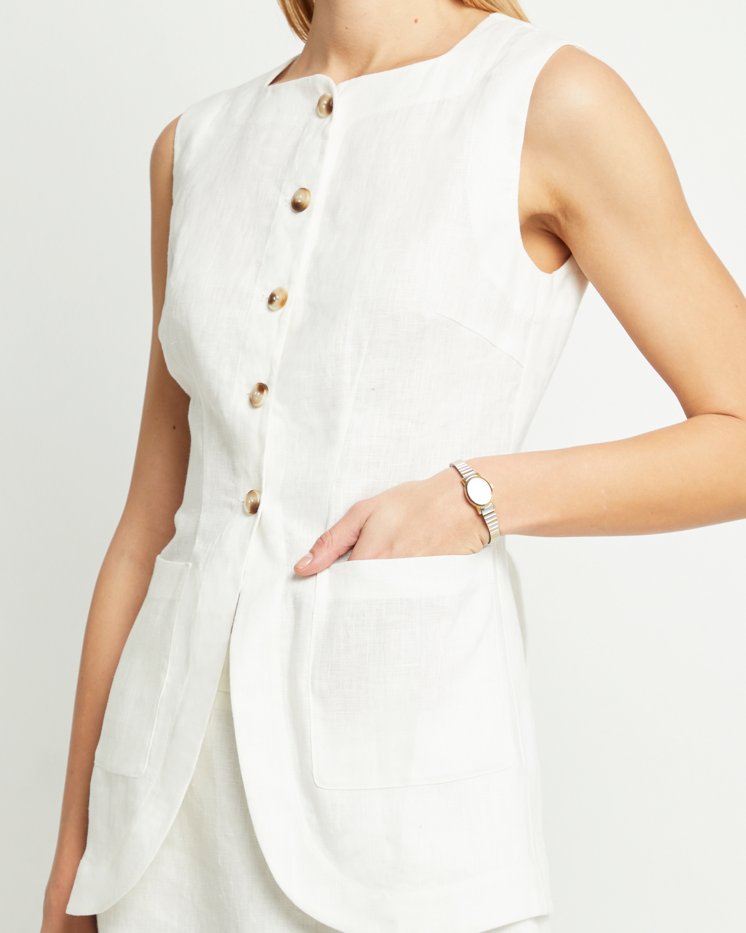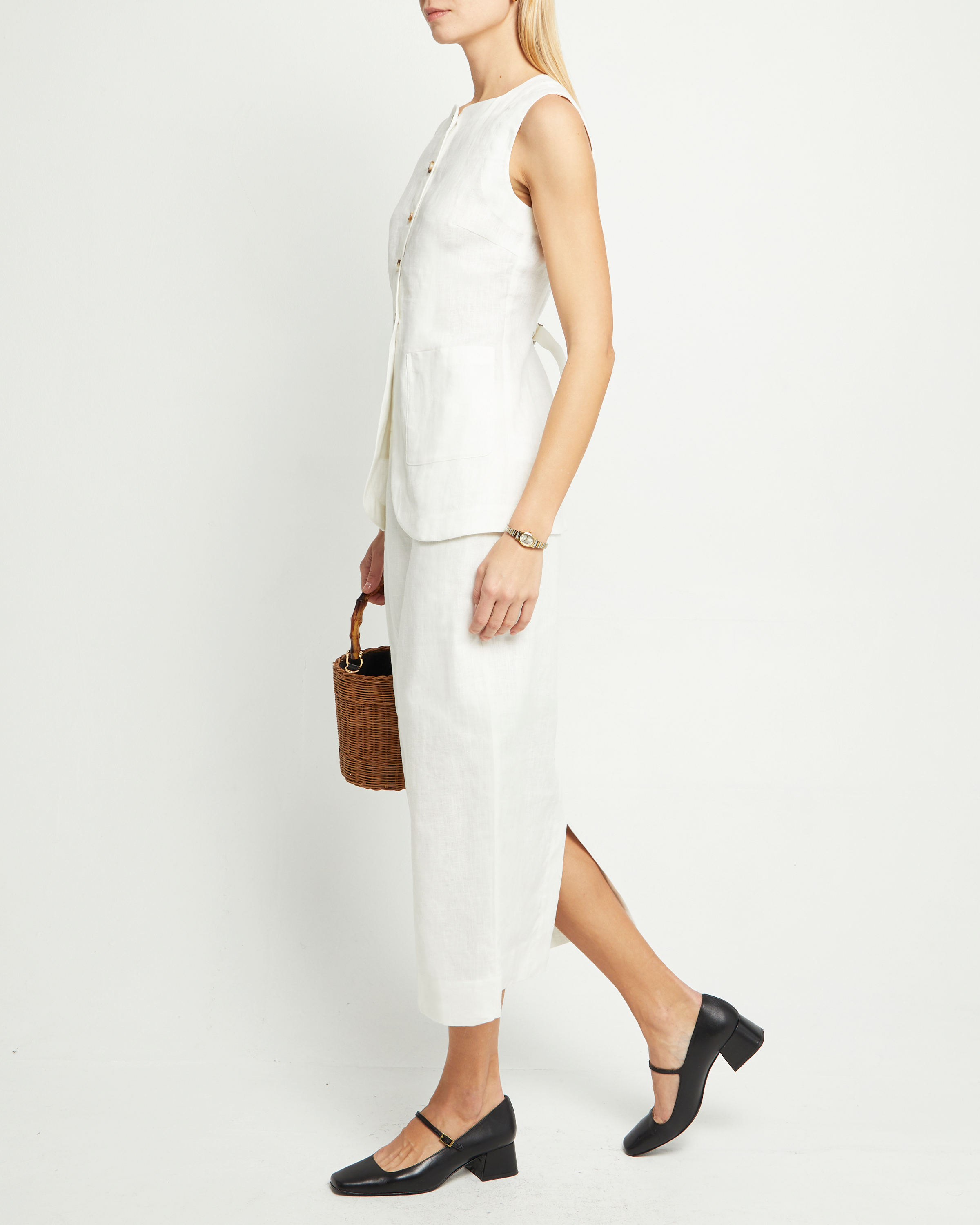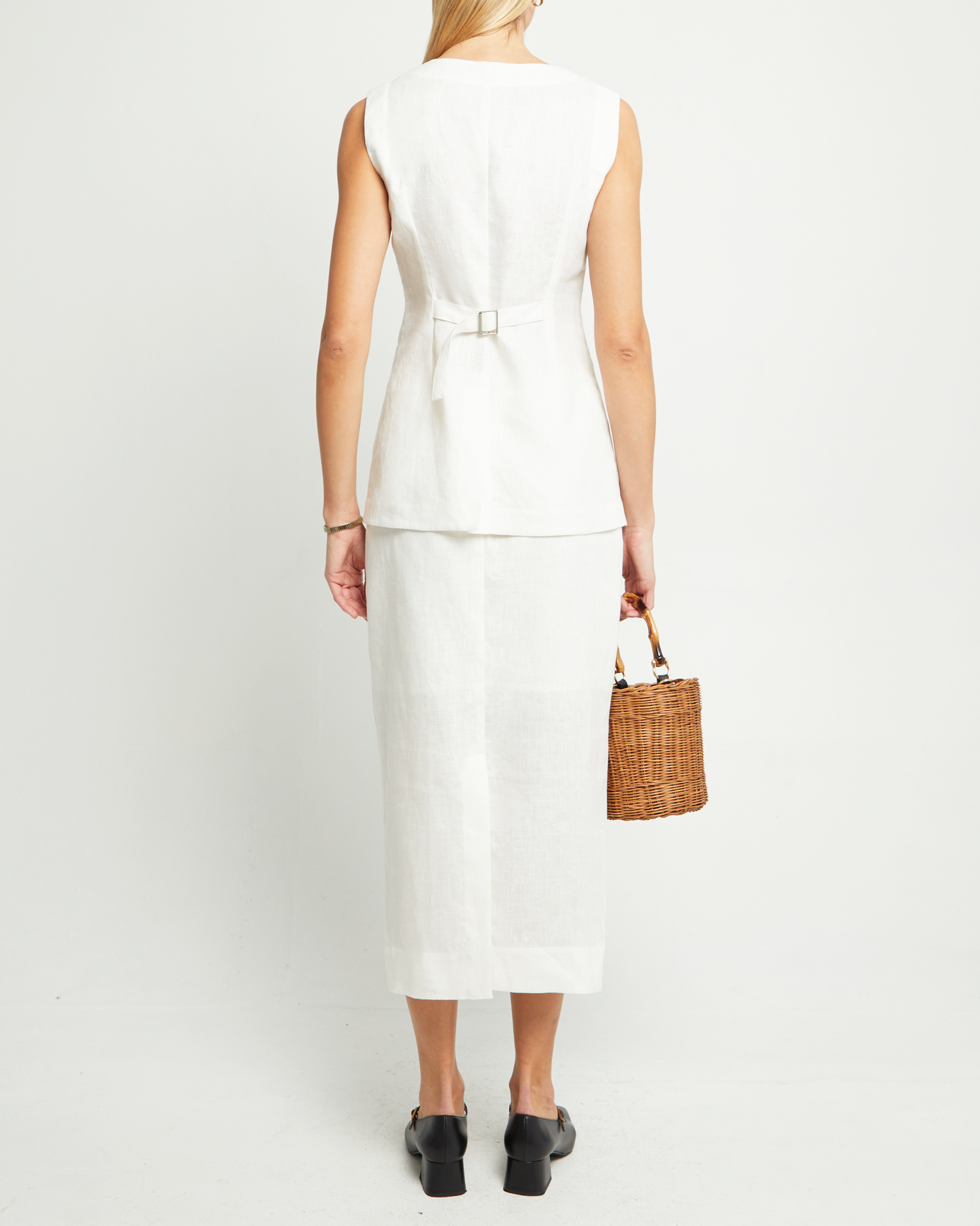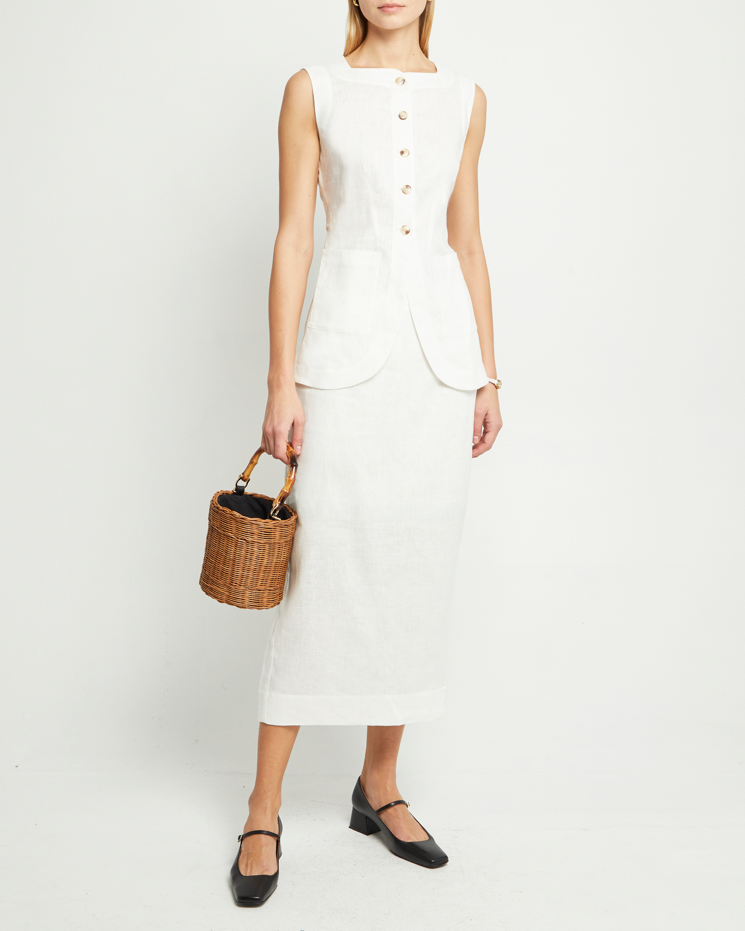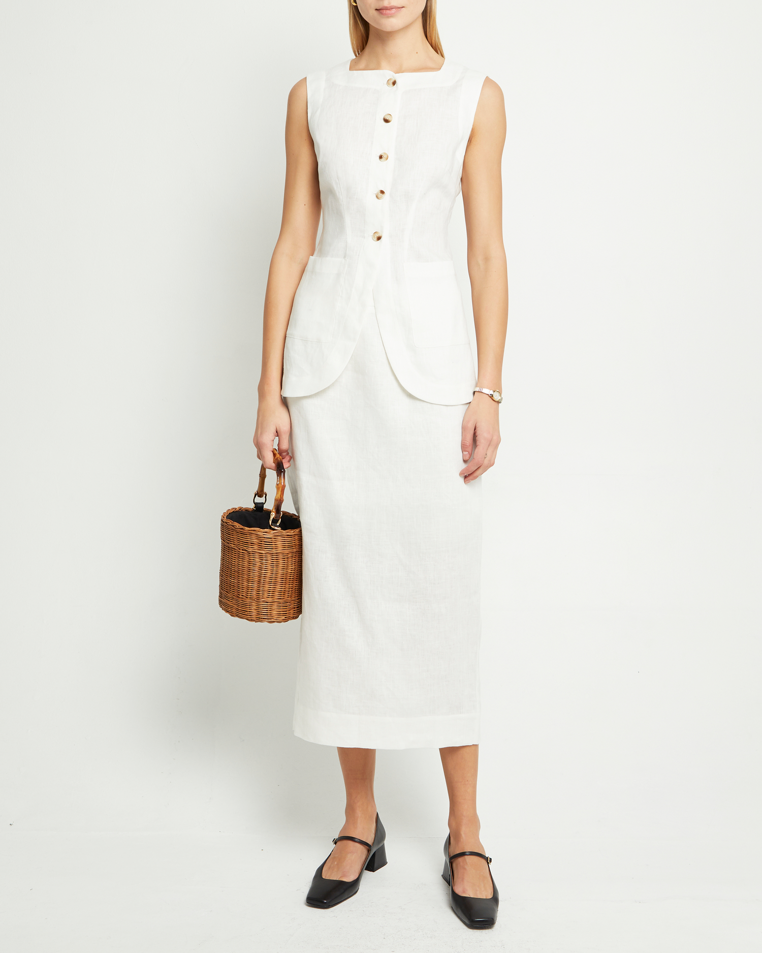 Effortlessly elegant, the Daniela Set is perfect for any occasion. Crafted from a crisp white linen blend, this set features a high neckline and front buttons for a timeless look. The pencil skirt and pocket details add practicality and sophistication. Elevate your wardrobe with this classic, versatile set.