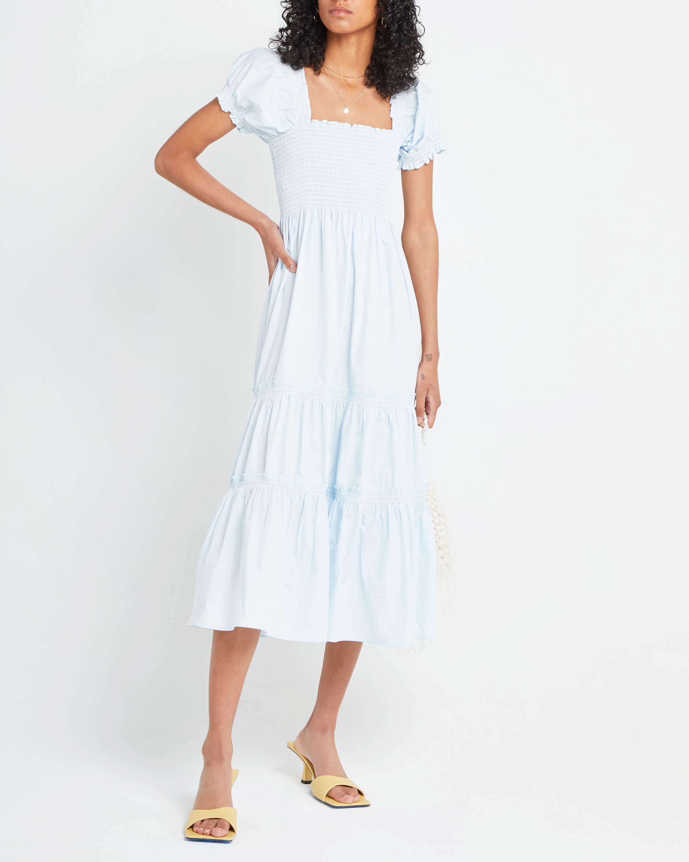 This easy tiered maxi dress has a smocked bodice and short puff sleeves. Done in 100% cotton for a light and airy feel.