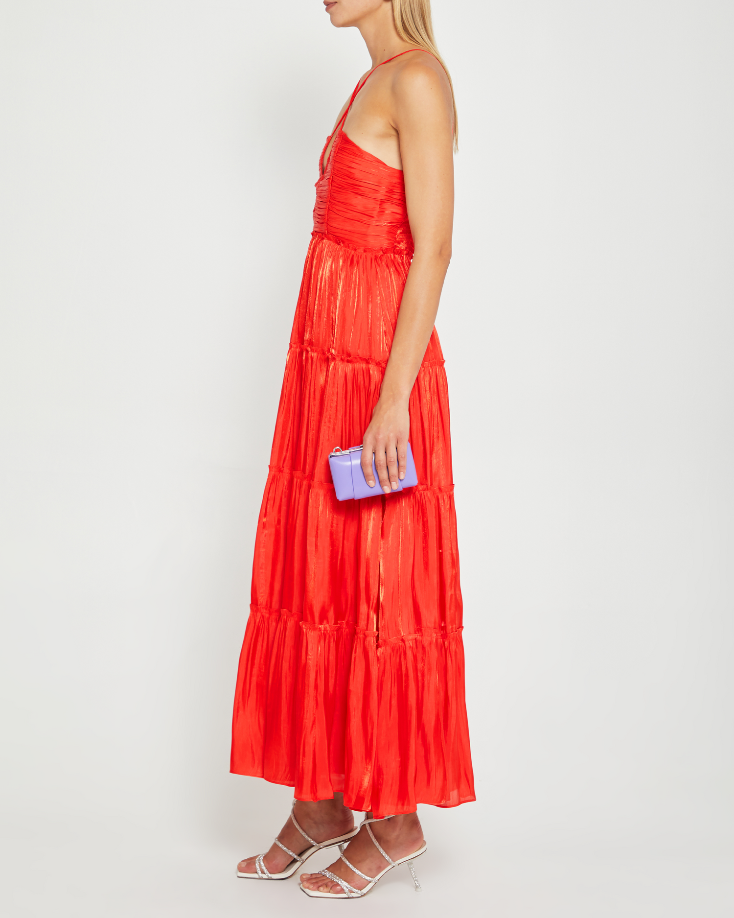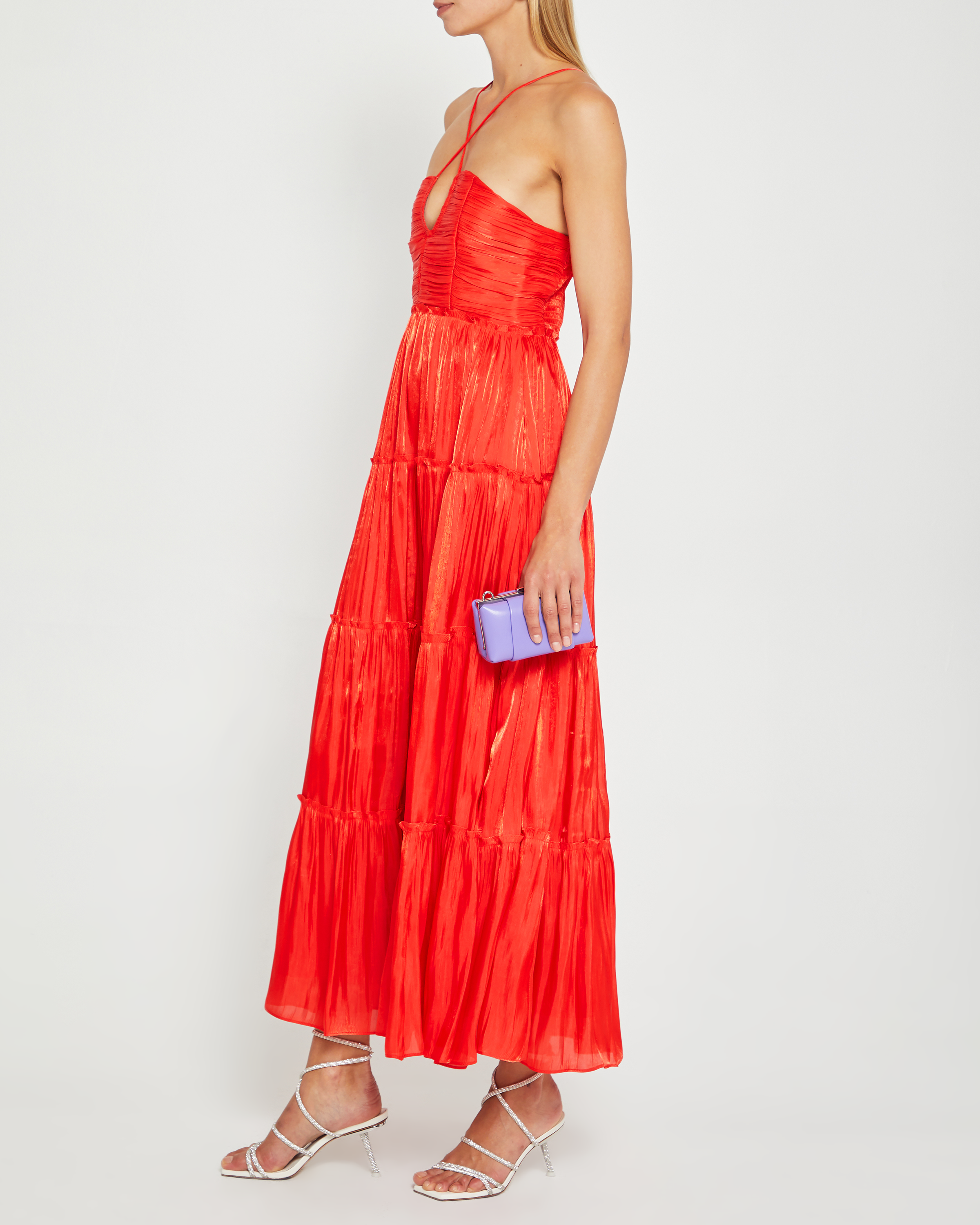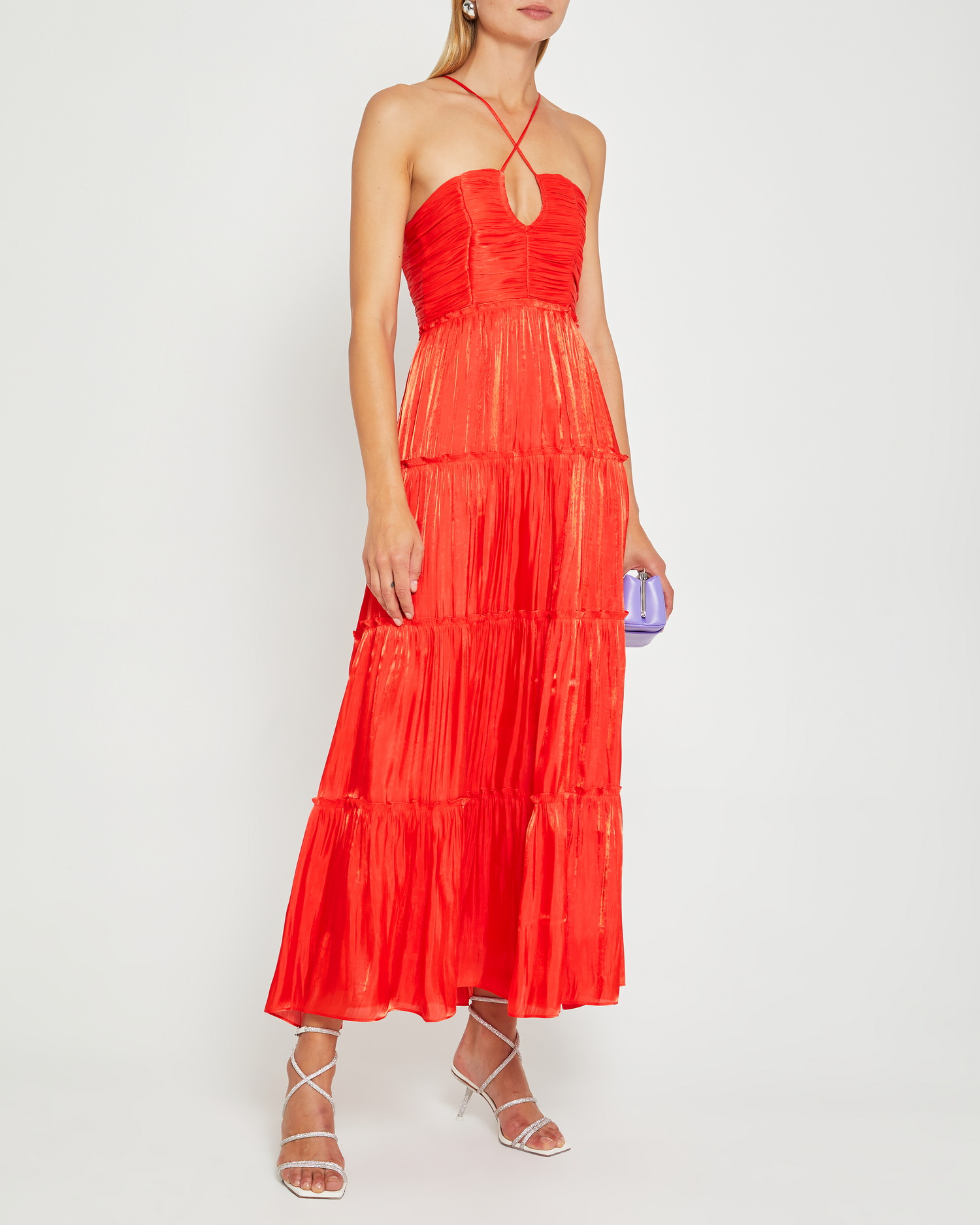 Done in an ethereal sheeny material, this dreamy dress is made with a floaty tiered skirt. Finished with an adjustable necktie for a delicate and functional detail.