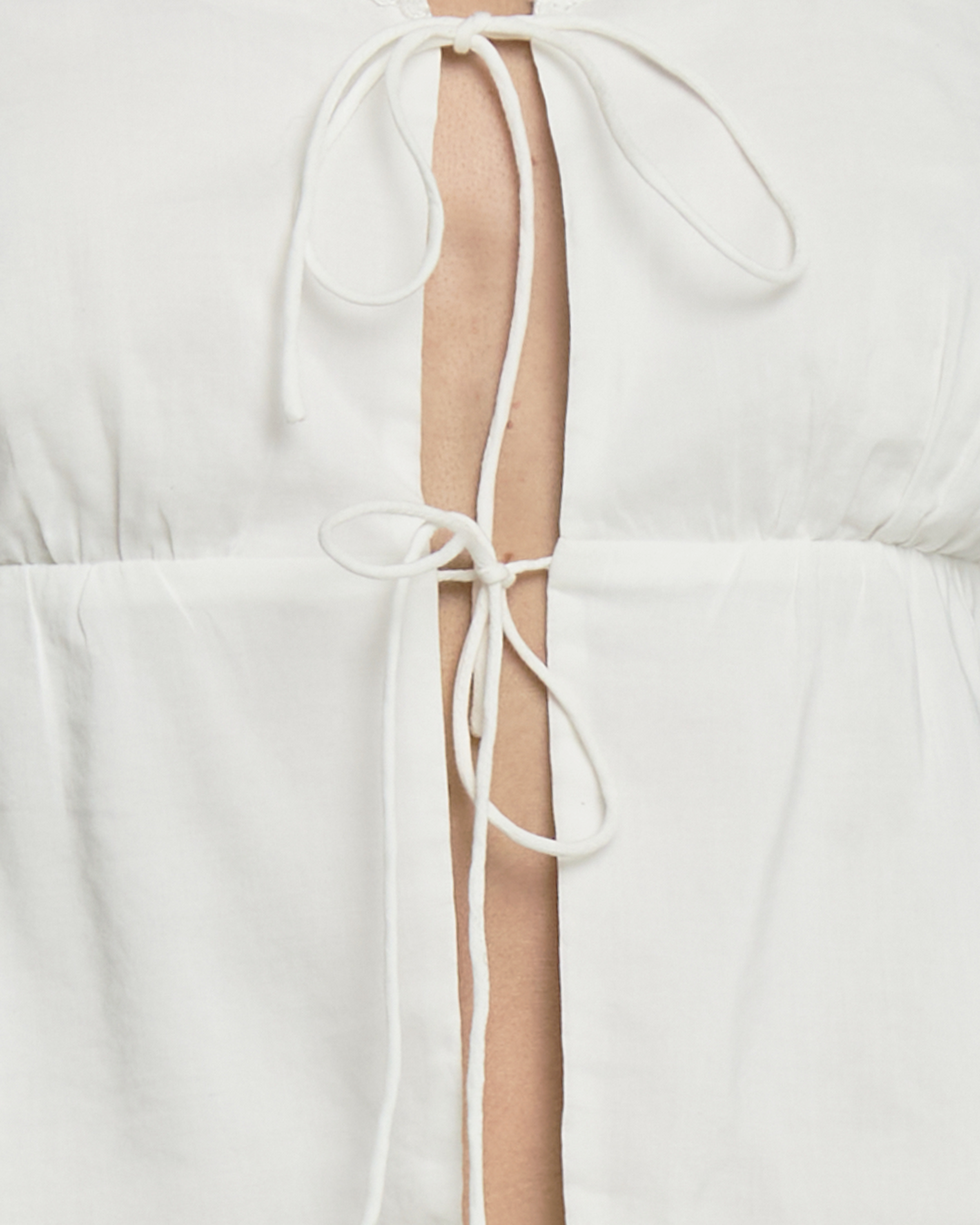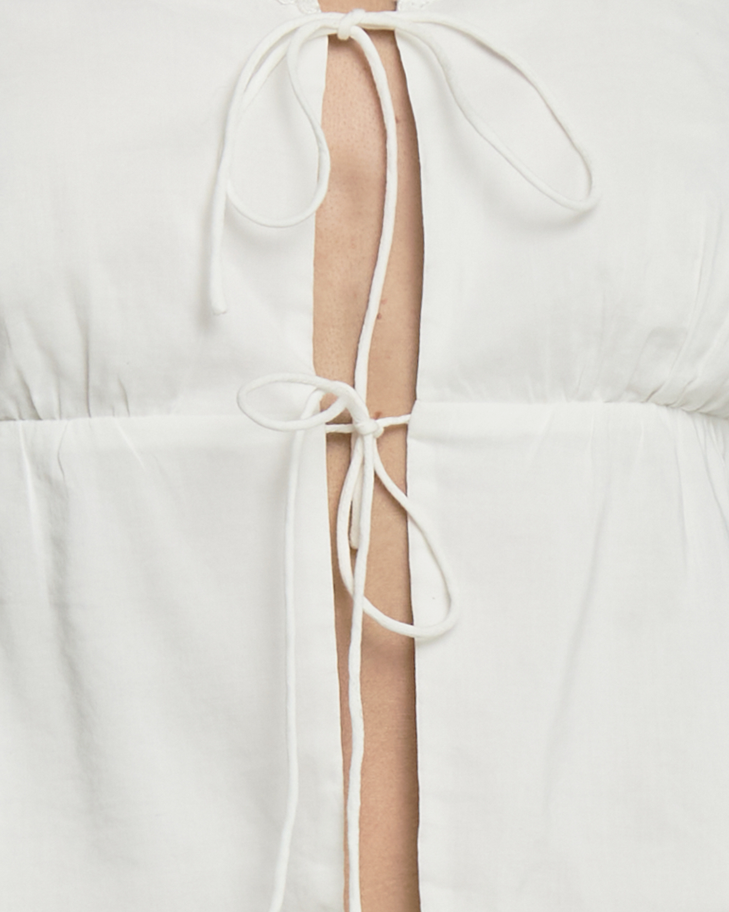 Featuring delicate lace lining and an open front with tie details, this top offers a relaxed fit that is both easy and adorable. Pair it with the matching shorts for a coordinated look, or wear it alone for a breezy and stylish outfit.