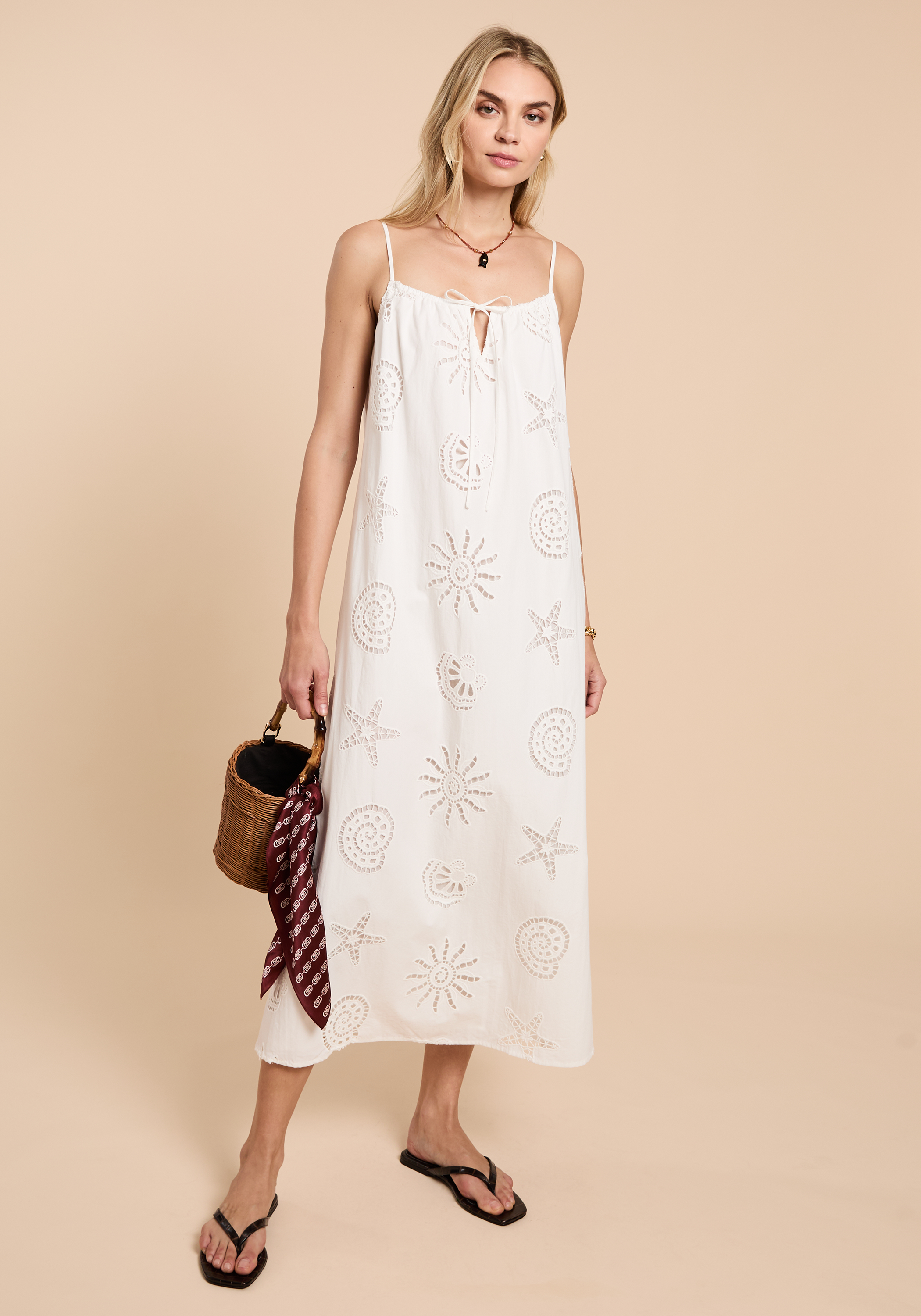 The Genevieve Cotton Dress offers a comfortable, relaxed fit crafted from fresh, summery white eyelet cotton. Featuring a delicate tie detail at the neck, this dress combines effortless style with breathable comfort, making it an ideal choice for warm-weather days.