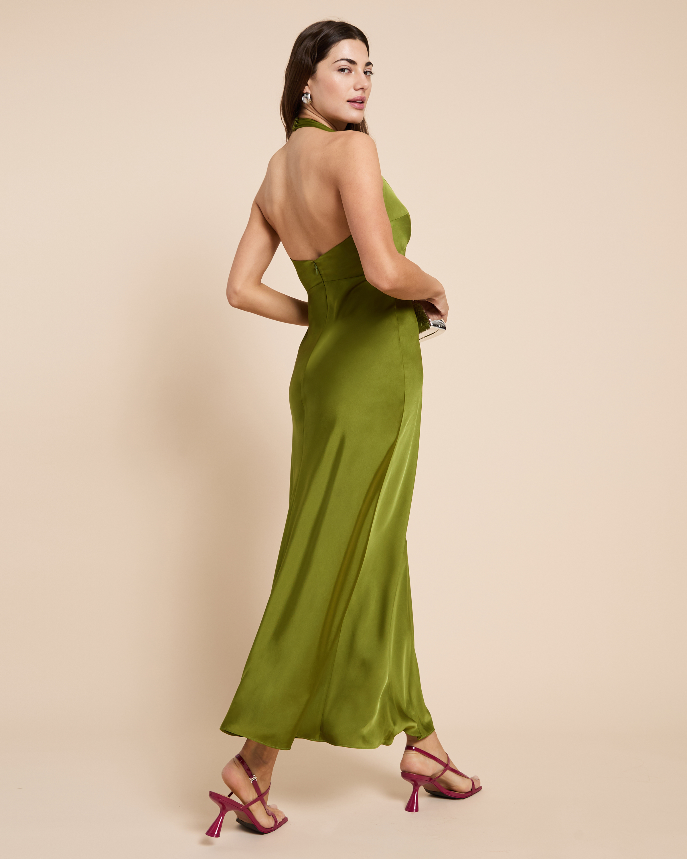 Experience effortless elegance with the Gisela Dress. The easy halter neck and luxurious silky material provide a chic design that exudes simple grace. Perfect for any occasion, this dress offers a touch of sophistication to your wardrobe.