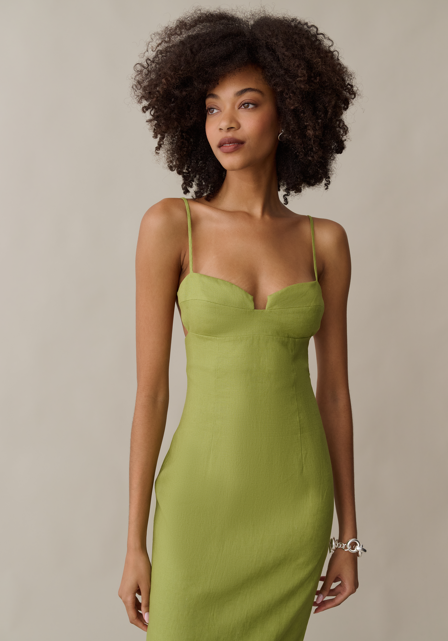 This streamlined linen midi dress is designed to contour to the body with a flattering, elongated silhouette. Featuring slender straps, a subtly sculpted neckline, and an open back with adjustable ties, it’s equal parts polished and undone for warm, sunlit days.