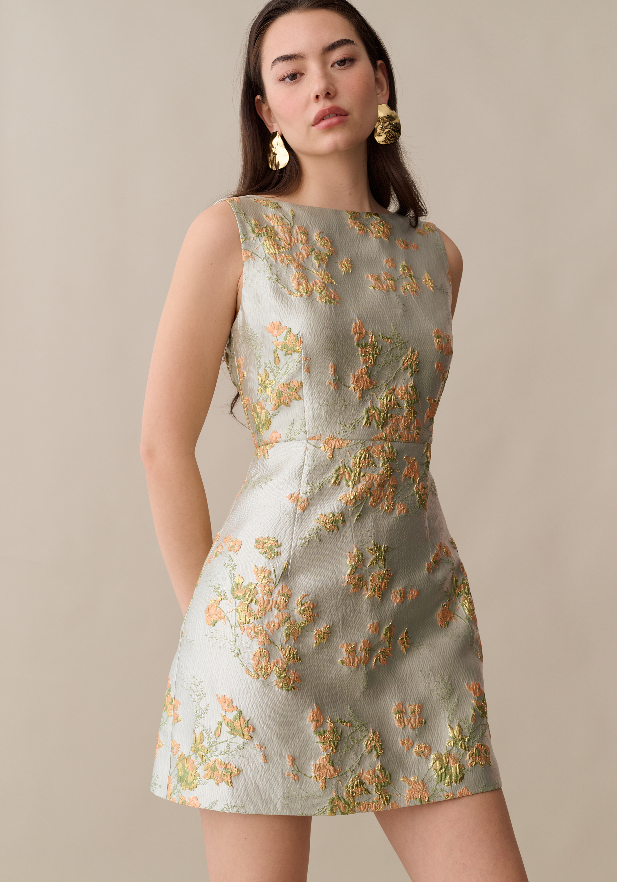 The Kayla Dress is the perfect balance of classic style and modern sophistication. Crafted from a gorgeous floral brocade with subtle shine, this mini dress features a simple, sleek silhouette for a timeless look.