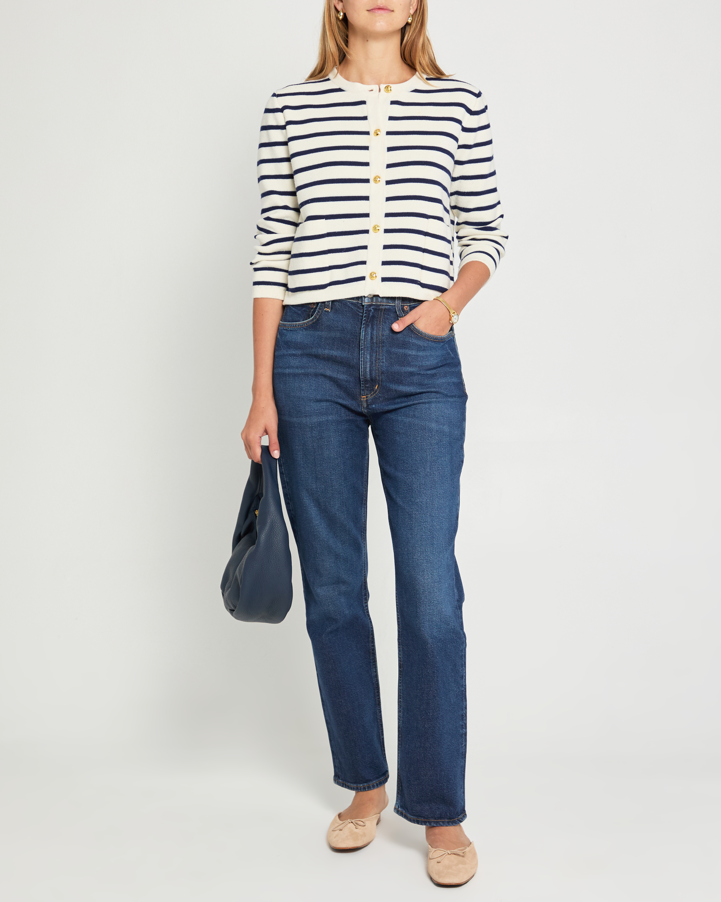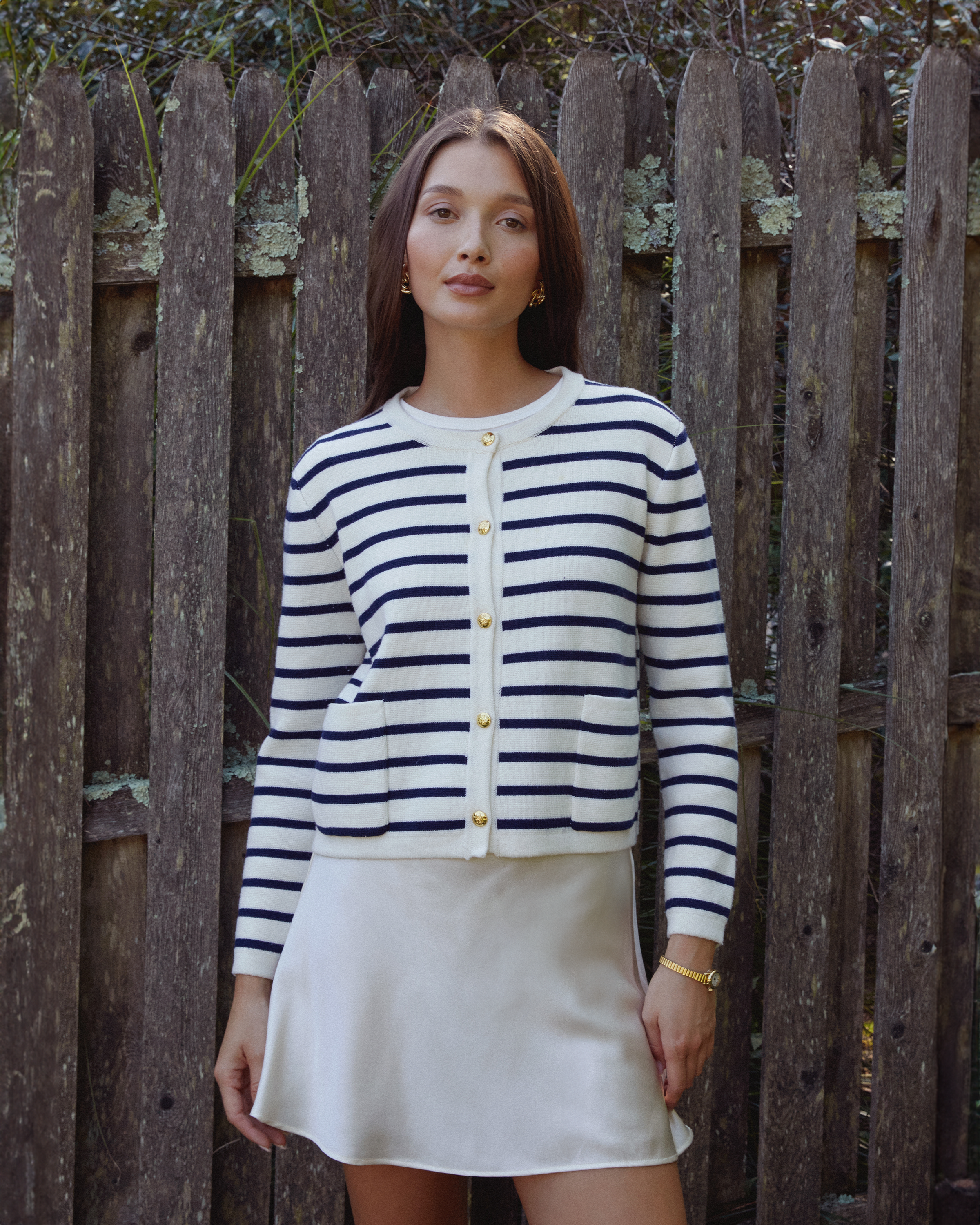 Achieve timeless style and cozy comfort with the Marceline Cardigan. This classic navy striped knit features luxurious gold buttons and a crewneck neckline. Made from a super soft knit, it's the perfect, chic light layer.