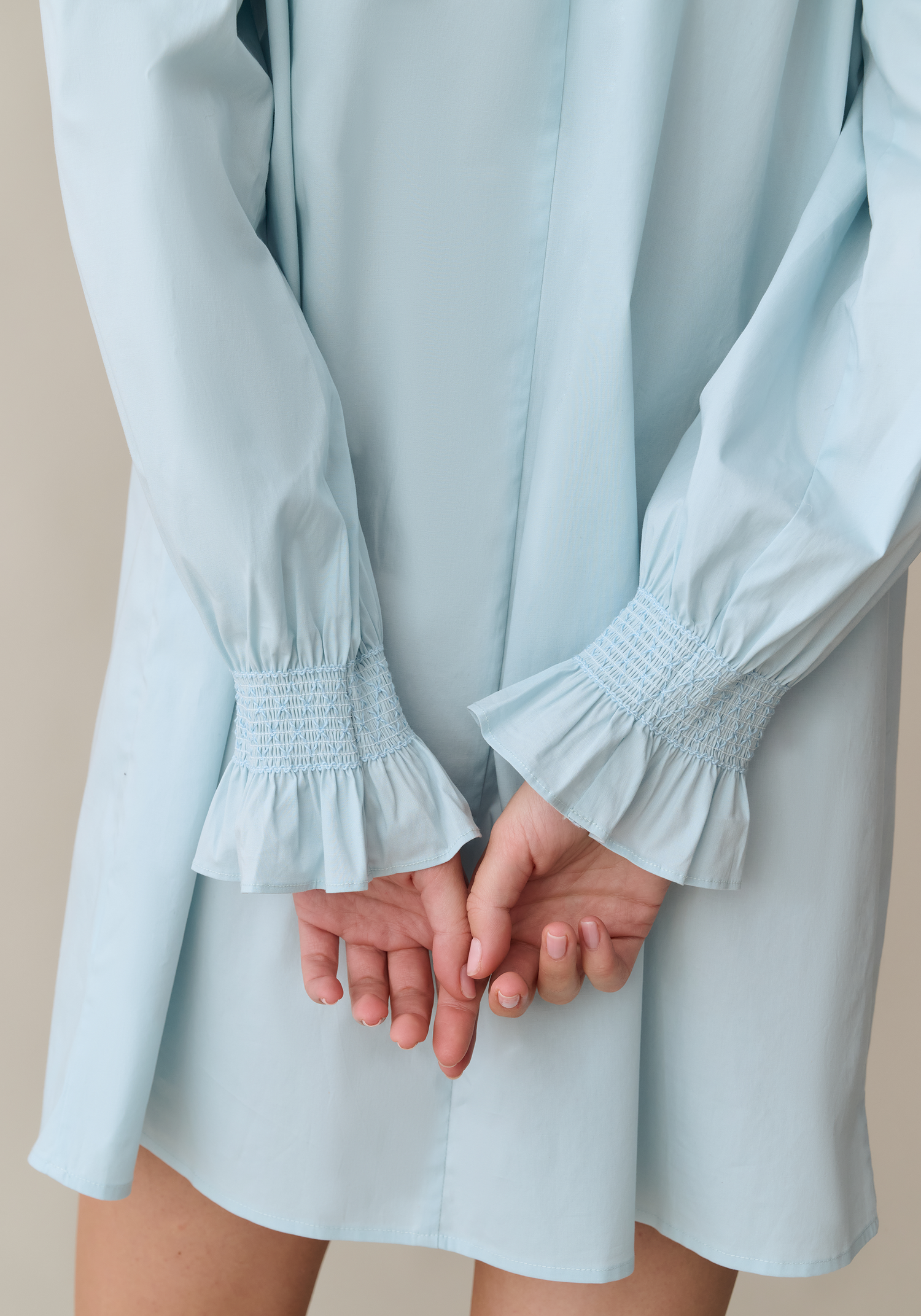 Designed with a gathered smock neckline and delicate ruffle trim, this mini dress offers a relaxed silhouette with an effortless feel. The smocked cuffs and long, airy sleeves add a touch of feminine structure to its comfortable, shift-inspired shape.